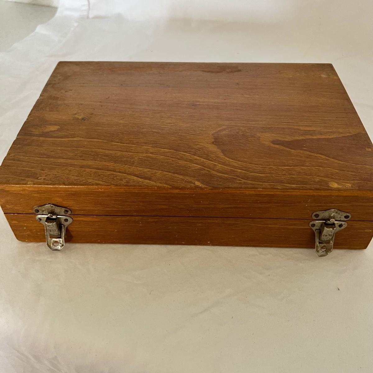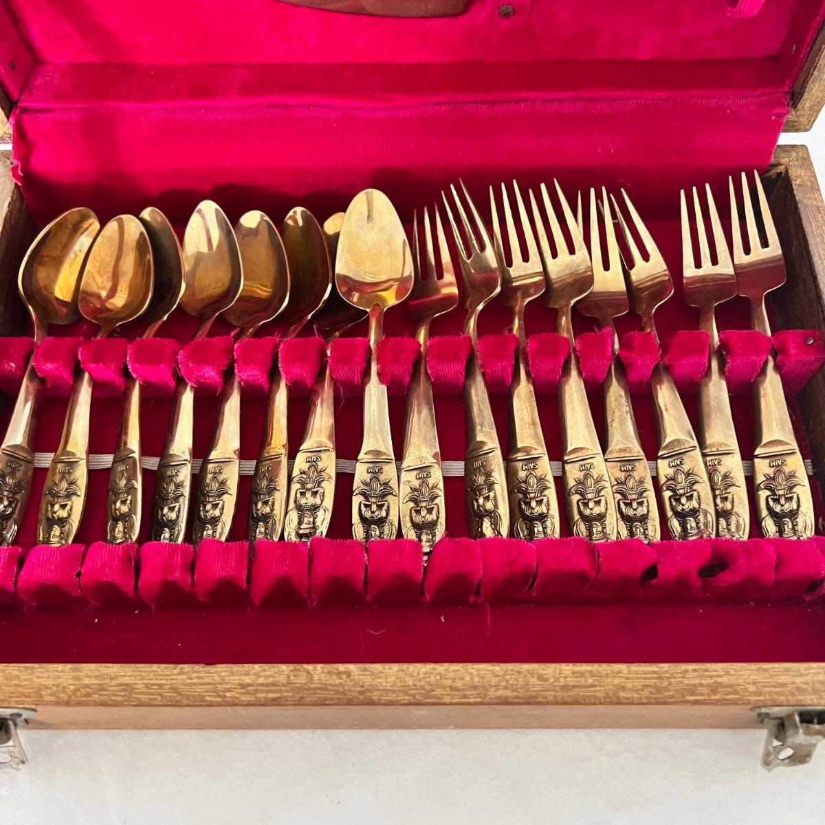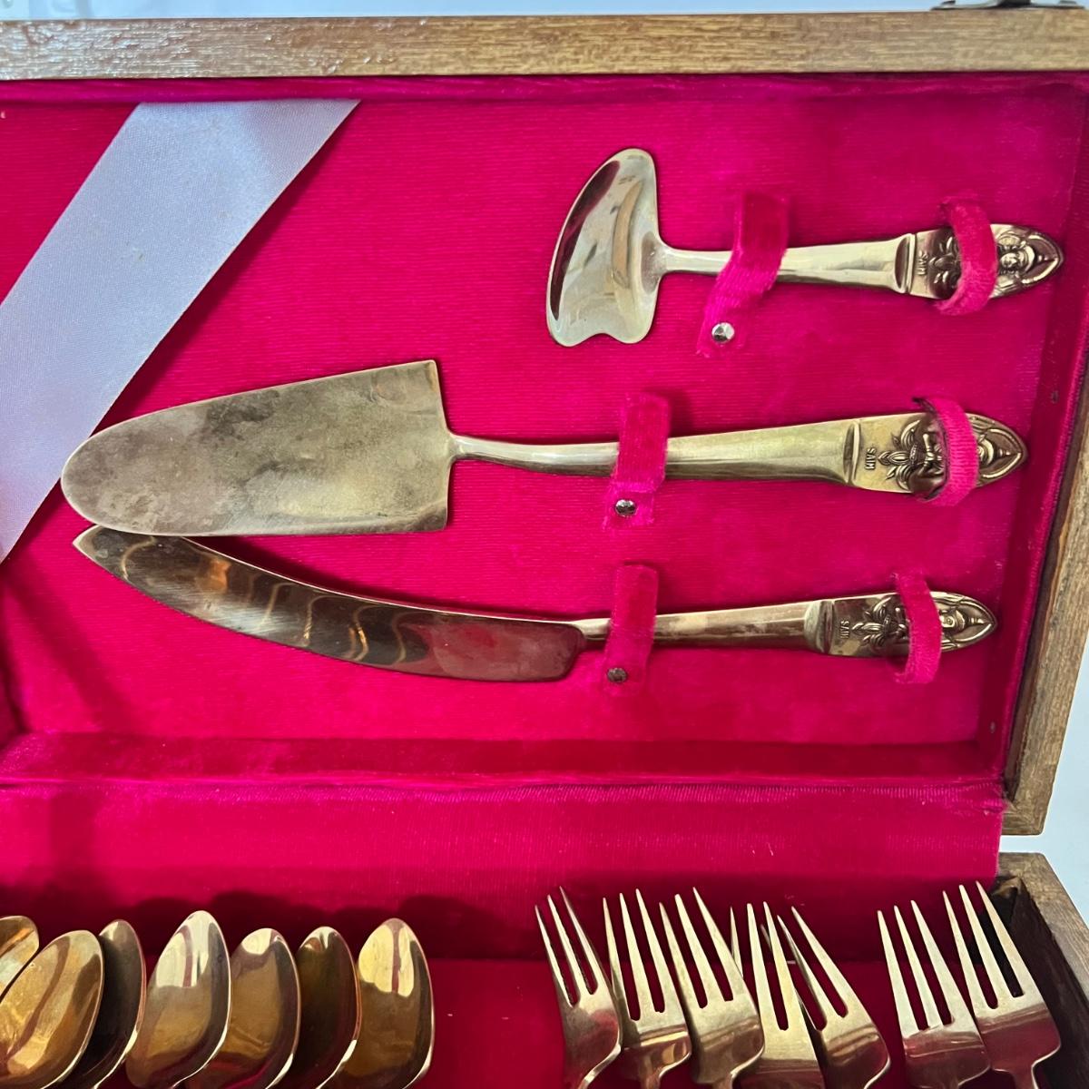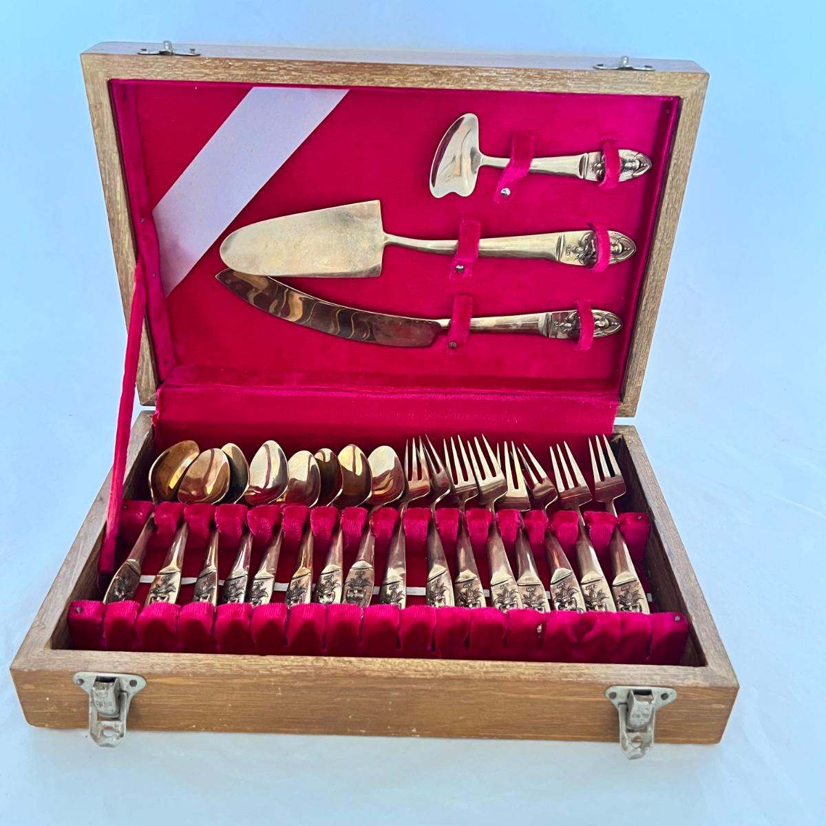 A set of eight dessert forks and eight dessert spoons along with serving utensils. This appears to be nickel bronze flatware, but cannot confirm; there are no identifying marks on any items. The forks are 5.5” long and the spoons are also 5.5” long. The serving utensils range from 4.5” - 9” long. Wood case is included.