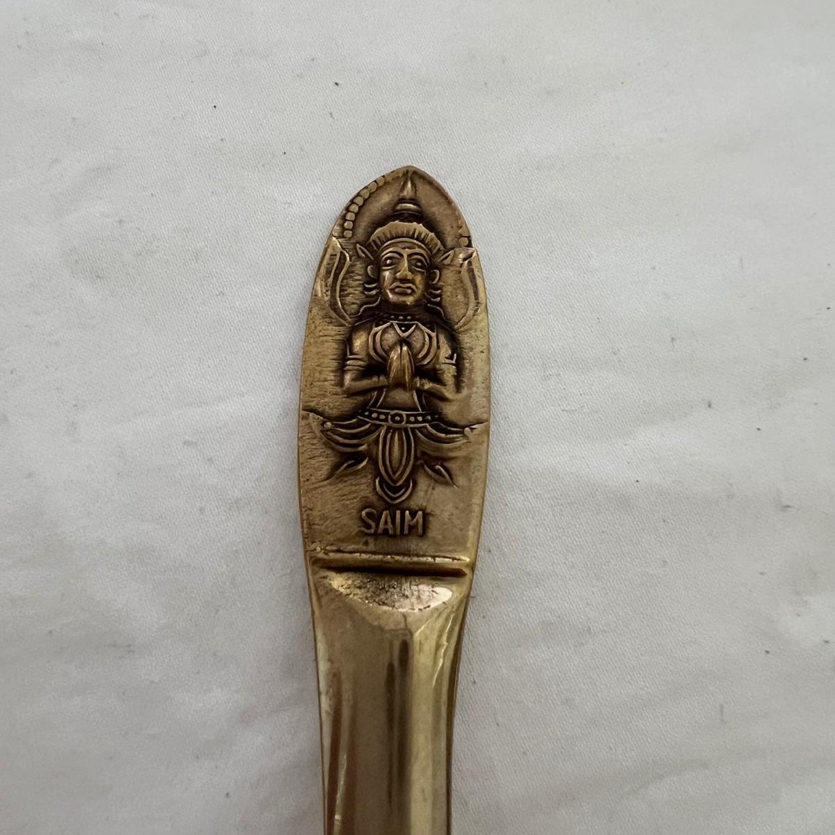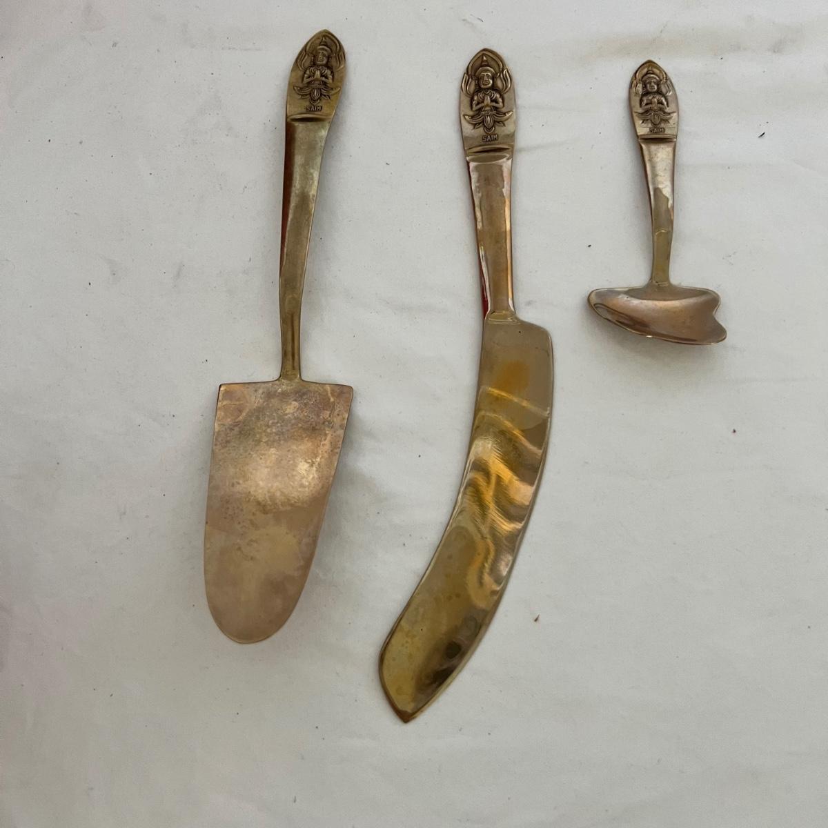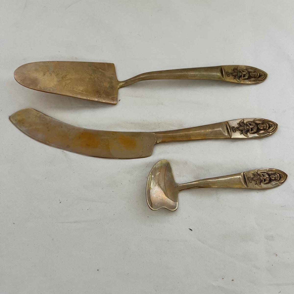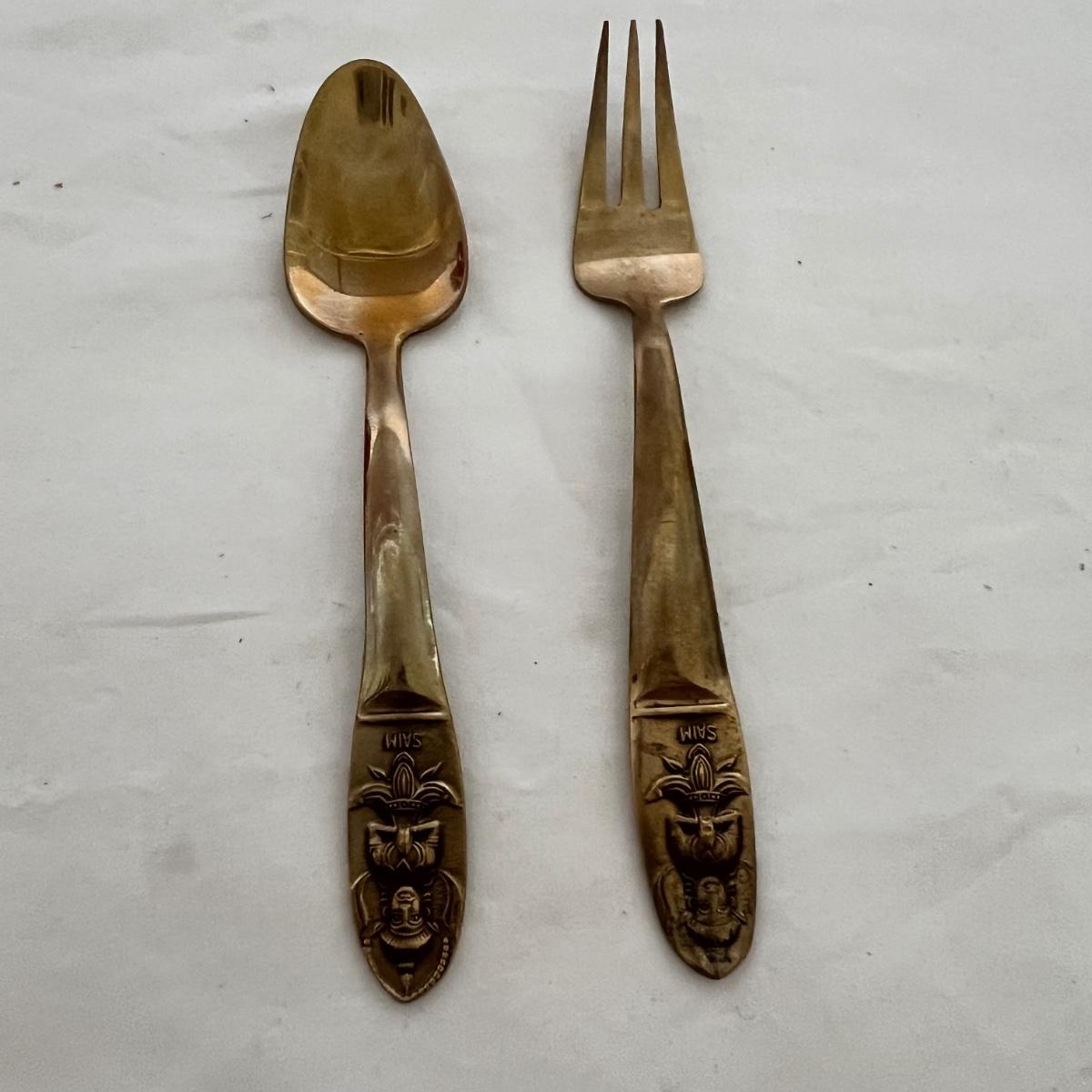 A set of eight dessert forks and eight dessert spoons along with serving utensils. This appears to be nickel bronze flatware, but cannot confirm; there are no identifying marks on any items. The forks are 5.5” long and the spoons are also 5.5” long. The serving utensils range from 4.5” - 9” long. Wood case is included.