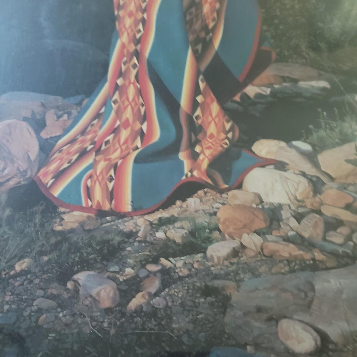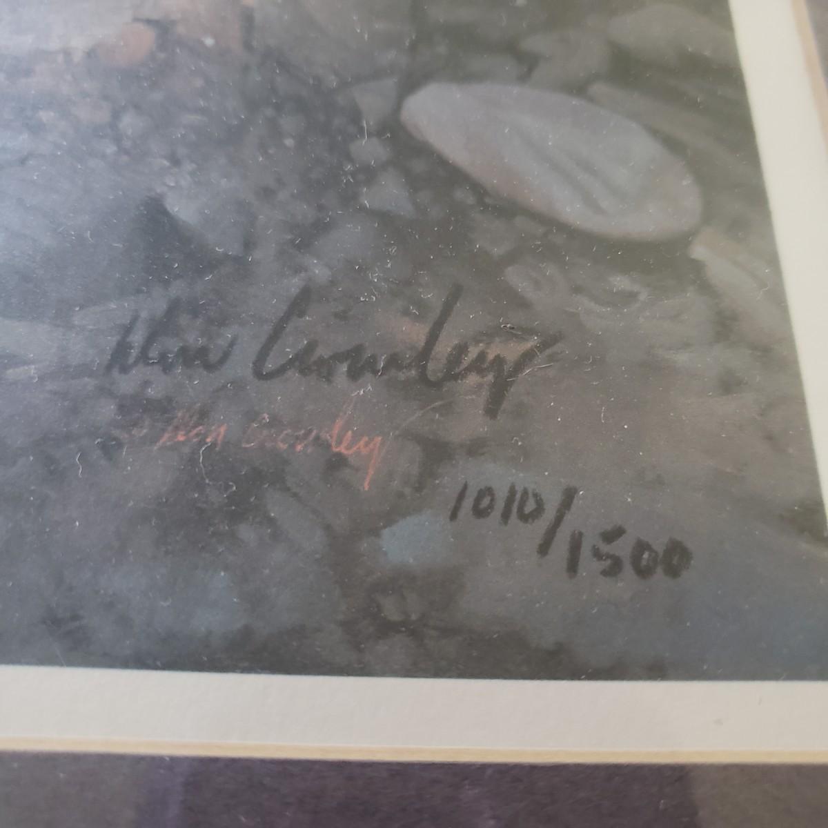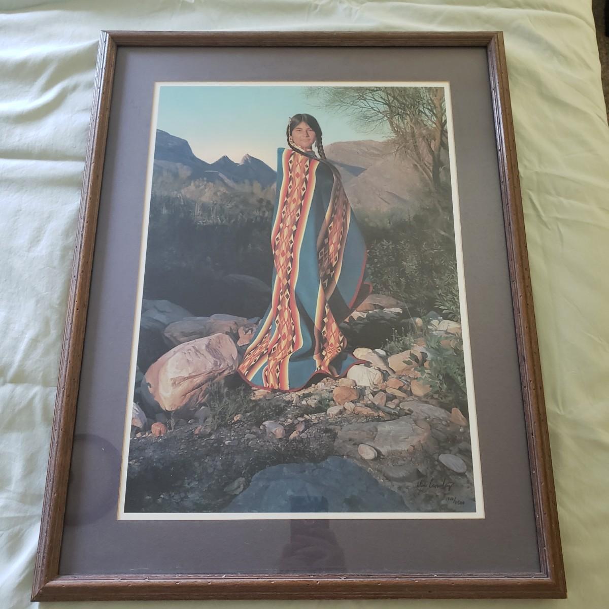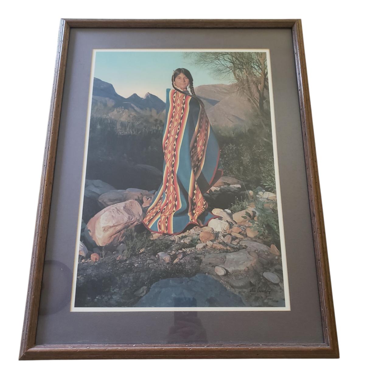 This is a signed print titled "Desert Sunset" by Donald Crowley. The wooden frame behind glass measures 23" x 30". This print is numbered 1010/1500.