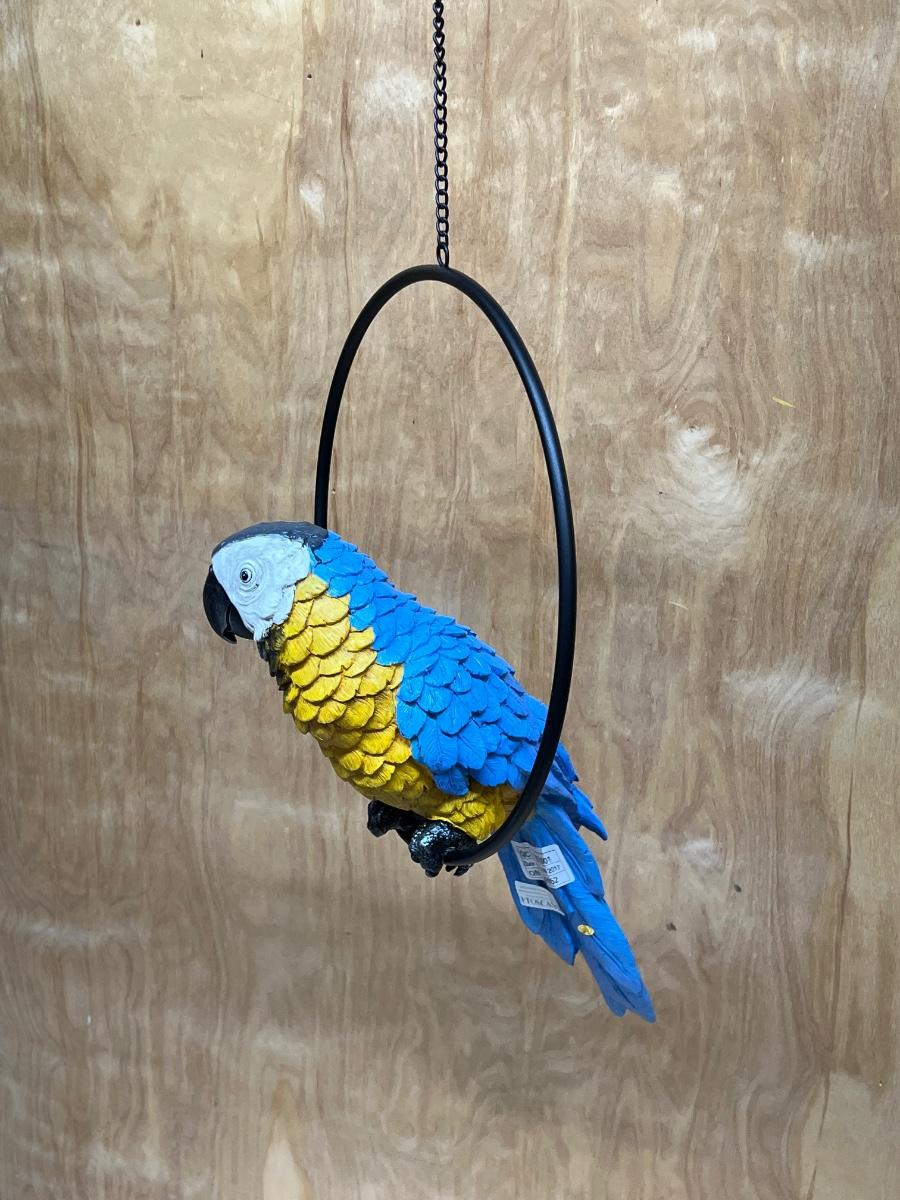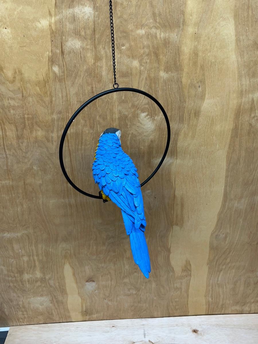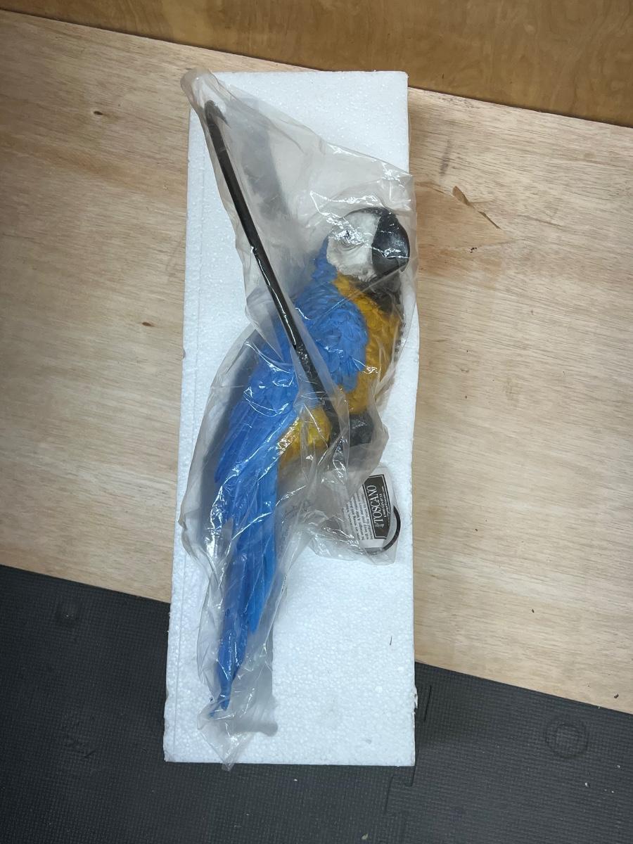 New ~ Never been used ~ Macaw is made of a resin type material ~ Ring & chain are metal ~ Top of ring to end of bird tail = 20” H x 12.5” Round x 12” D ~ Chain = 21” Long ~ Total length from top of chain to end of bird tail = 41”