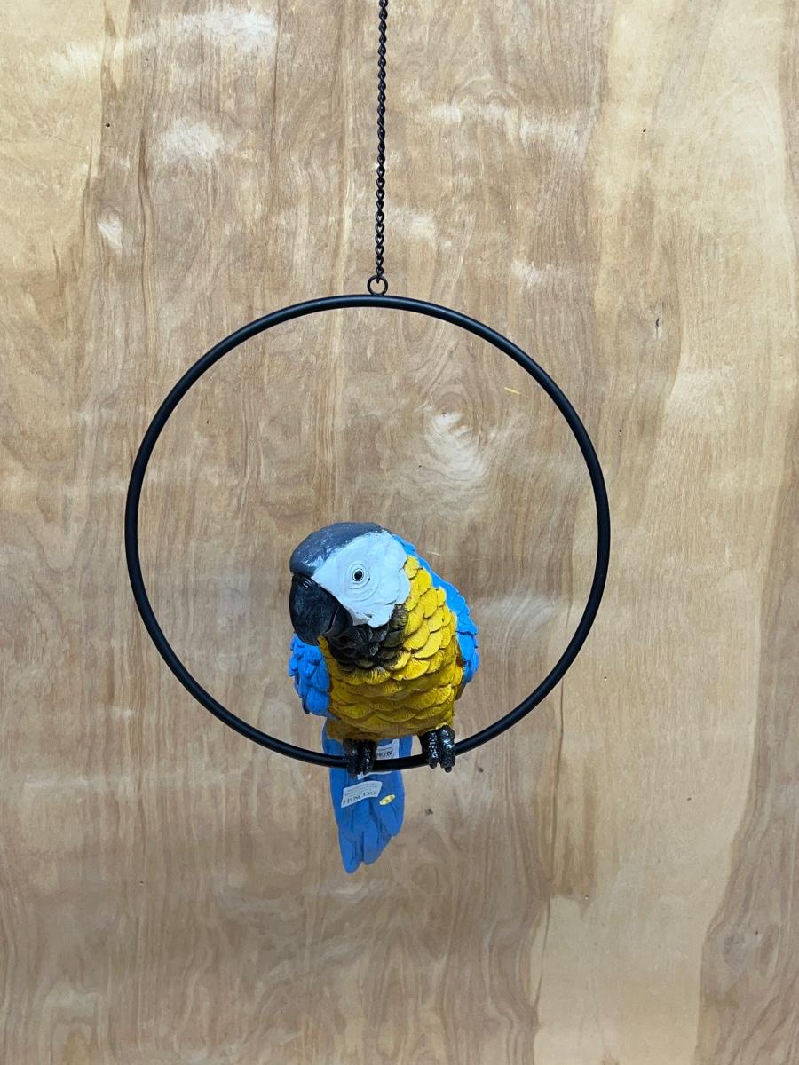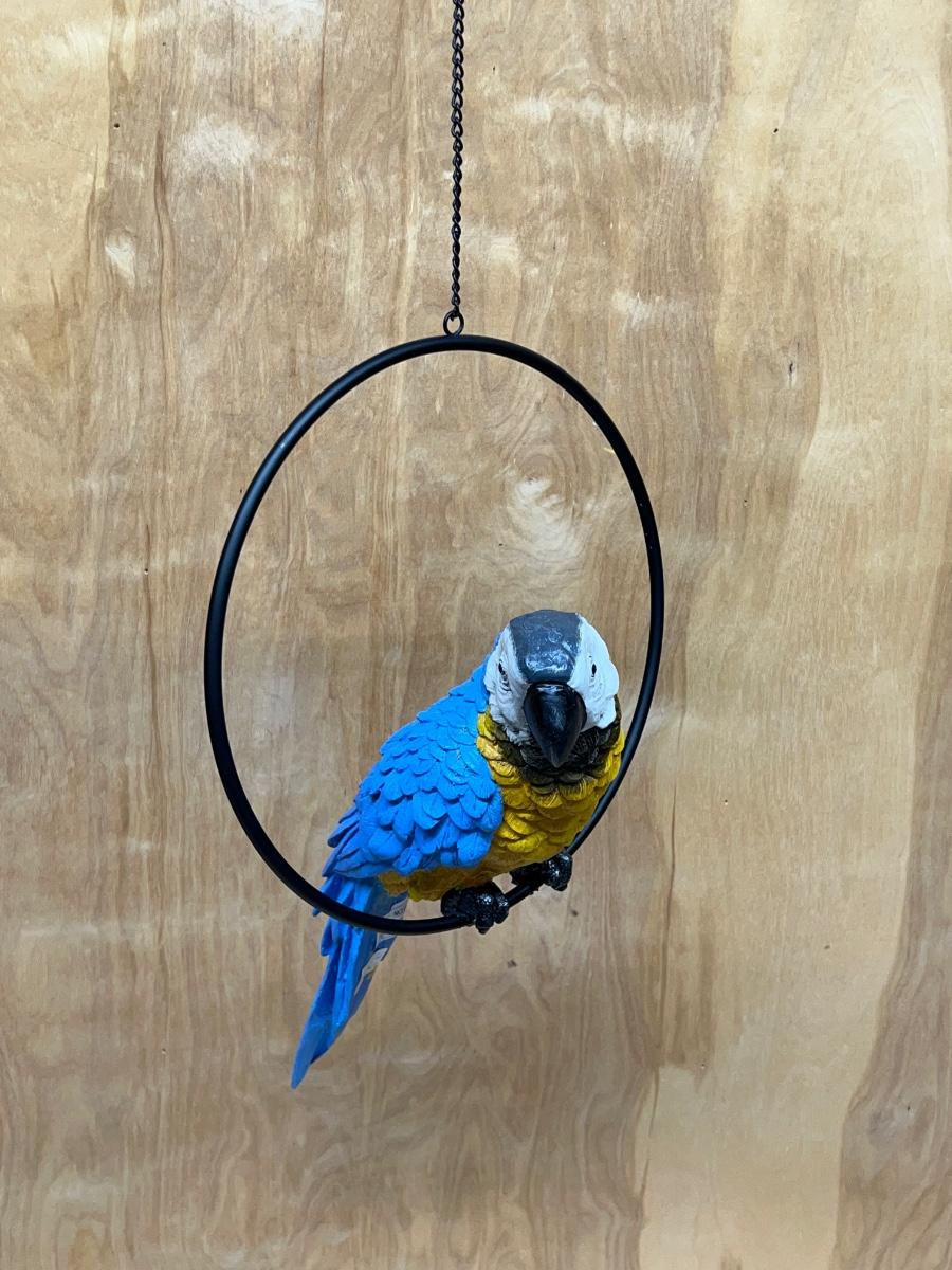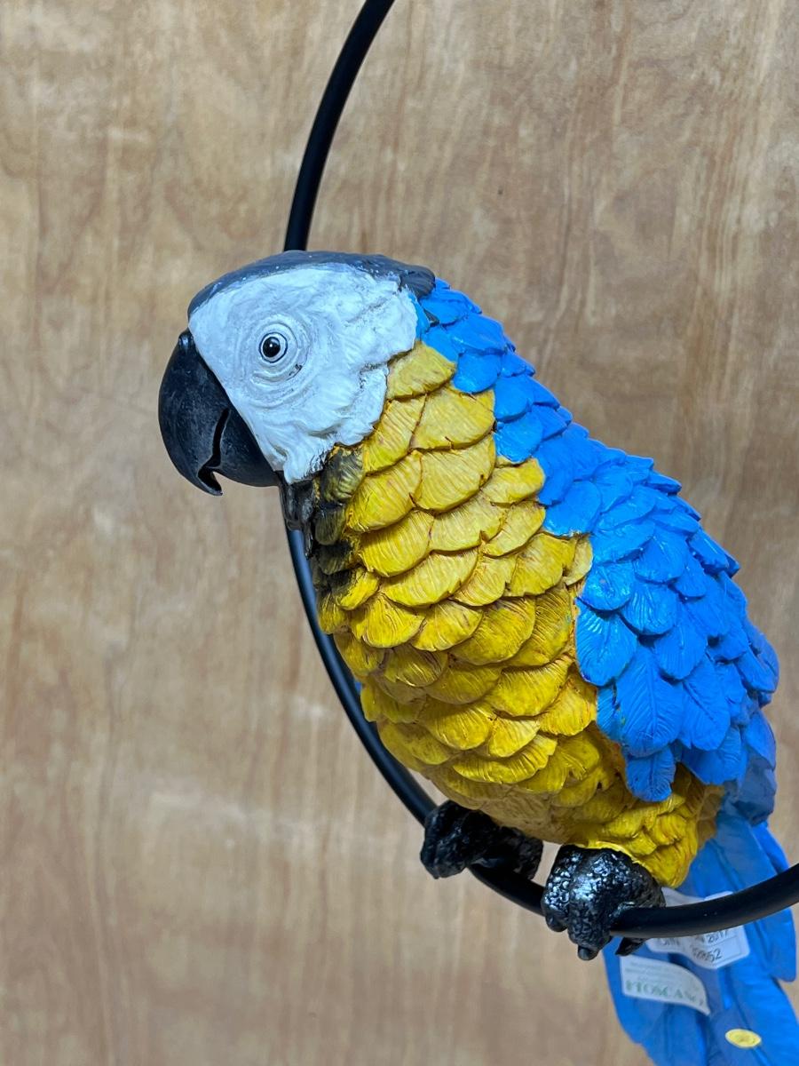 New ~ Never been used ~ Macaw is made of a resin type material ~ Ring & chain are metal ~ Top of ring to end of bird tail = 20” H x 12.5” Round x 12” D ~ Chain = 21” Long ~ Total length from top of chain to end of bird tail = 41”