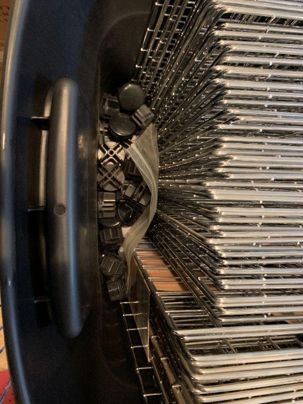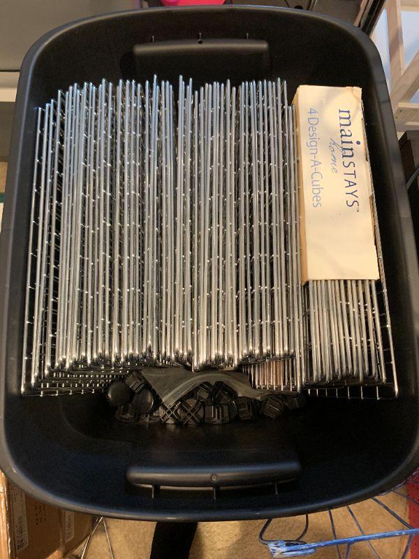 Tons of metal slots and plastic connectors for making various size and shape cube storage. Includes tote.