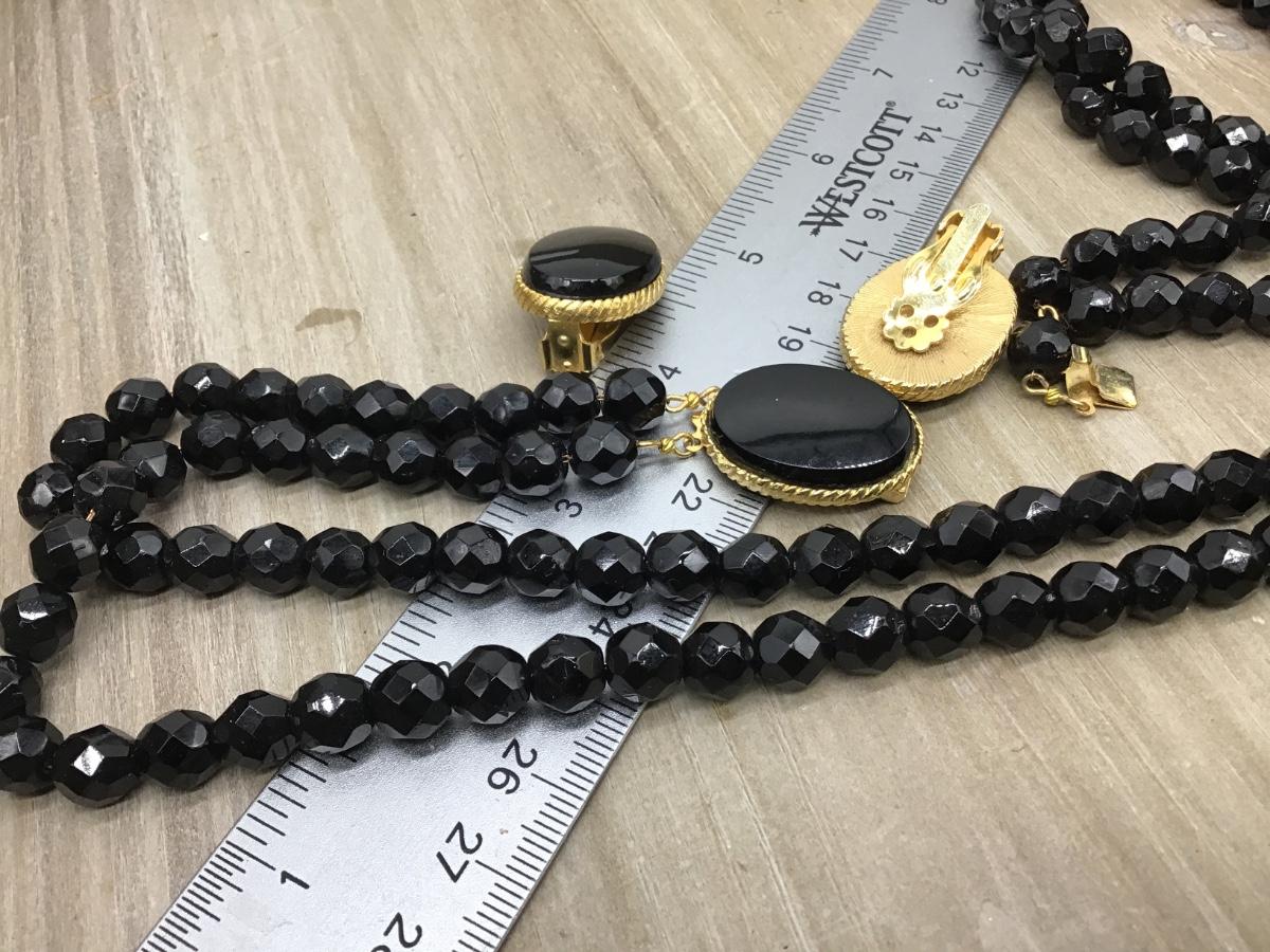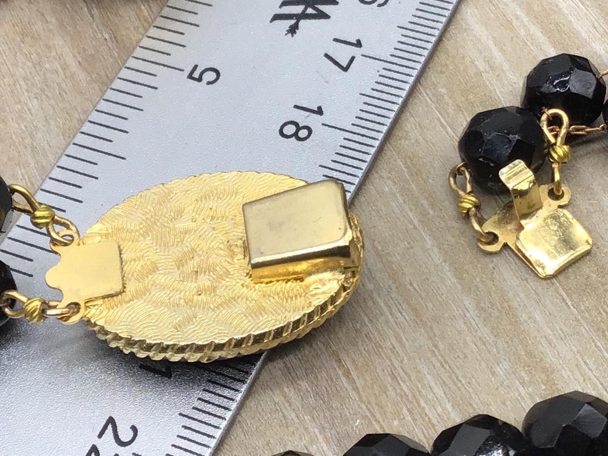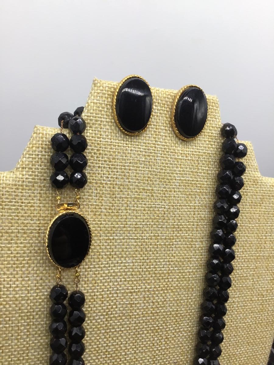 Designer Faceted Black Necklace With Fancy Gold Tone Beautiful Clasp Matching Glass Earrings
