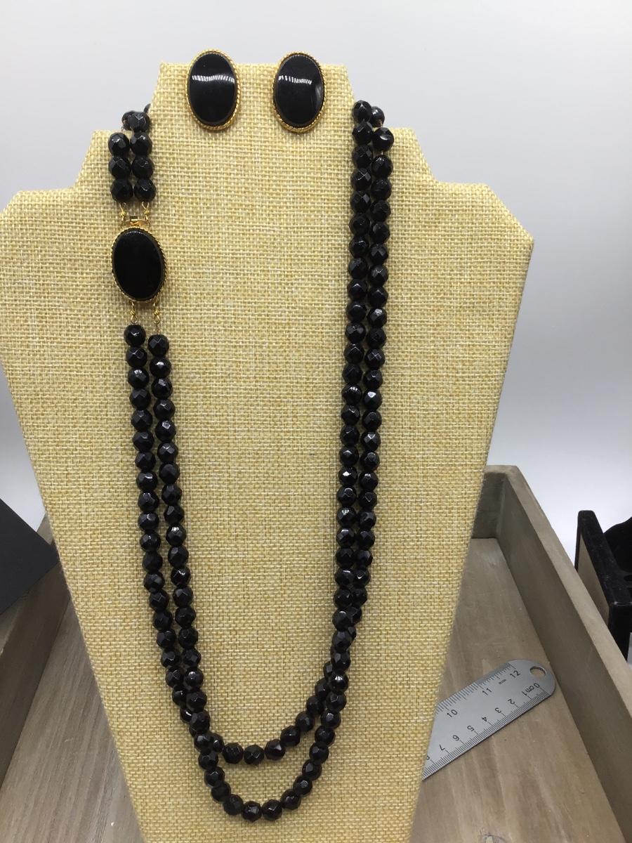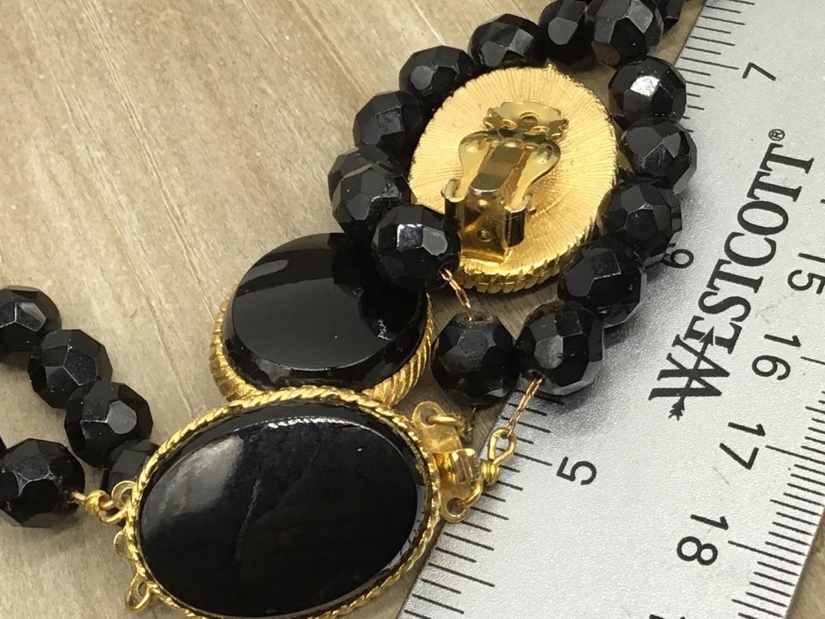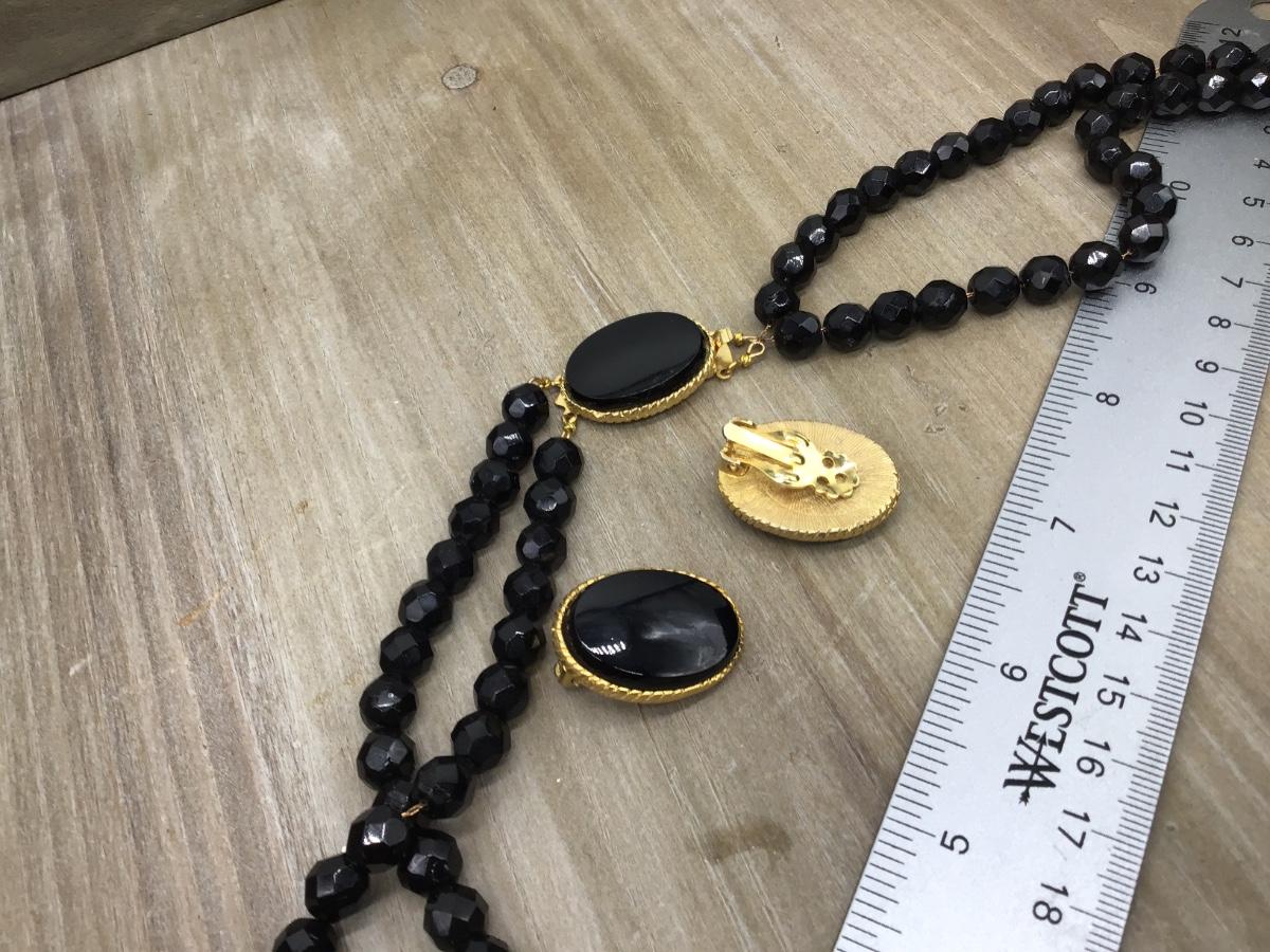 Designer Faceted Black Necklace With Fancy Gold Tone Beautiful Clasp Matching Glass Earrings
