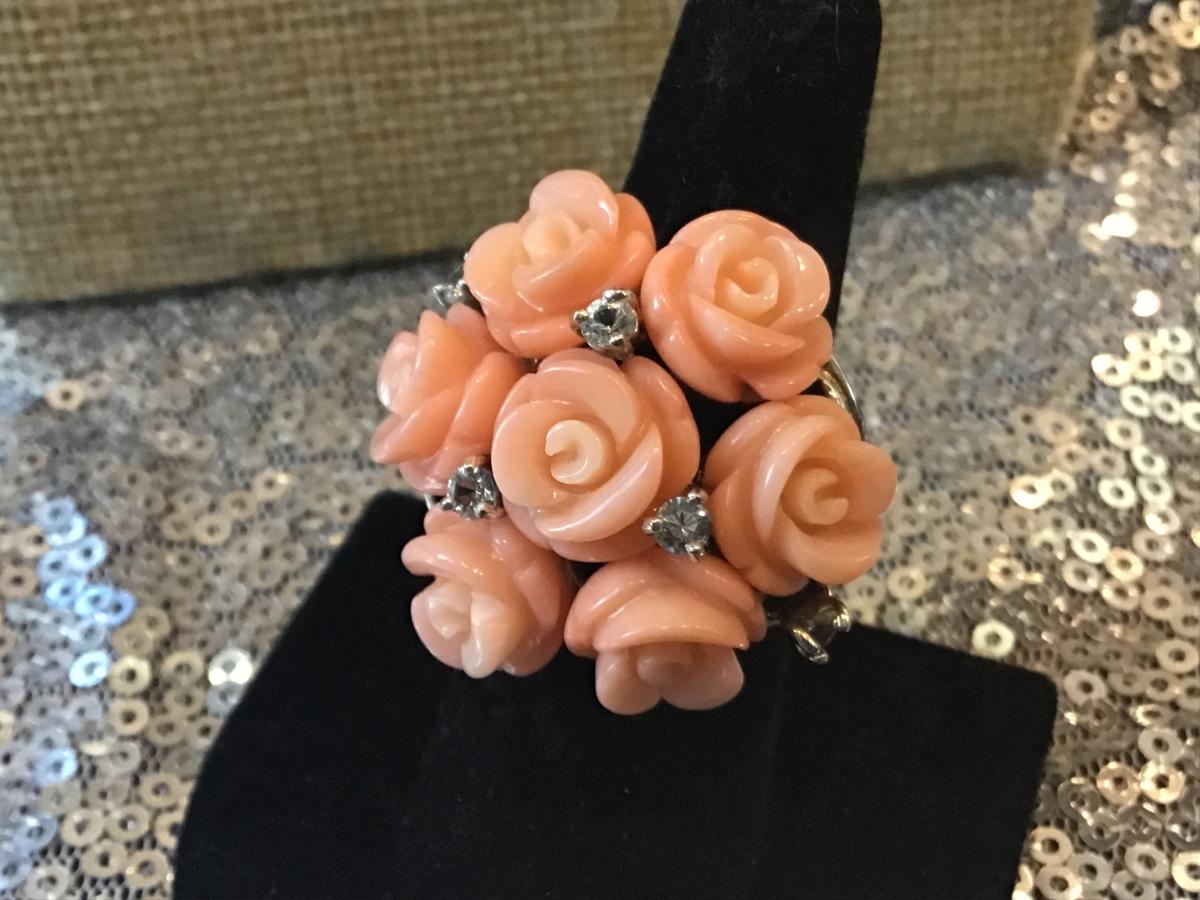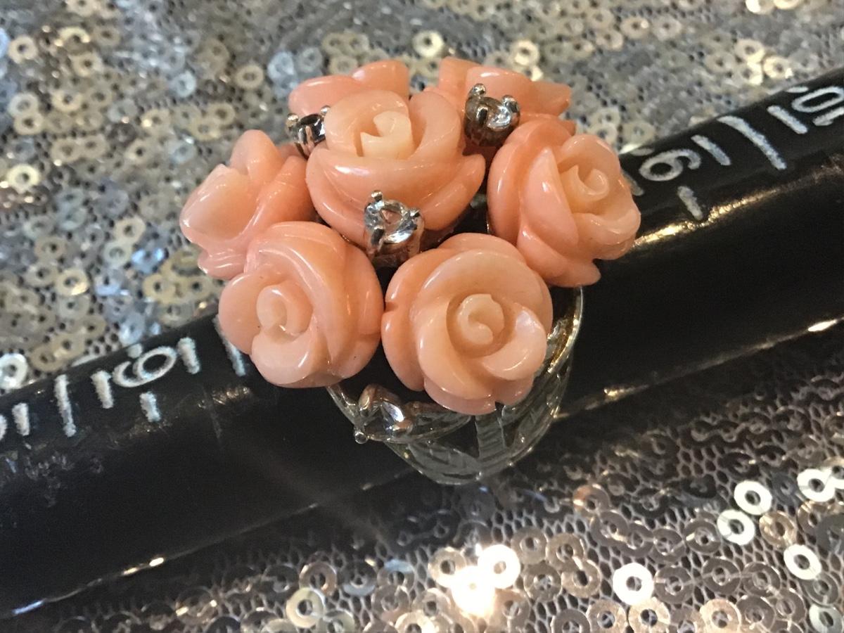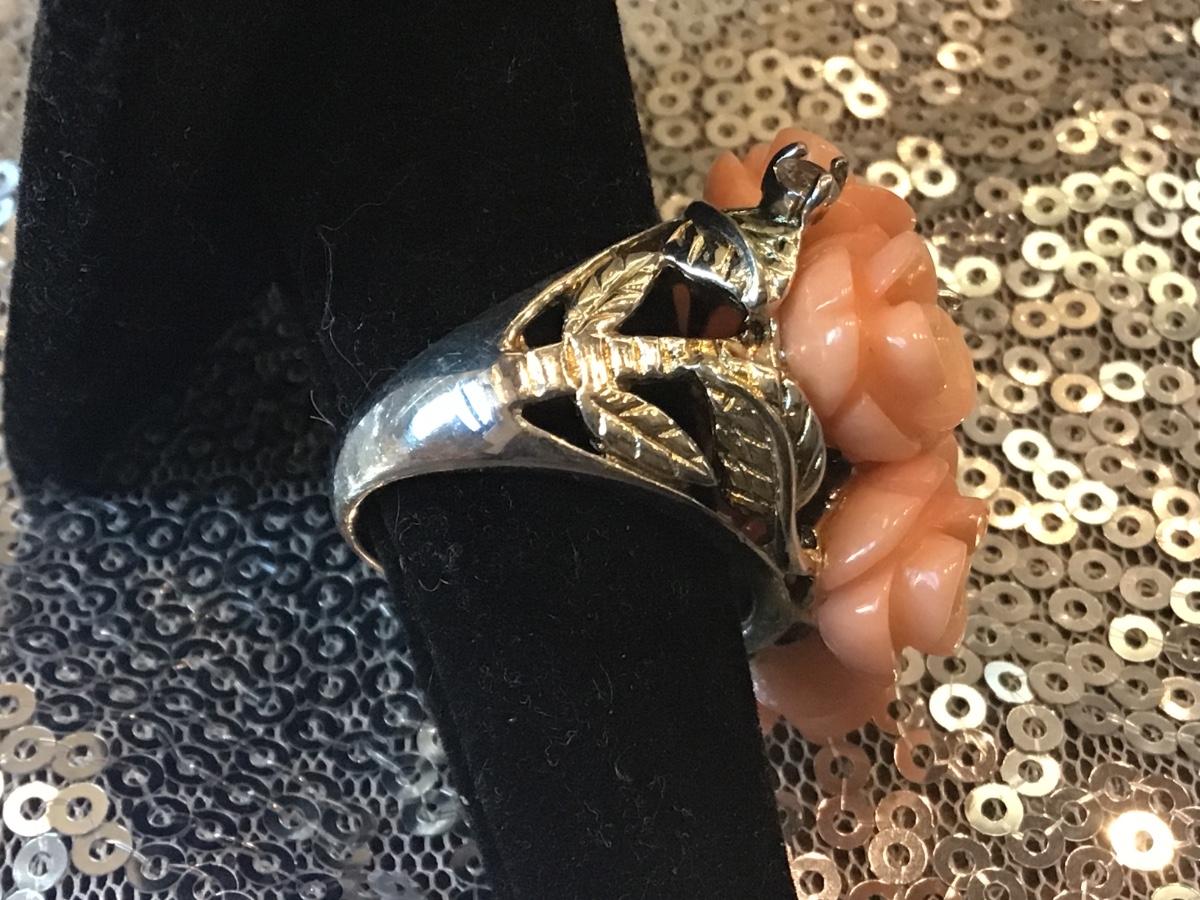 925 Silver Designer GSJ Carved Salmon Coral ROSE BOUQUET Sterling Silver 925 Floral Ring 7.5