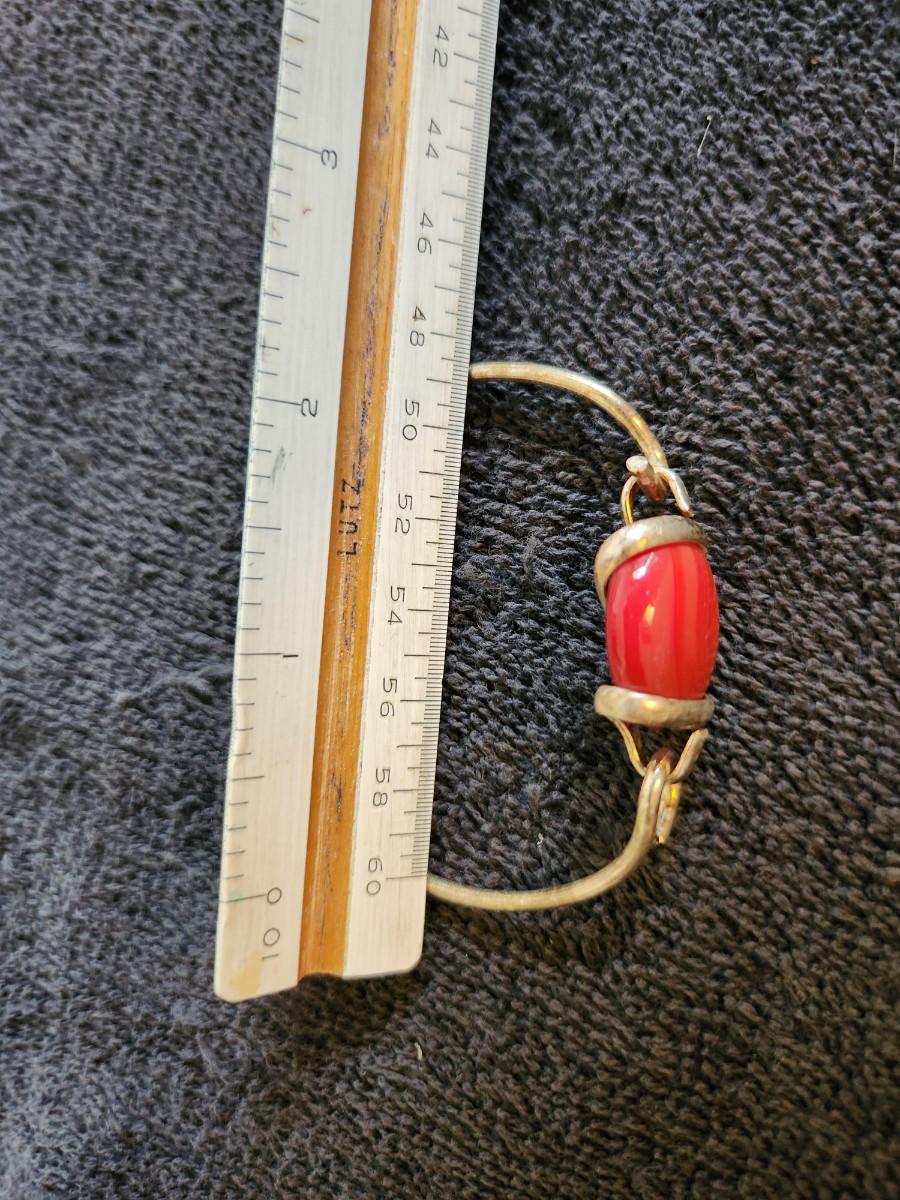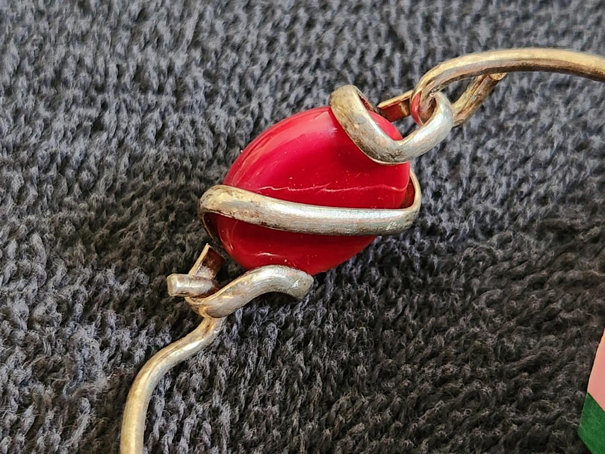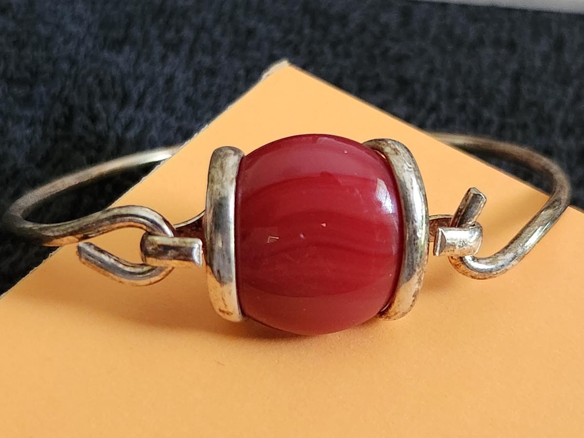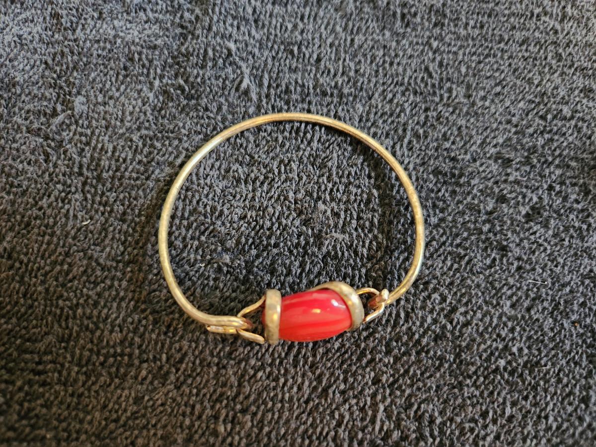 This auction lot is for a Designer Handmade Bracelet with Inset Orangey Stone. The wire has a gold tone finish. Nice for showy wear.