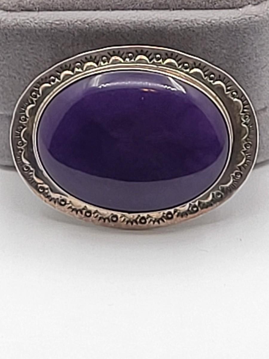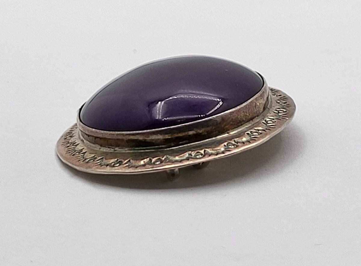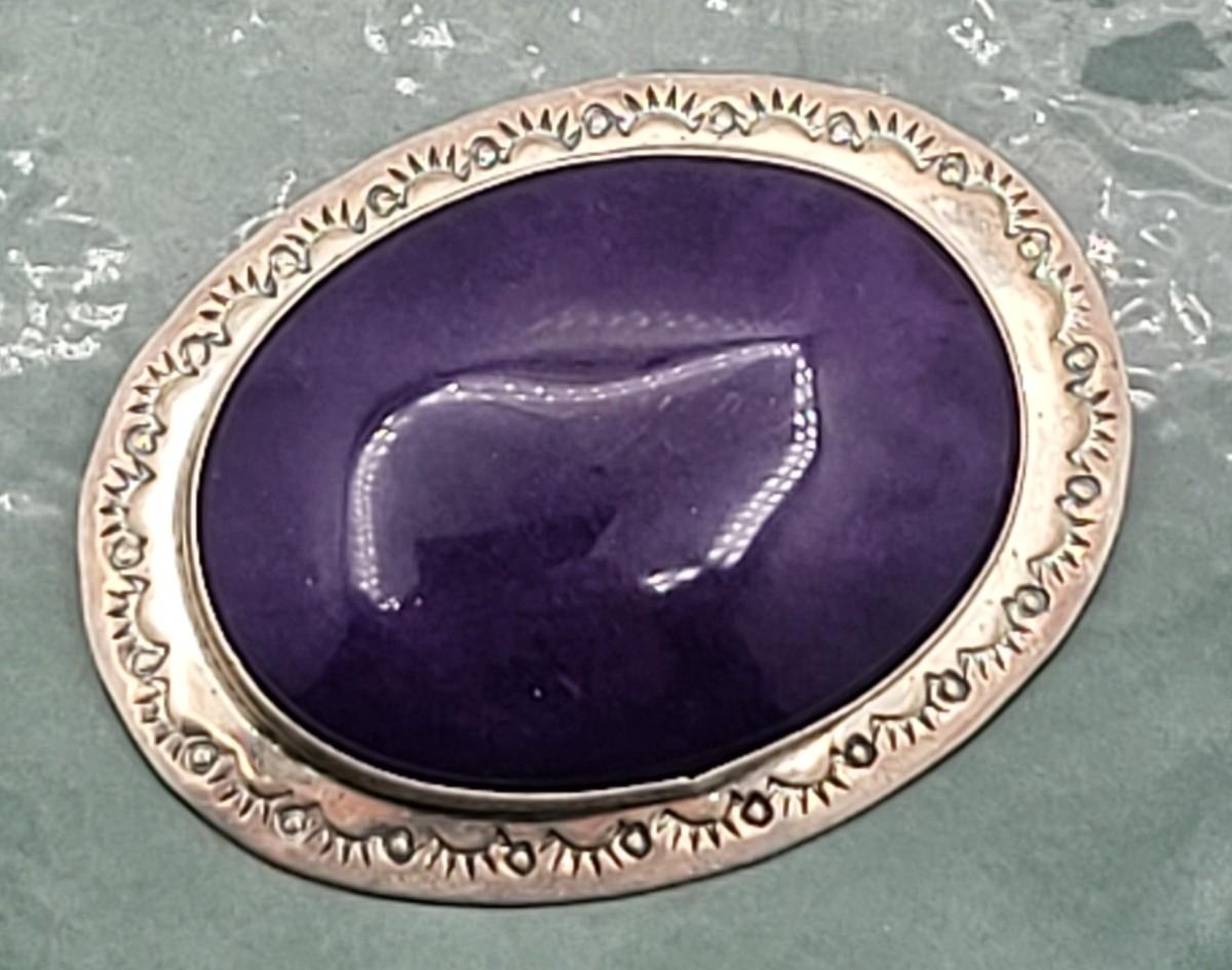 Large Native American oval purple Charoite stone brooch or wear as pendant. Set in sterling silver, etched frame and signed MVV. Measures 2" x 1.5".