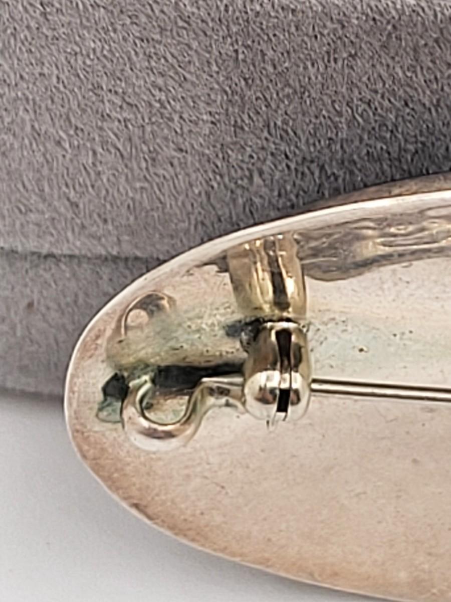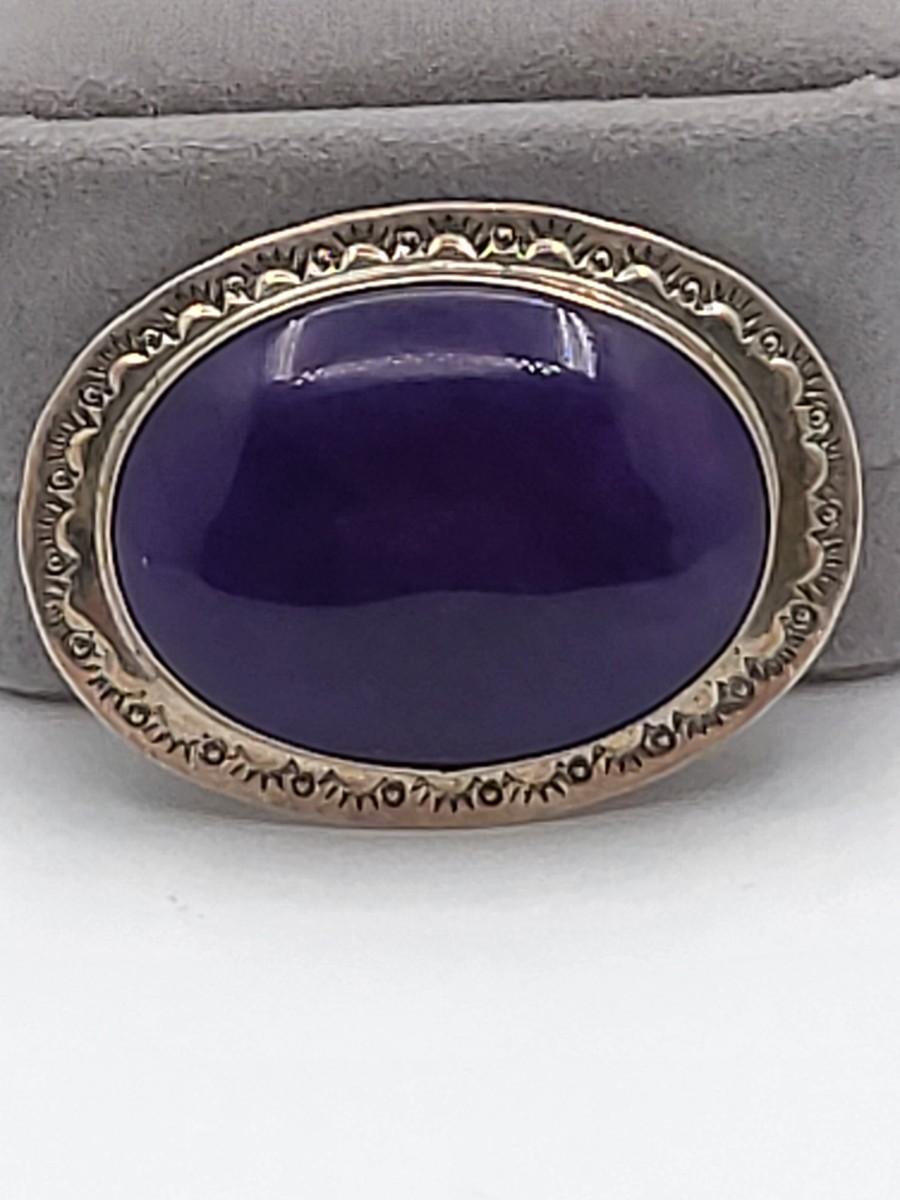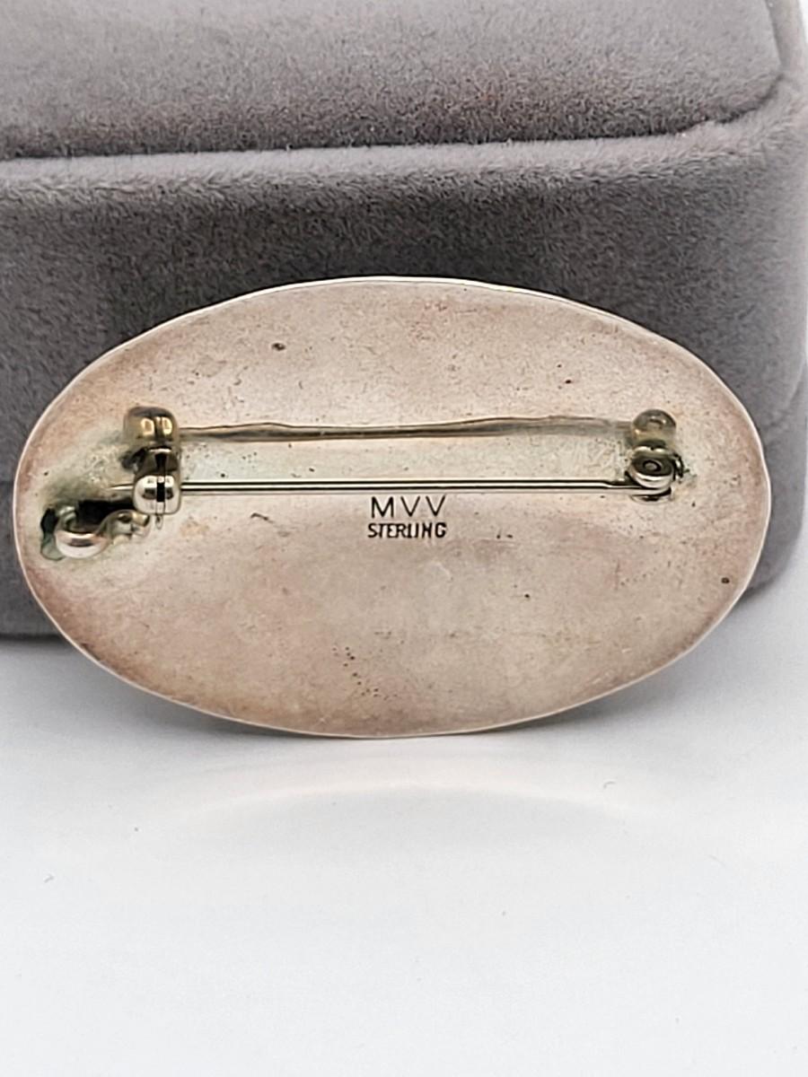 Large Native American oval purple Charoite stone brooch or wear as pendant. Set in sterling silver, etched frame and signed MVV. Measures 2" x 1.5".