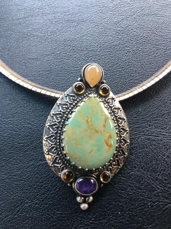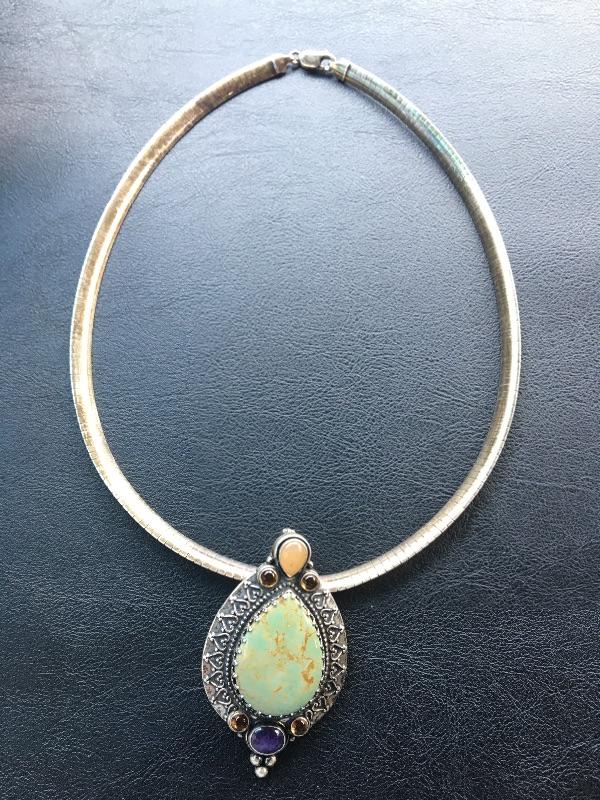 It looks to be a Native American designer. Condition is very good and all original. Signed with a monogram on the back. Necklace weighs 33 grams and is 18” long. Pendant weighs 29 grams and is 1.5” wide x 2.5” long. Not sure what kind of stones they are. Delivery and shipping services available. Please contact us to request a quote.