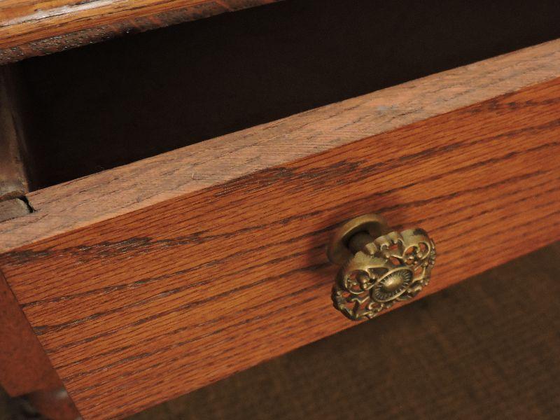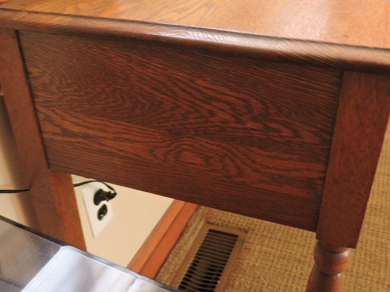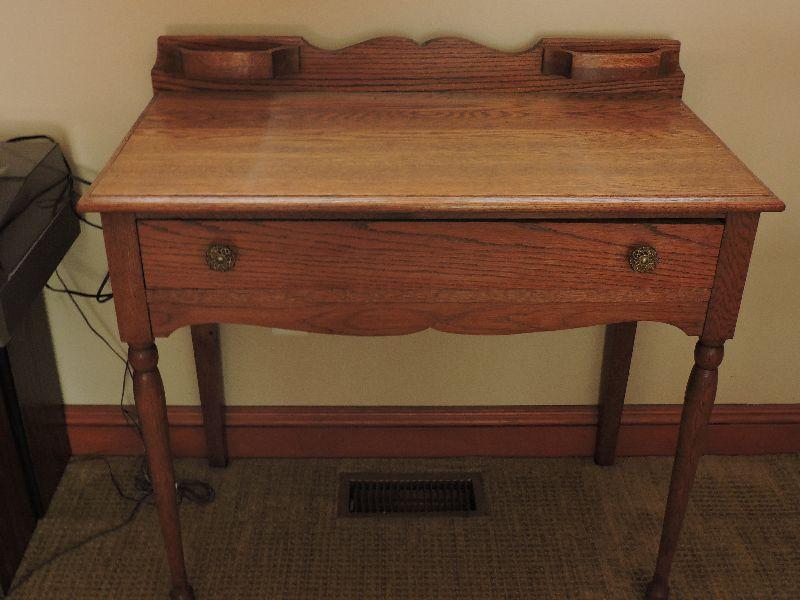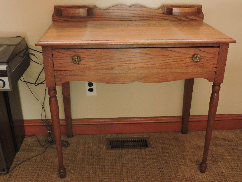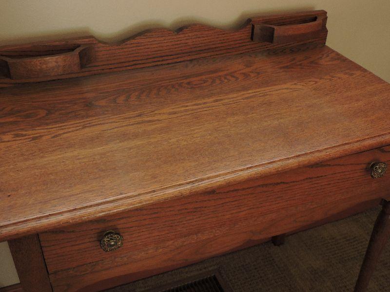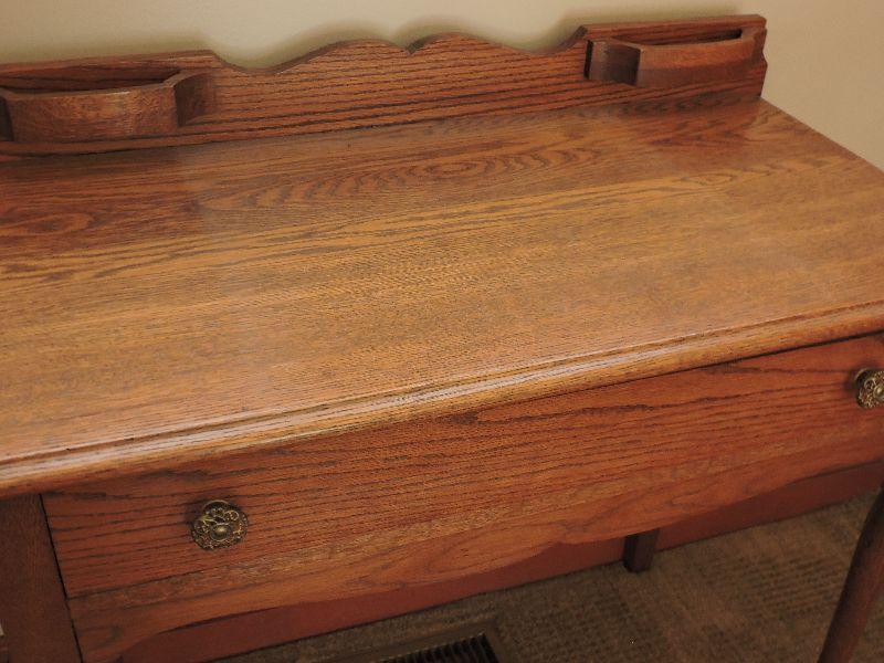 Nice oak desk with one pull out drawer. Bring help to move. Please read Terms and Conditions before placing a bid. Pick up is Friday, October 25th between 4 and 7, and Saturday, October 26th between 9 and 1. Props included in photos are not included in listing. All measurements are approximate. Comes from home with cats.