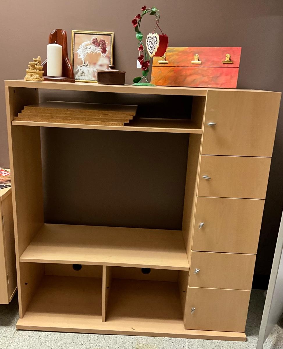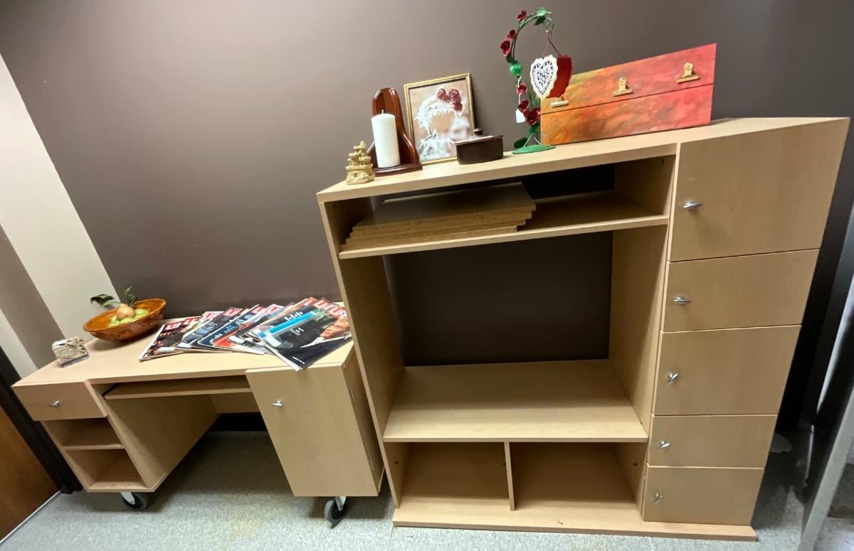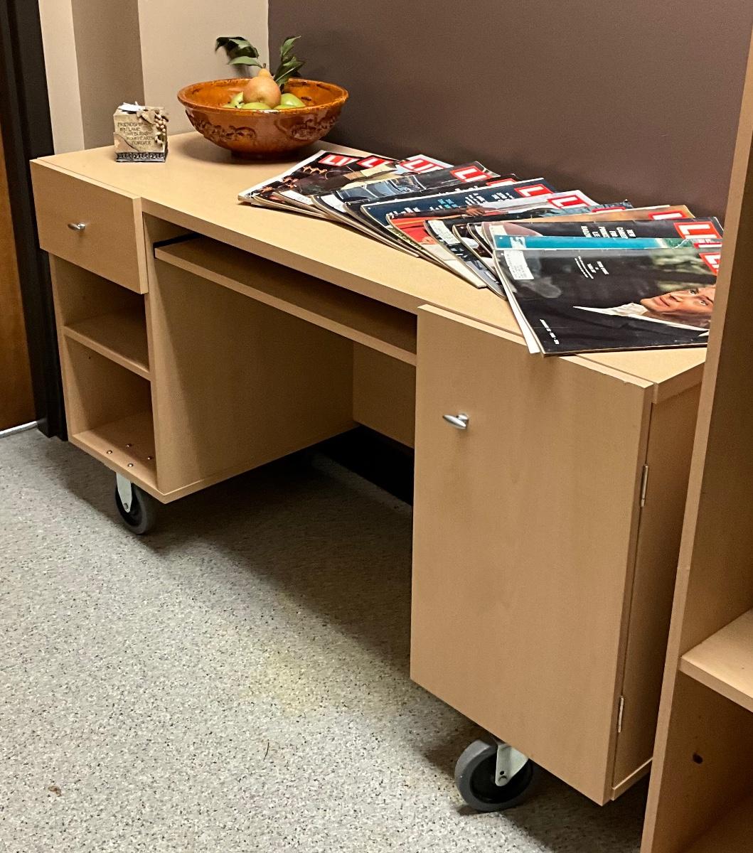 Desk with matching hutch. Desk is on wheels 54’’ x 21’’ Hutch is 50’’ tall. Comes with decorations, pictures, and Vintage Time Magazines.