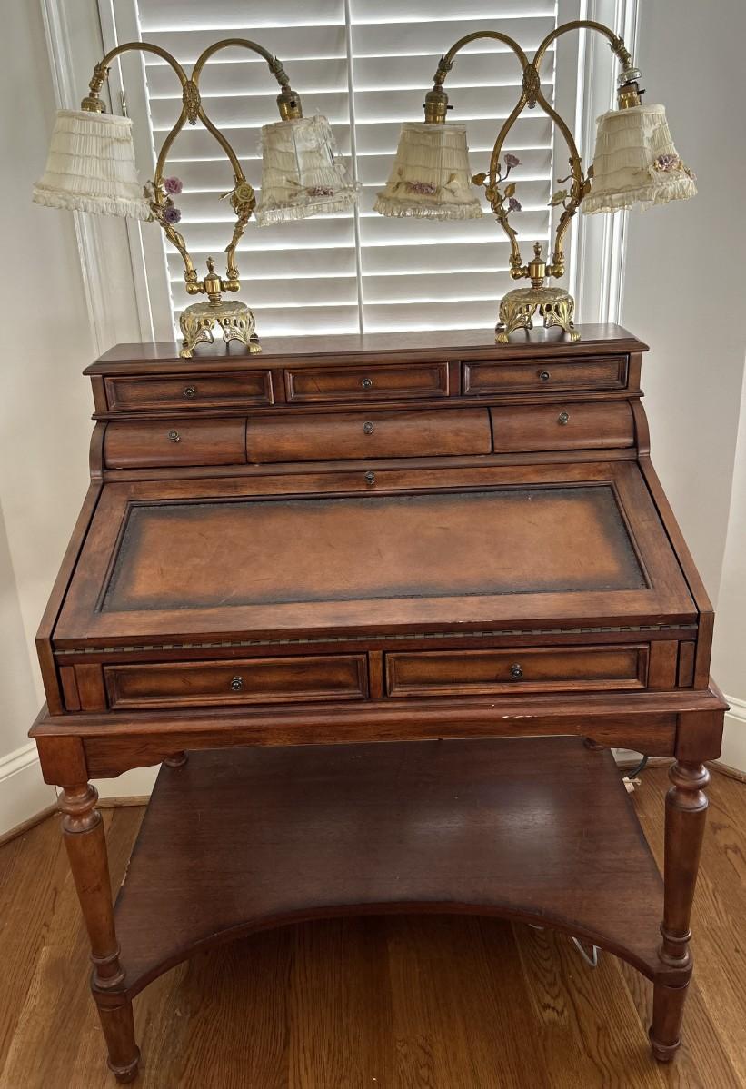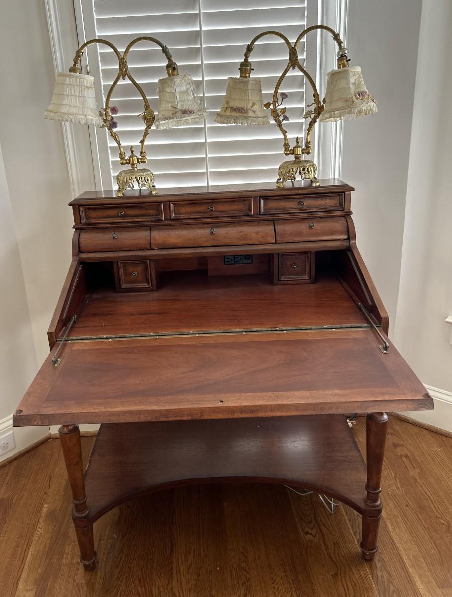 Beautiful desk with 6 small drawers on the top. The desk opens out to provide writing space and additional storrage. Curved sheld at the bottom adds nice accent.