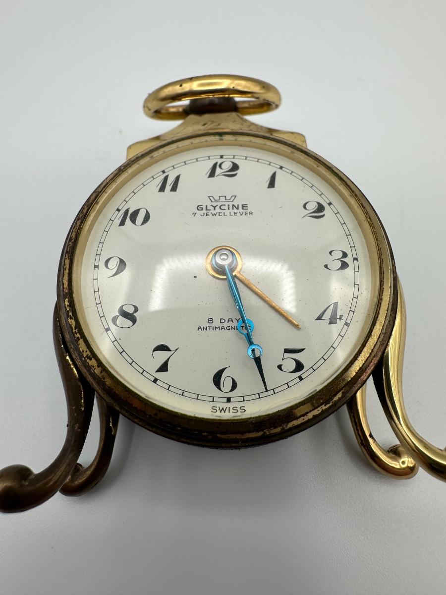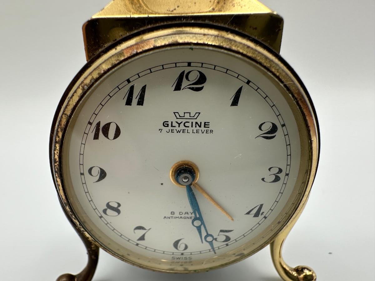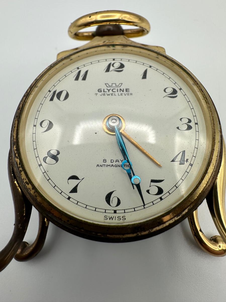 vintage Glycine clock. “7 Jewel Lever” and “8 Day Antimagnetic,” along with “Swiss Made” at the bottom. Works well.
