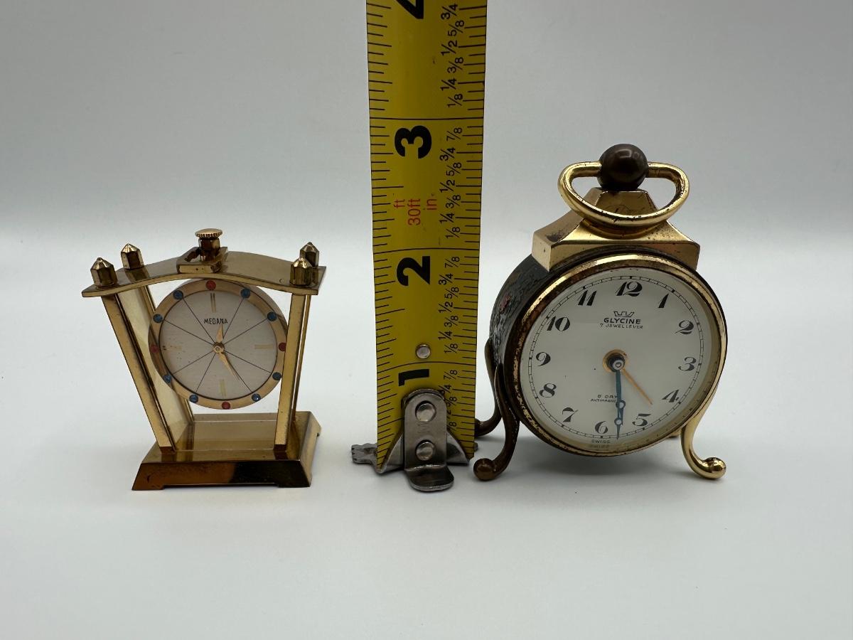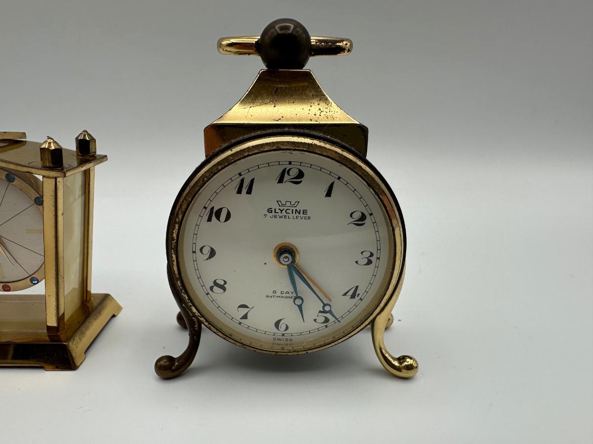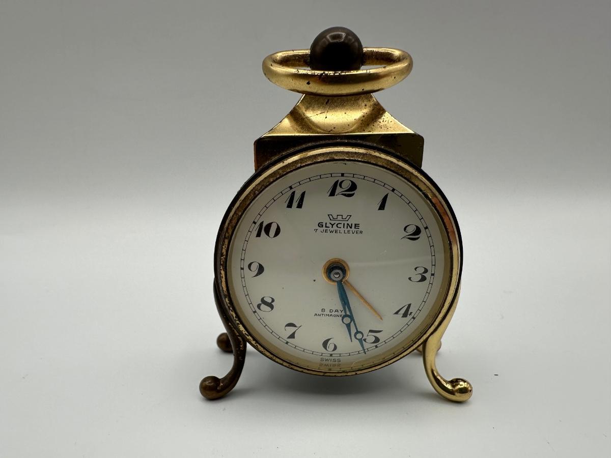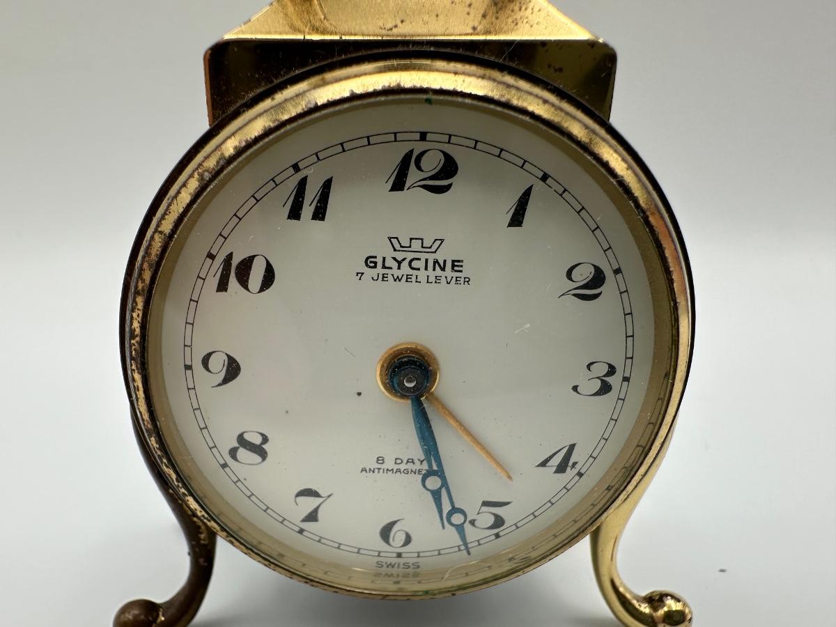 vintage Glycine clock. “7 Jewel Lever” and “8 Day Antimagnetic,” along with “Swiss Made” at the bottom. Works well.