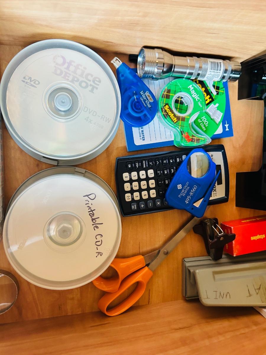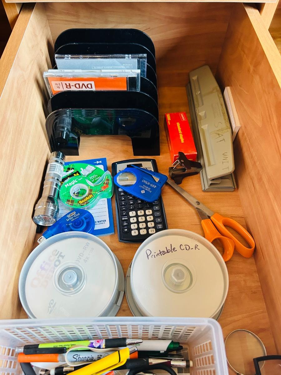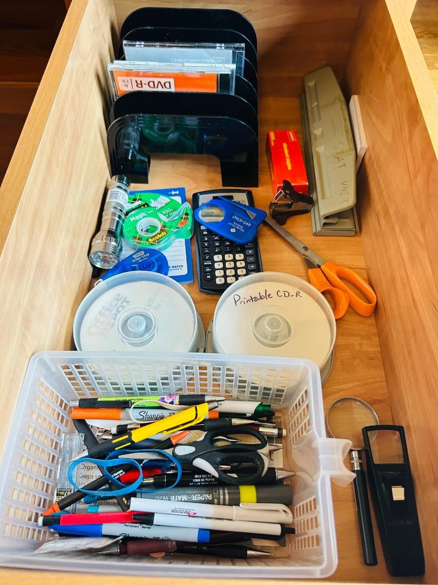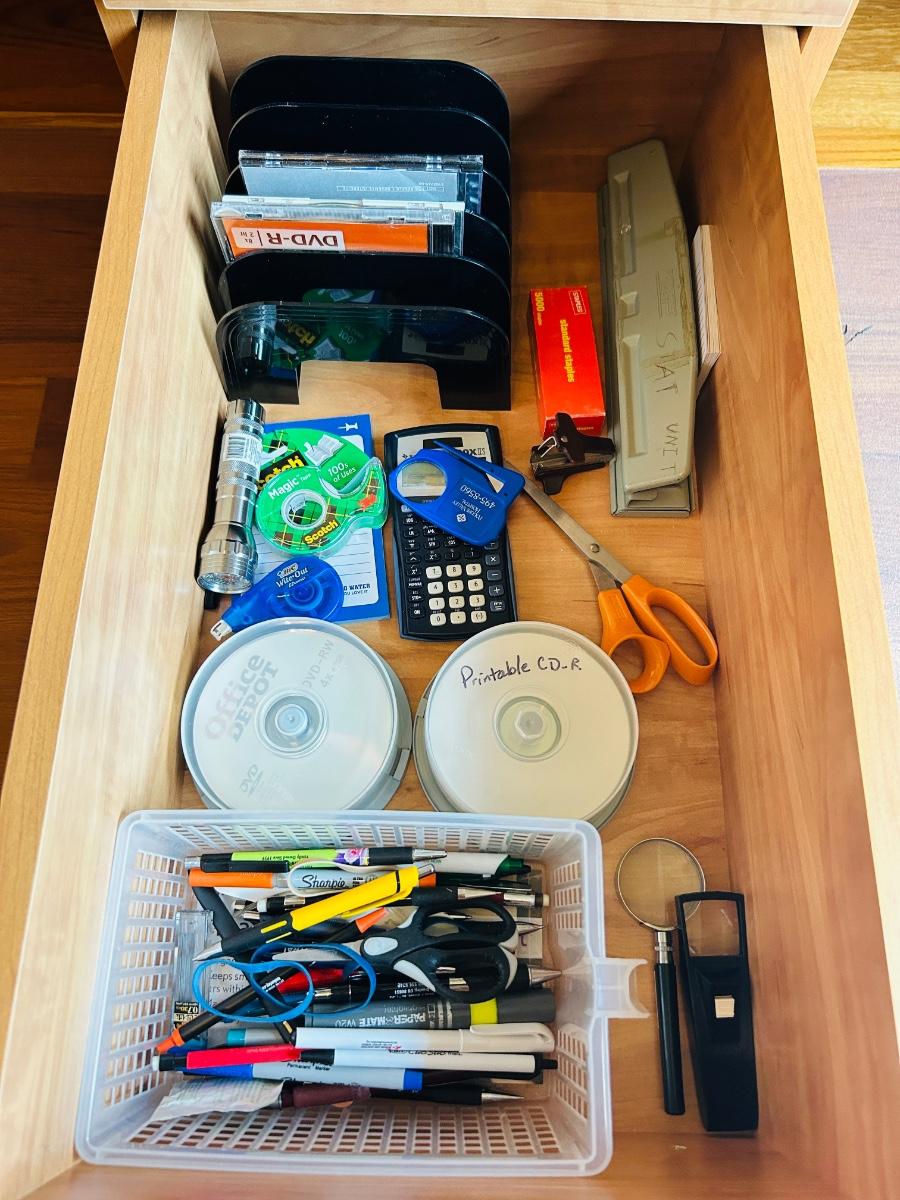 DESK DRAWER PACKED WITH DIFFERENT OFFICE SUPPLIES