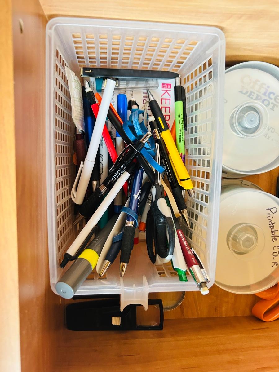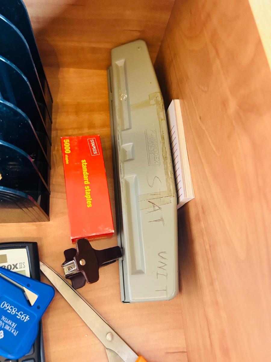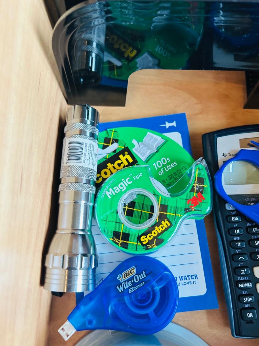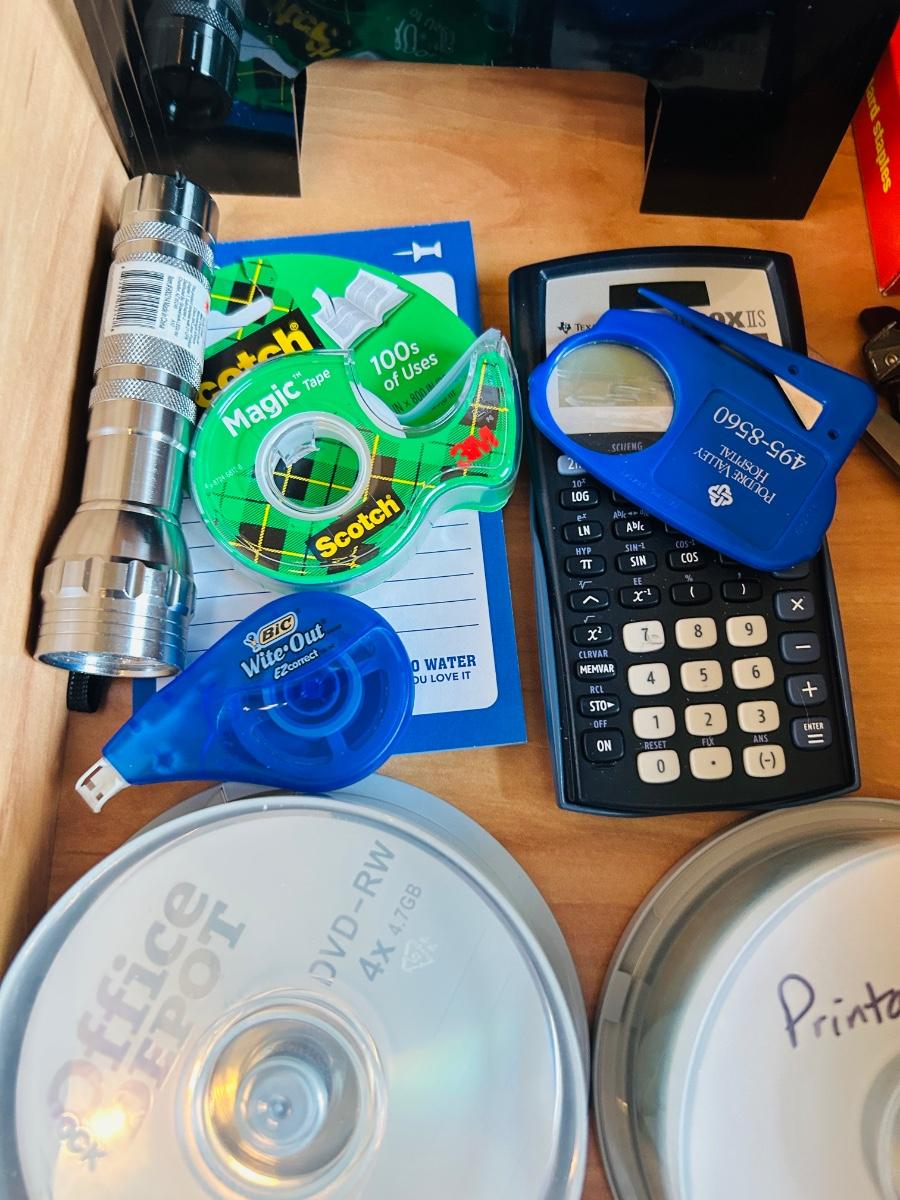 DESK DRAWER PACKED WITH DIFFERENT OFFICE SUPPLIES