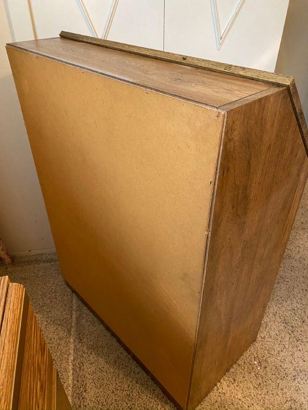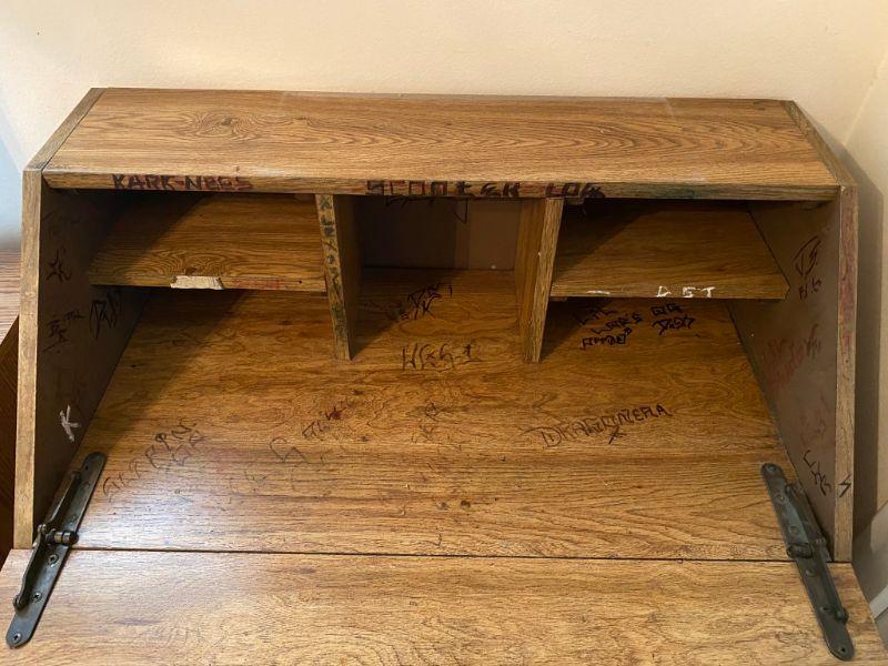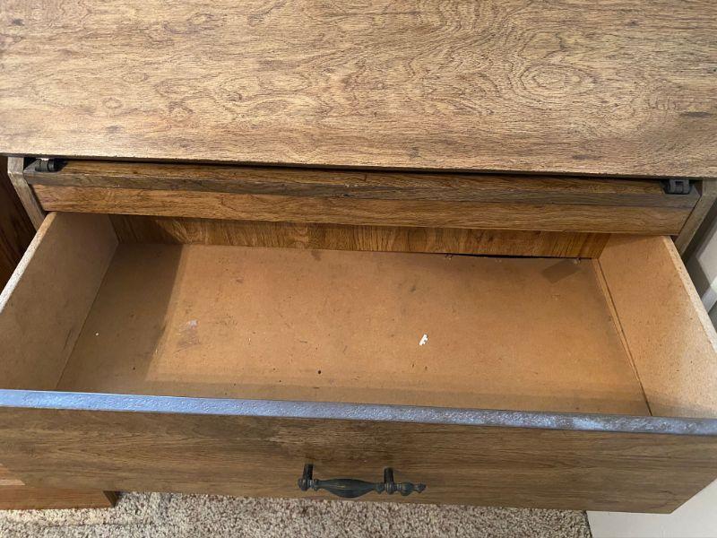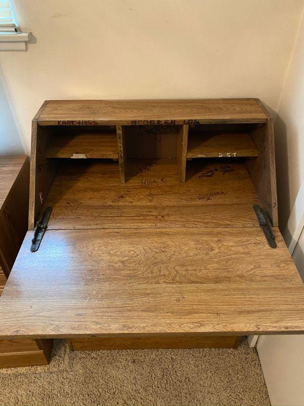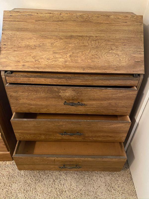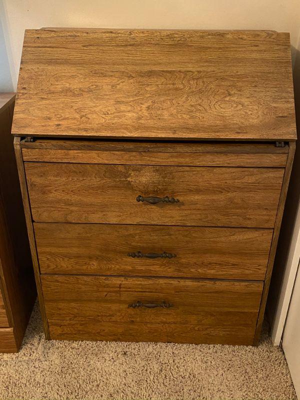 Combination 3 drawer dresser and secretary desk. Top folds down for desk use. Must have been a teens desk there is writing inside desk part. Looks to be veneer & press board. Fair condition. Good piece for when there is limited space.