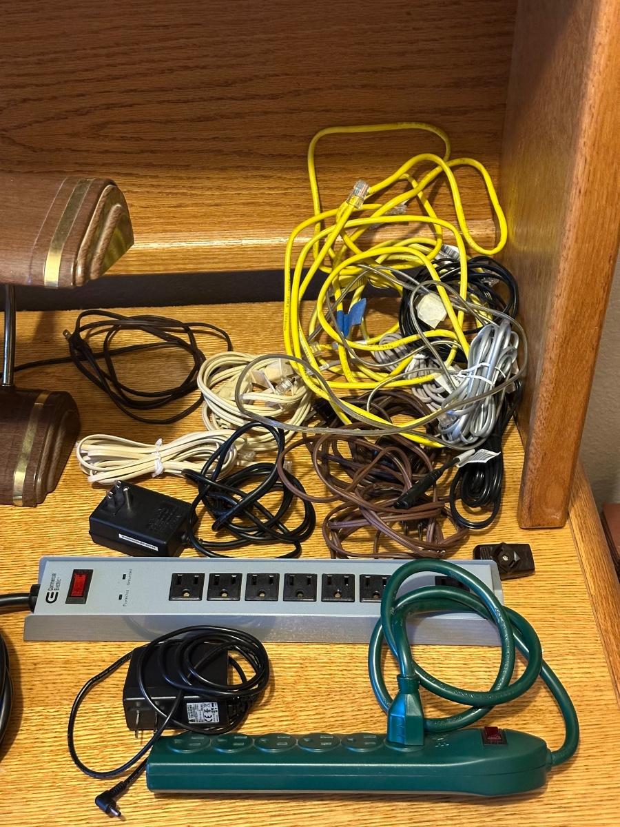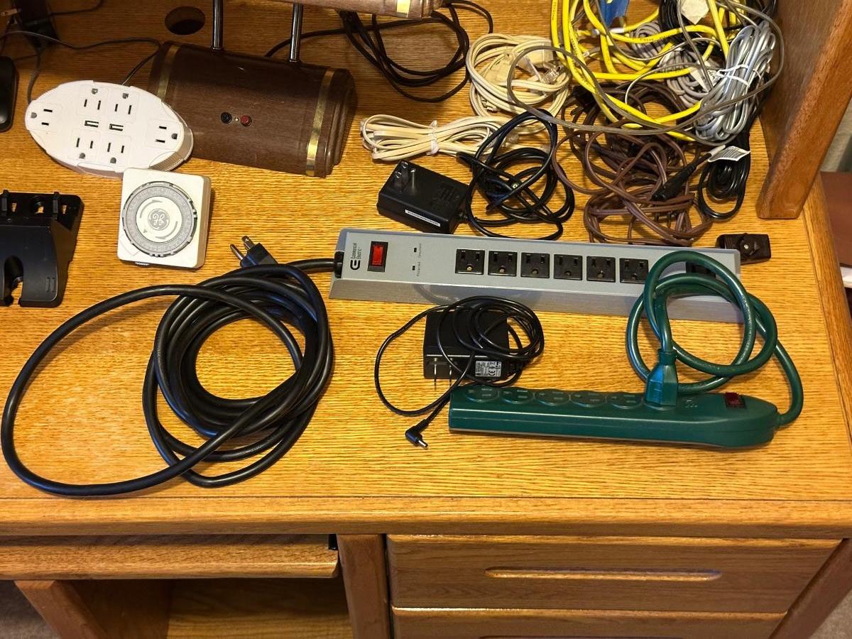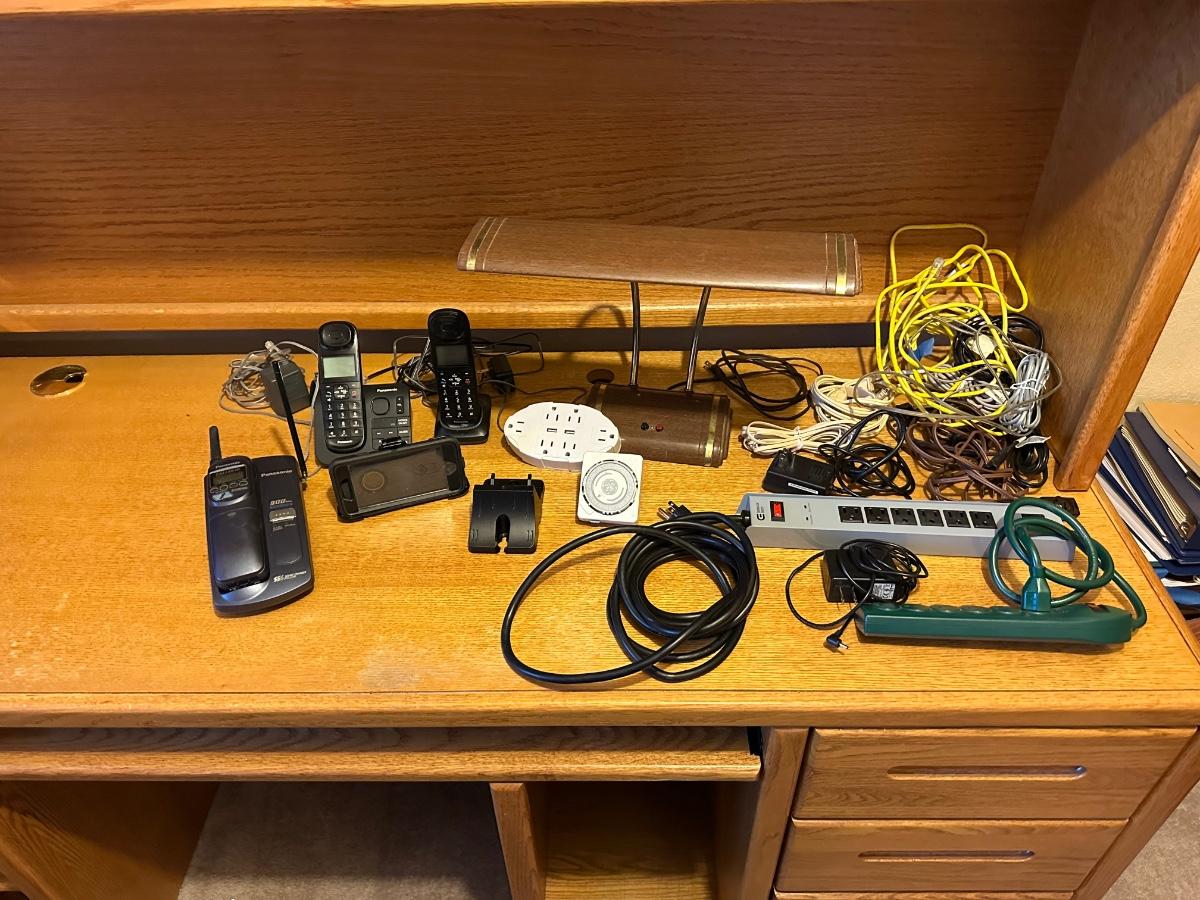 DESK LAMP, CORDLESS PHONES, SURGE BOX AND POWER CORDS PLUS MORE