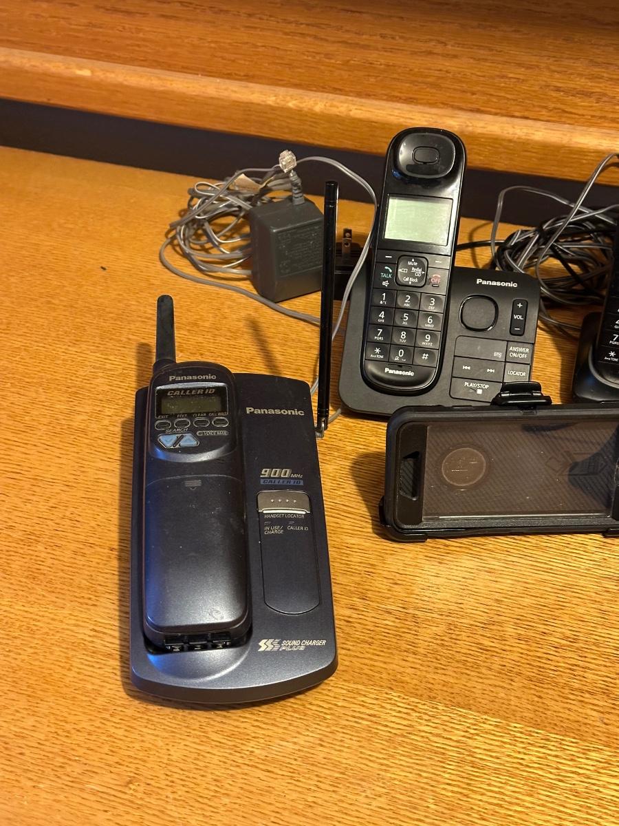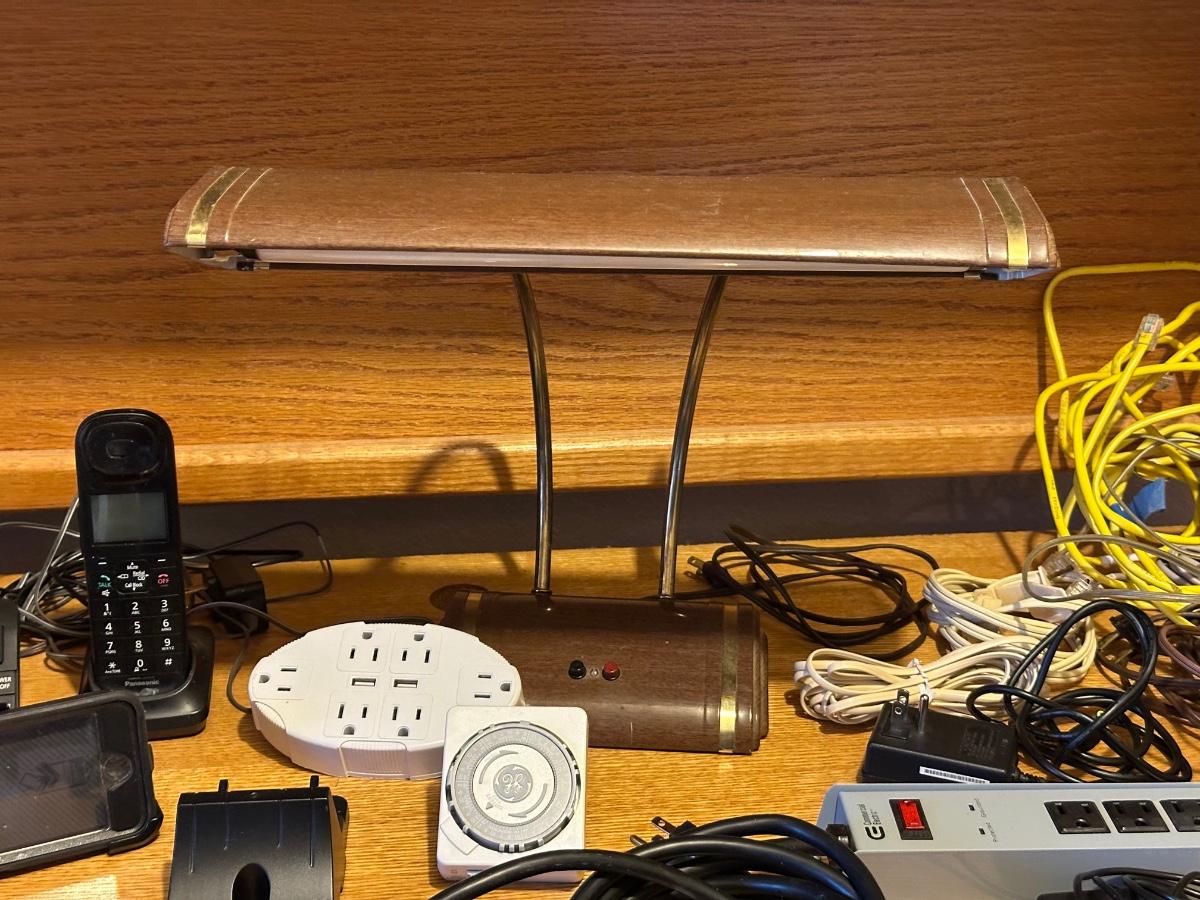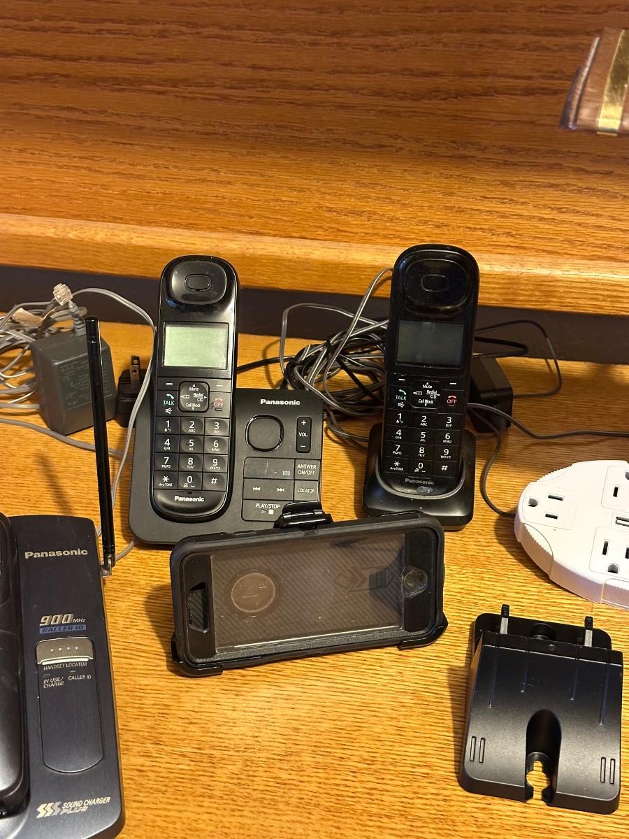 DESK LAMP, CORDLESS PHONES, SURGE BOX AND POWER CORDS PLUS MORE
