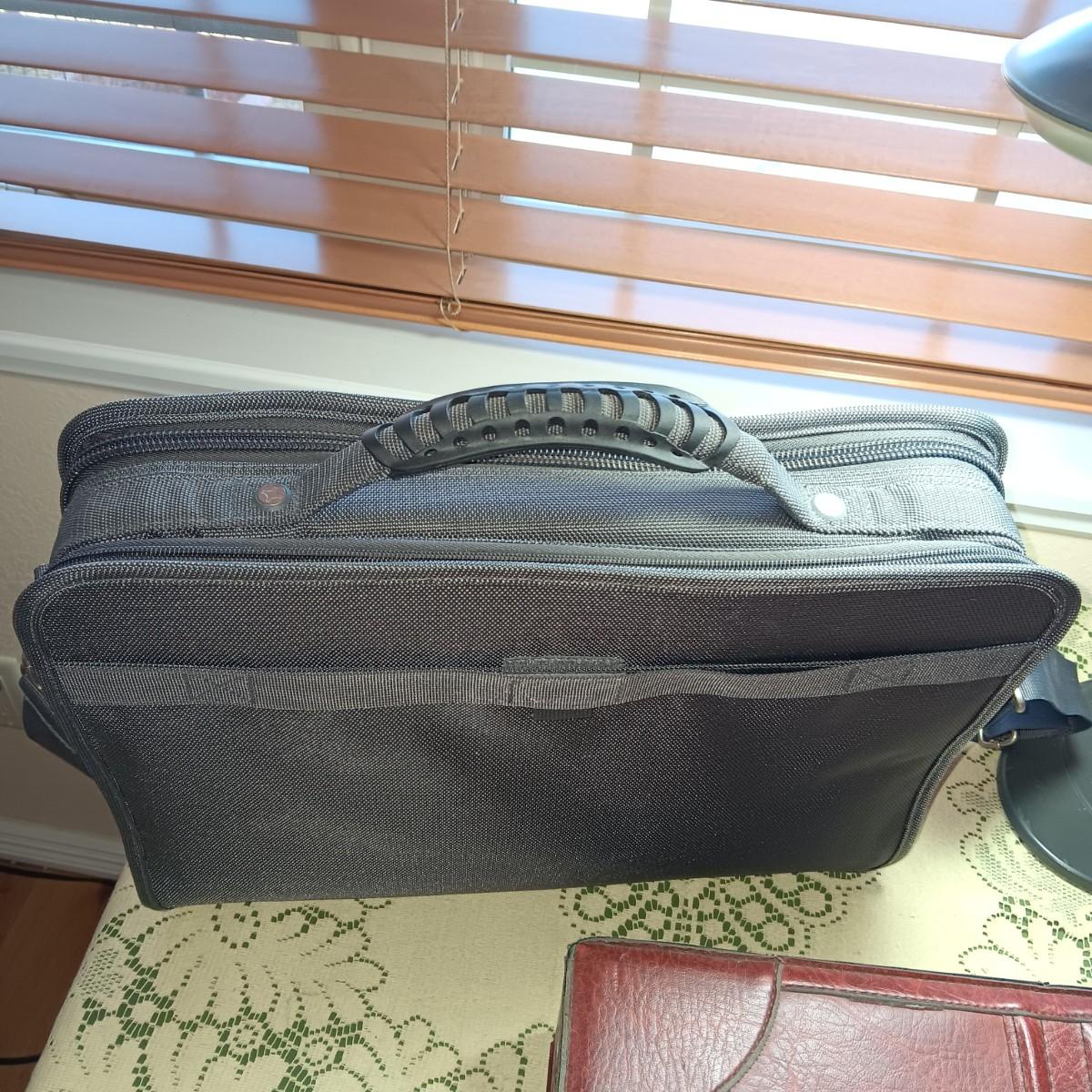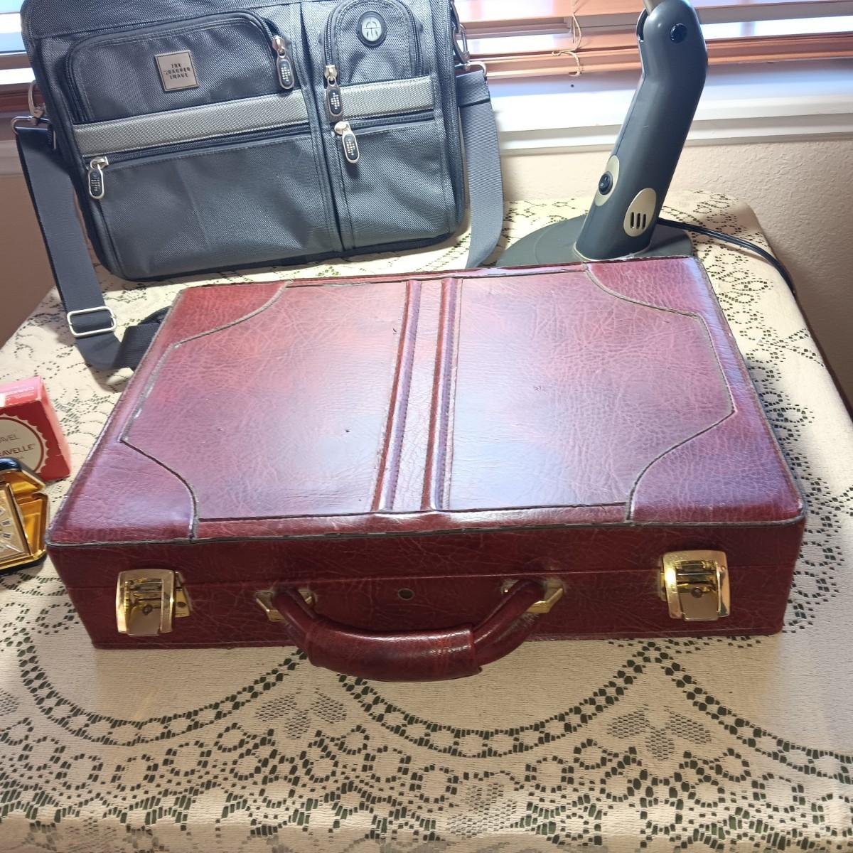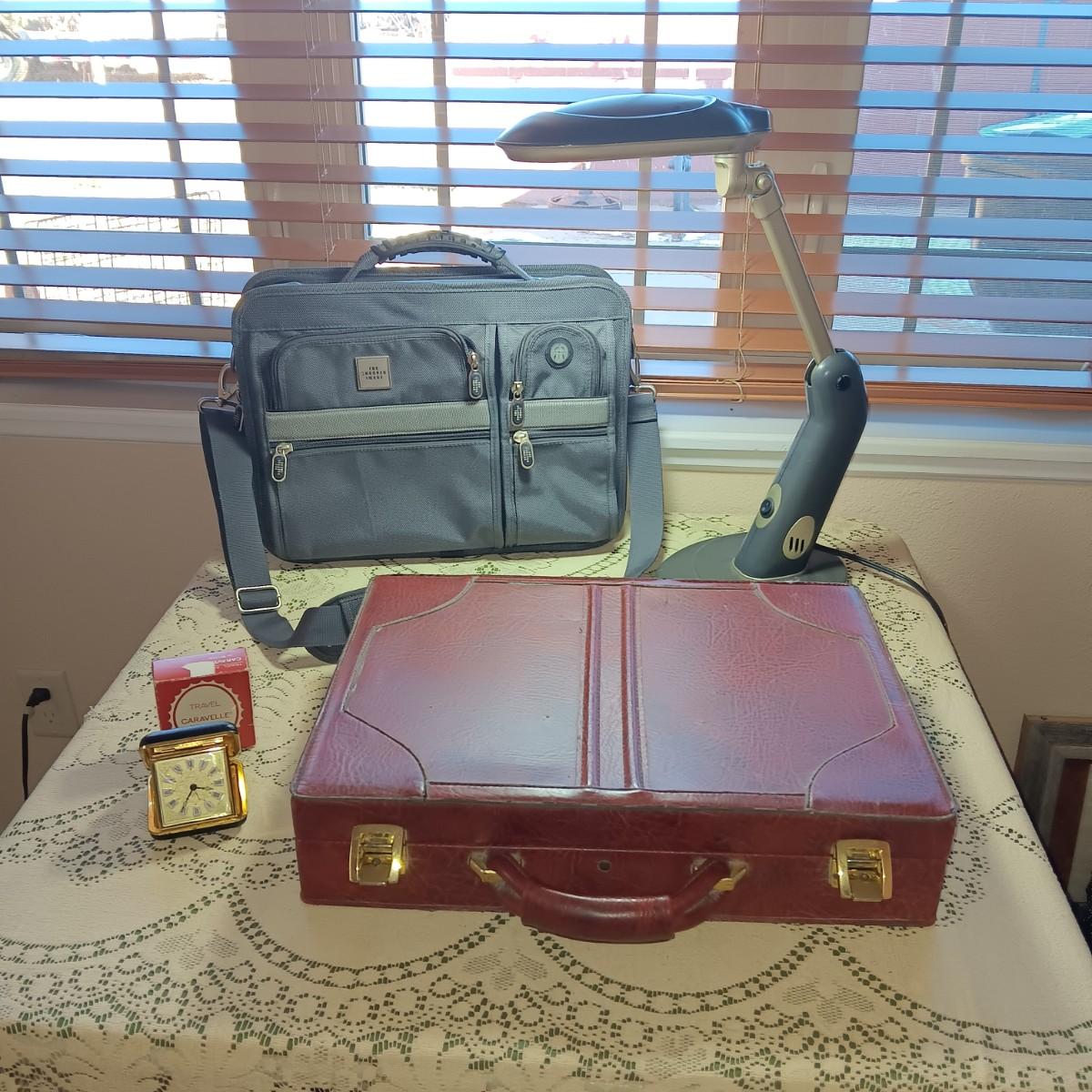 DESK LAMP, SOFT AND HARD SIDED BRIEFCASES PLUS CARAVELLE TRAVEL CLOCK