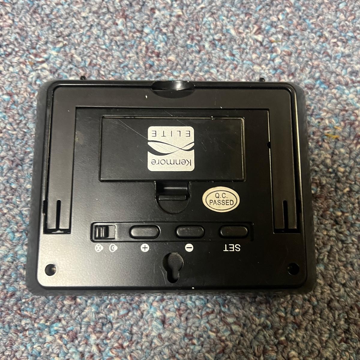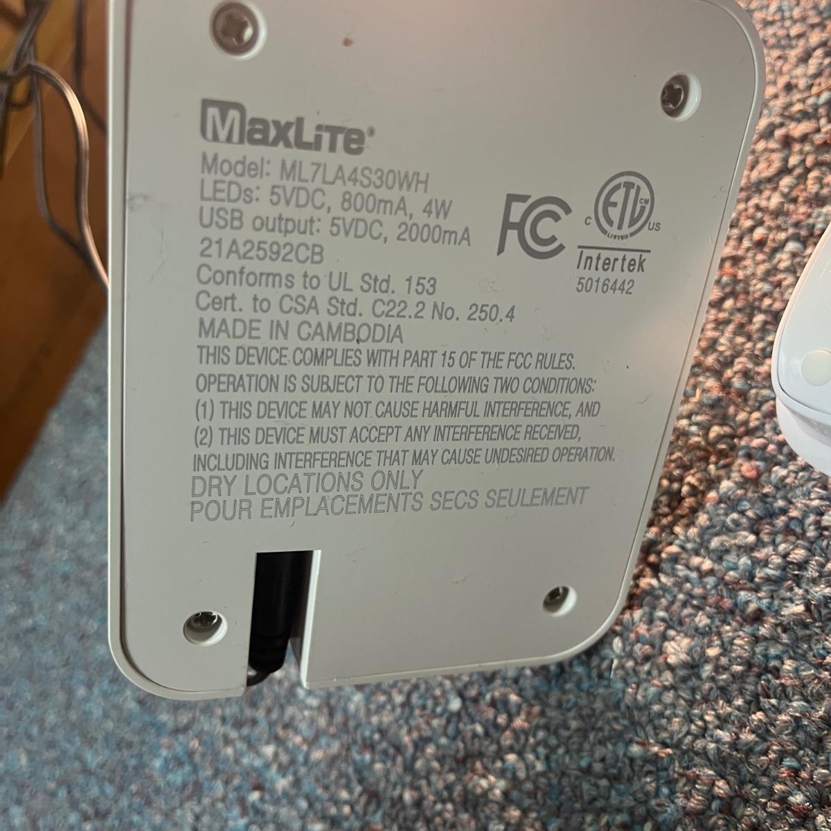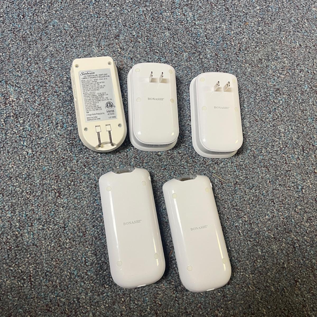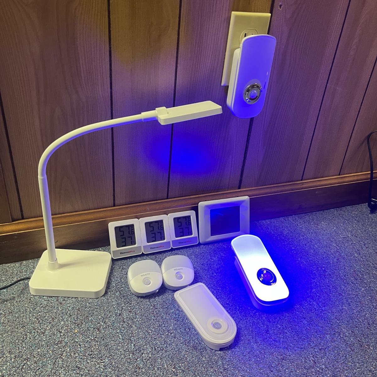Lot includes a Maxlite gooseneck desk lamp, two emergency flashlights, three thermometers, and three motion sensors. All items powered on when plugged except for Kenmore weather gauge that has no batteries.