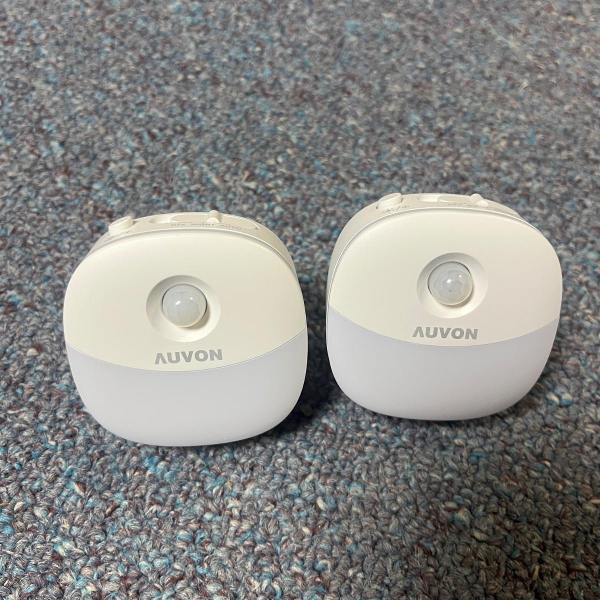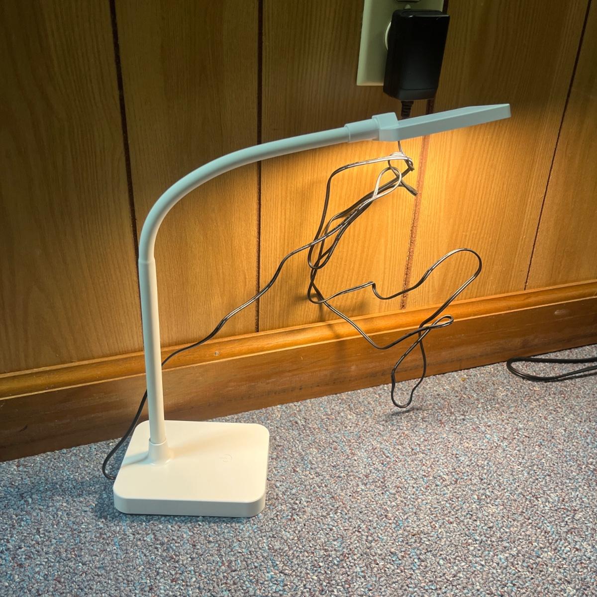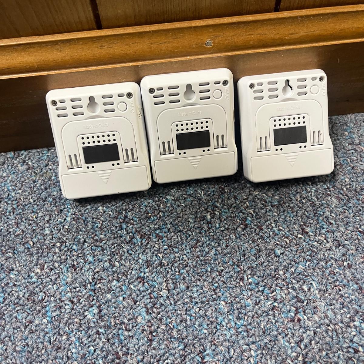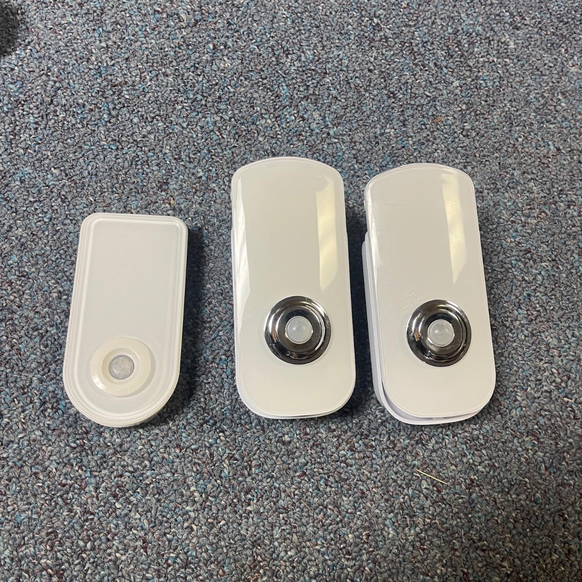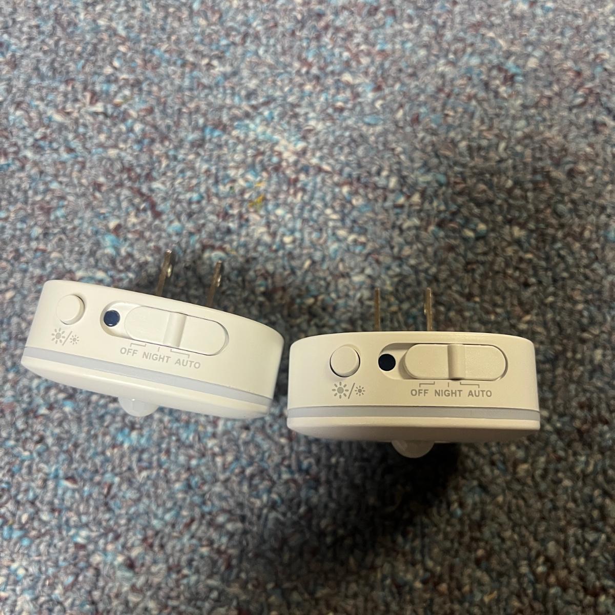 Lot includes a Maxlite gooseneck desk lamp, two emergency flashlights, three thermometers, and three motion sensors. All items powered on when plugged except for Kenmore weather gauge that has no batteries.