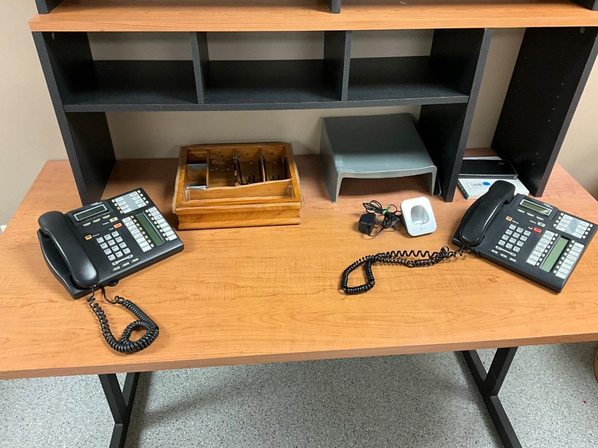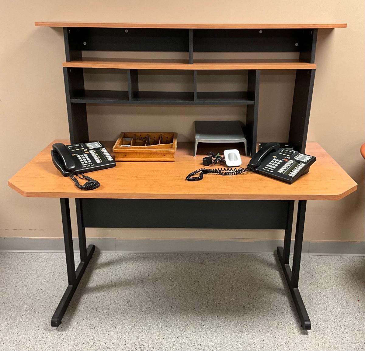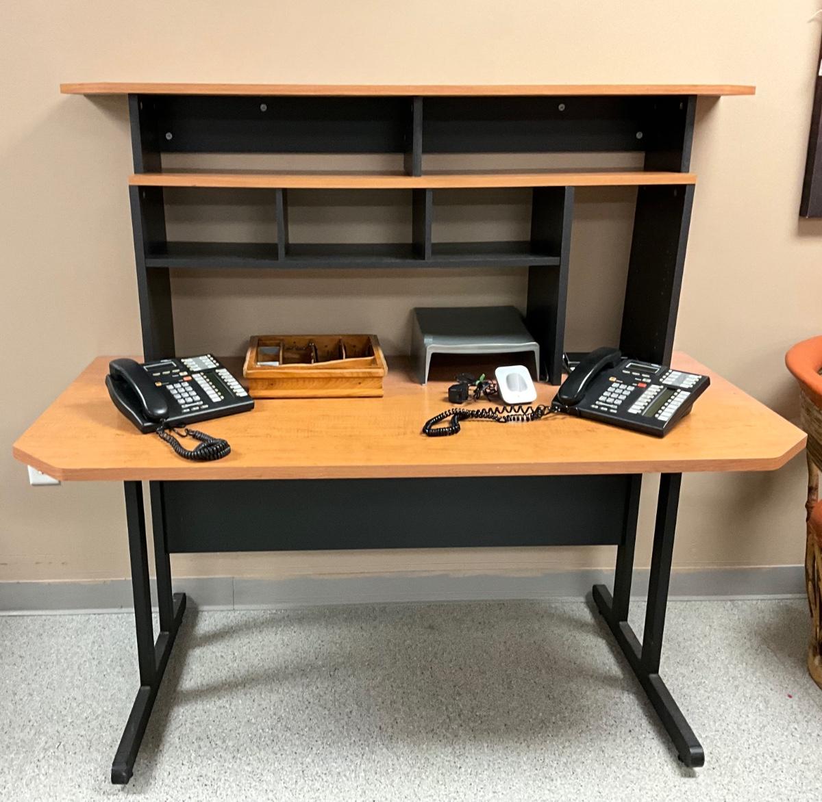 Desk is 55’’ high, 60’’ long with a metal base. Come with 3 phones and 2 organizers