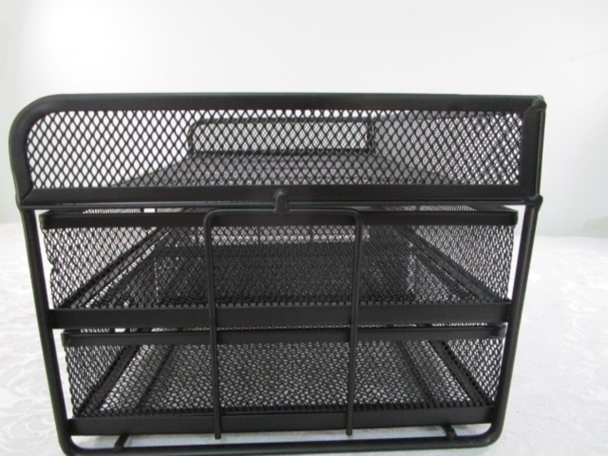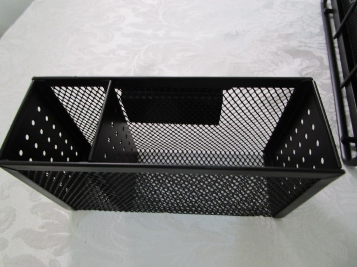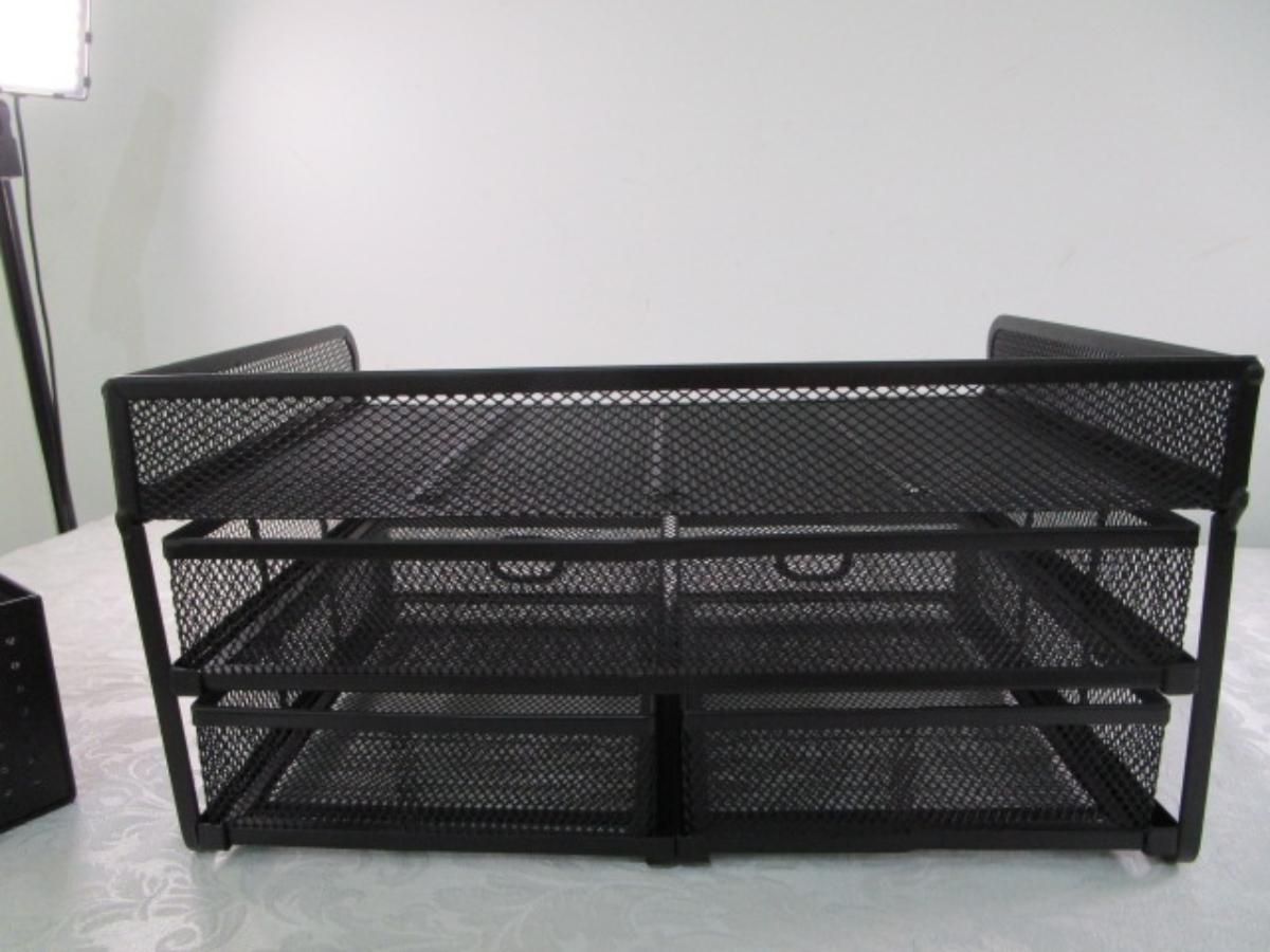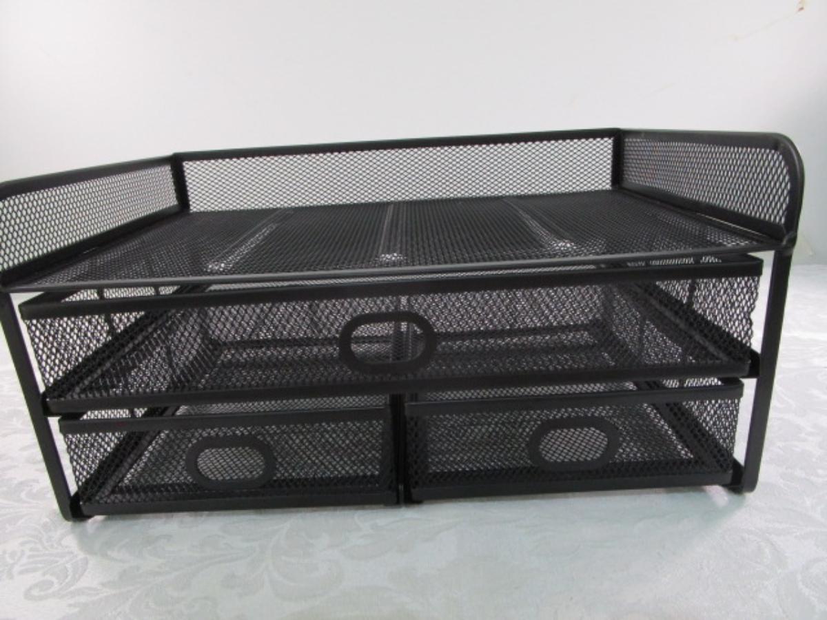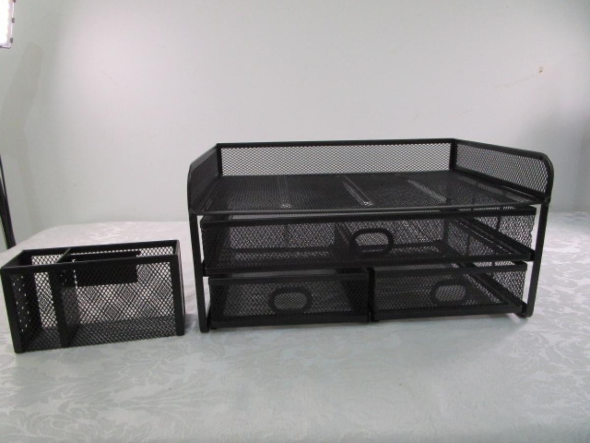 Like new, Black mesh organizer has 3 drawers 14" wide x 7" tall x 9" deep, pencil/pen holder 6-1/4" x 3-1/2" tall x 2-1/8" deep , See pictures
