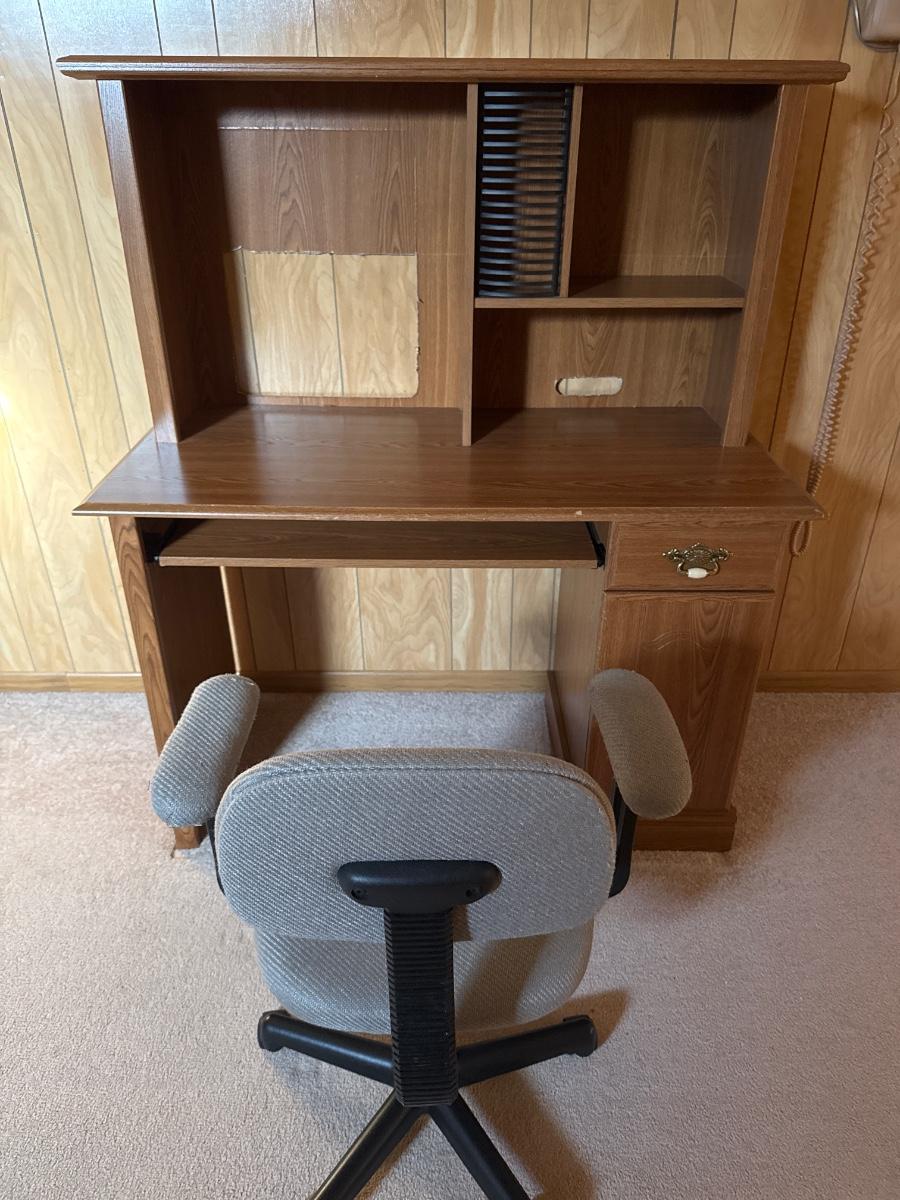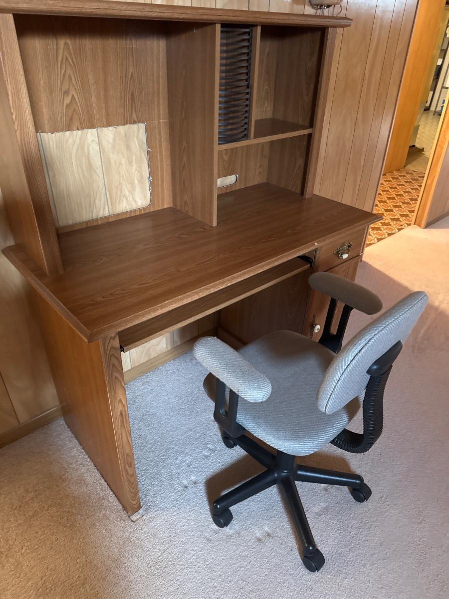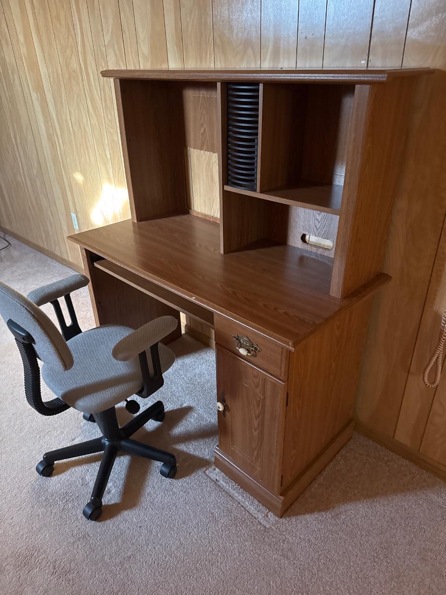 This is located in the Basement area so you will need to bring help to haul away. Dimensions are 55 inches tall by 47 inches wide by 22 1/2 inches deep. Includes office chair.
