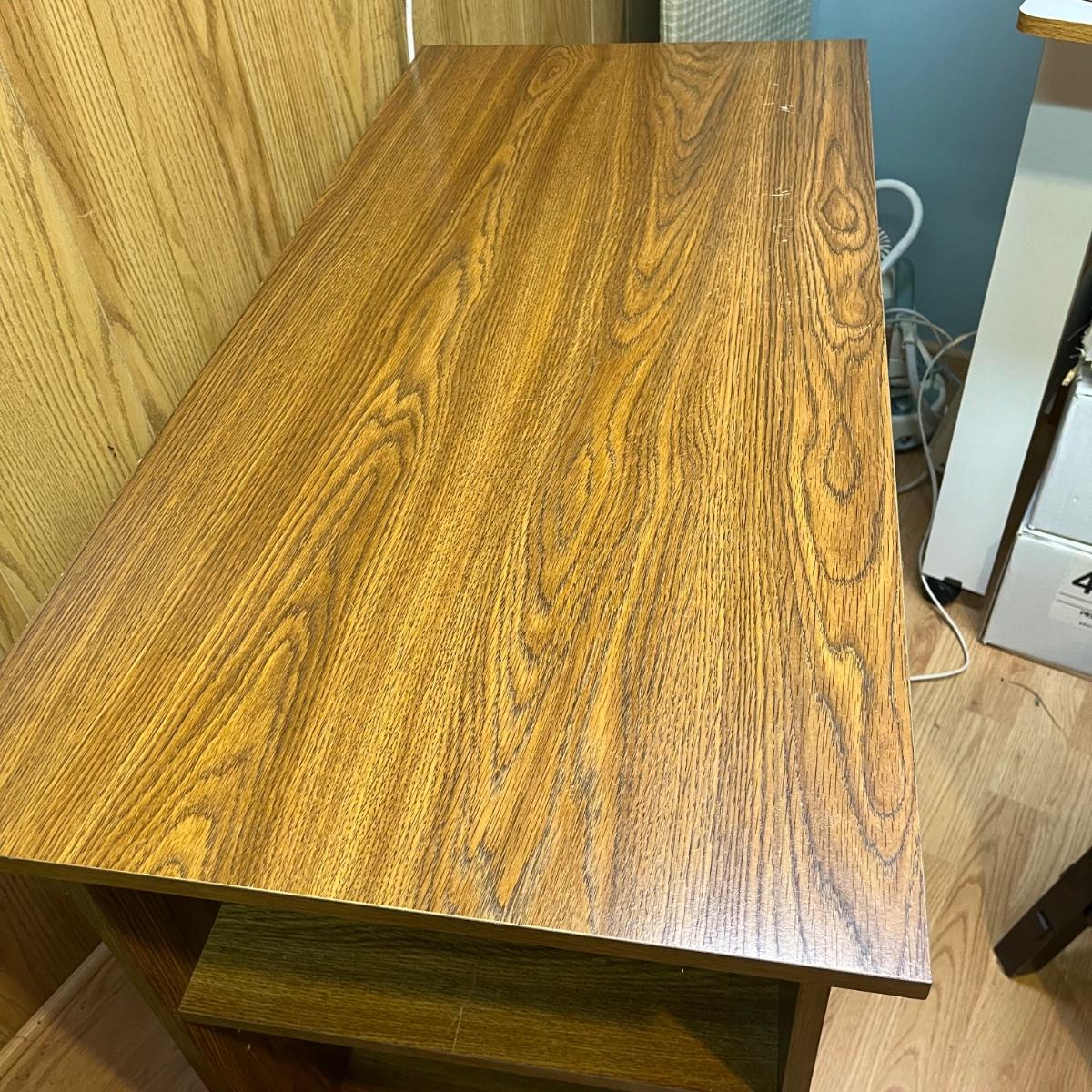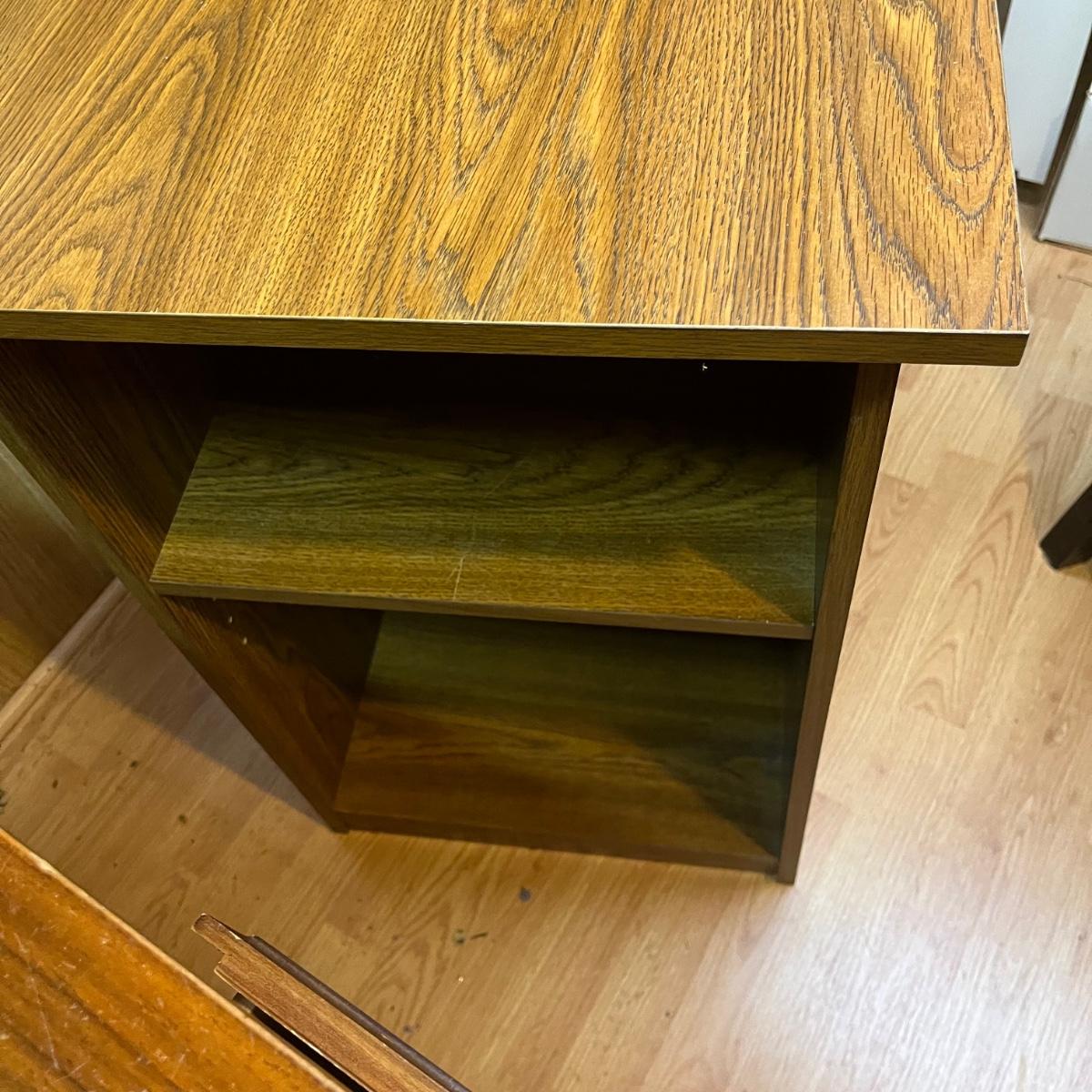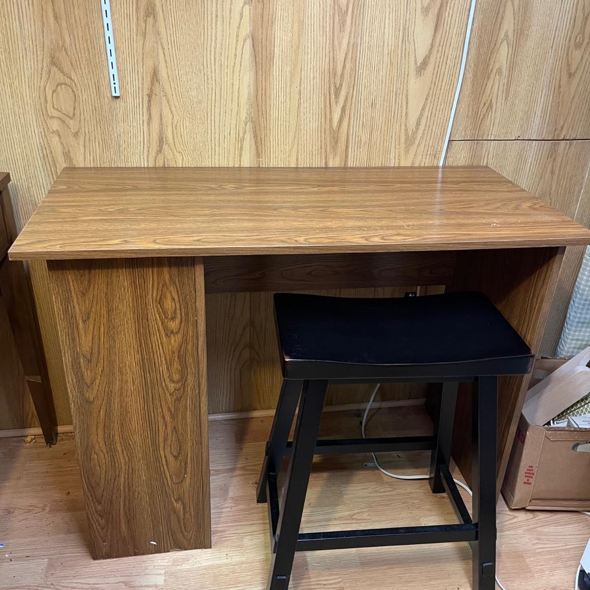 Lot includes a pressed wood desk with side storage with a adjustable shelf. Also includes a wooden stools. Desk measures 19.5” x 41.5” x 30.5”.