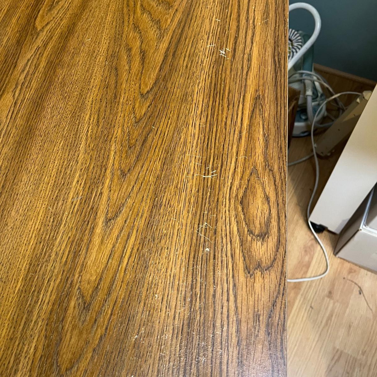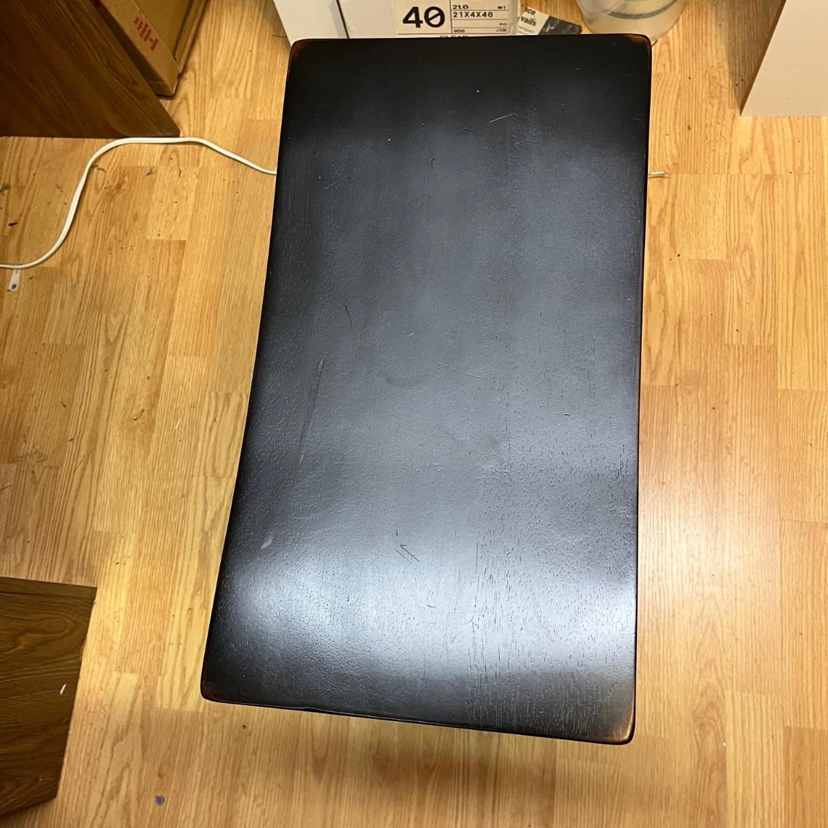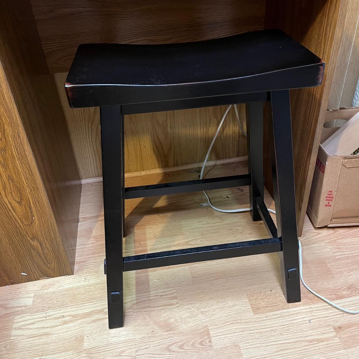 Lot includes a pressed wood desk with side storage with a adjustable shelf. Also includes a wooden stools. Desk measures 19.5” x 41.5” x 30.5”.
