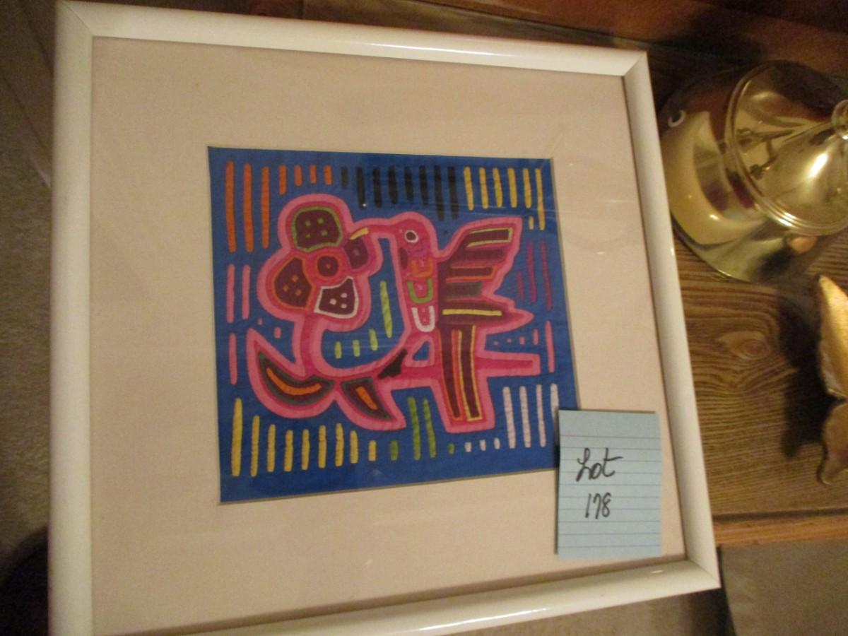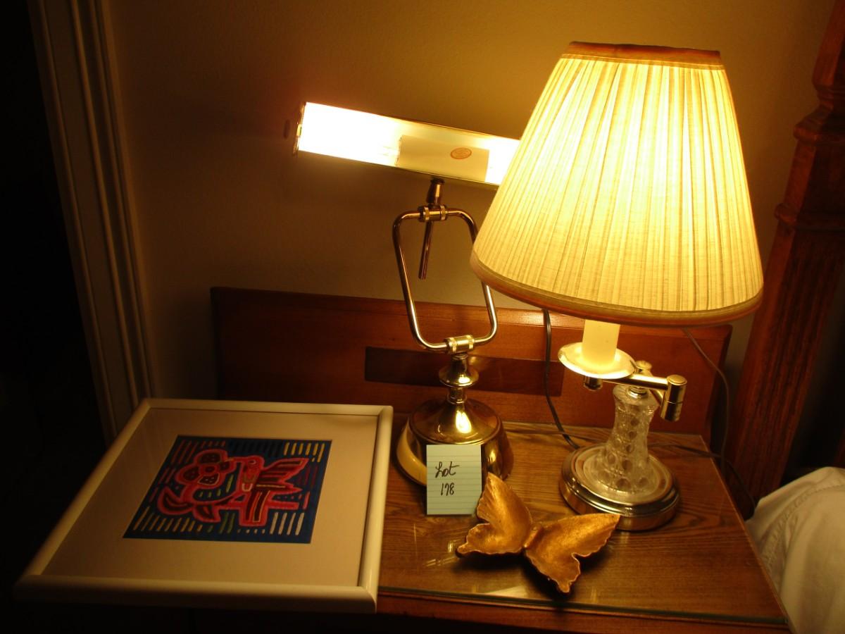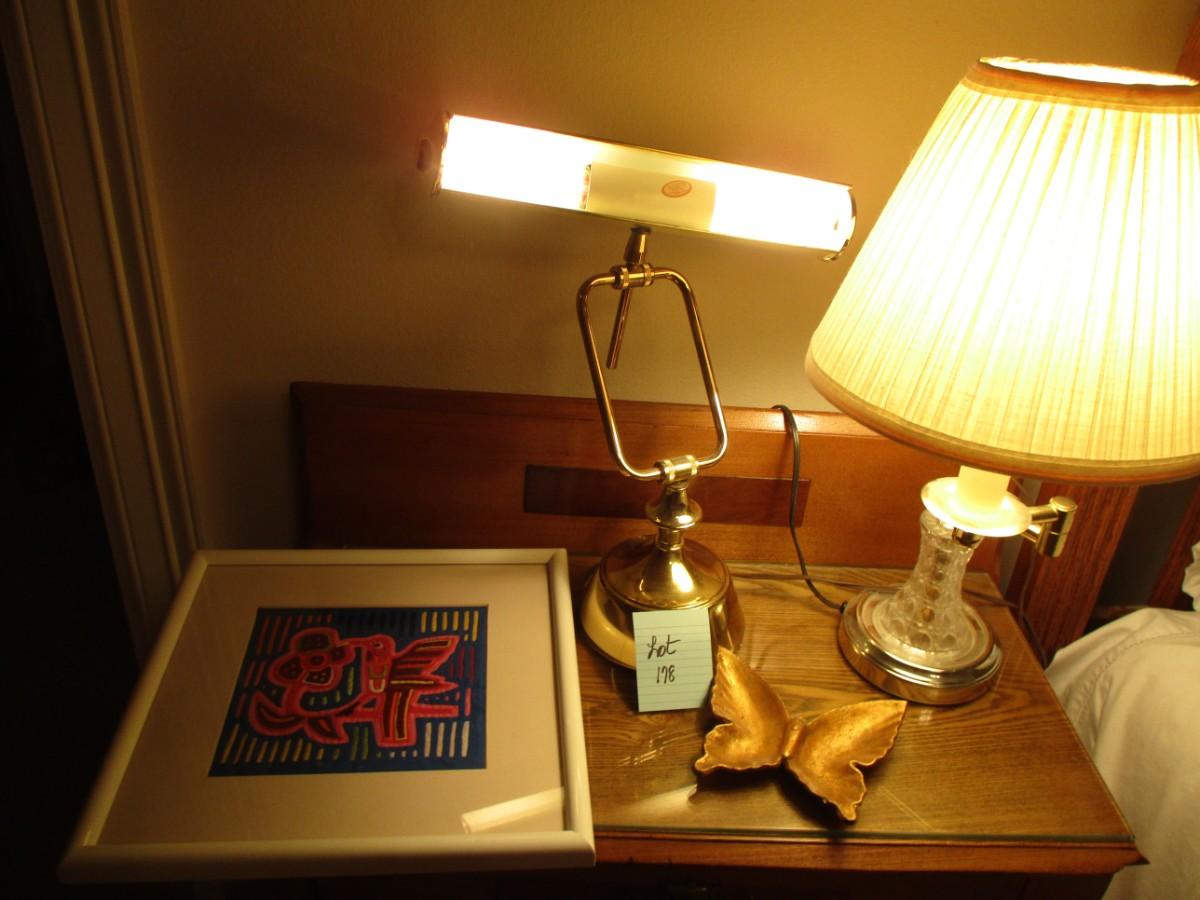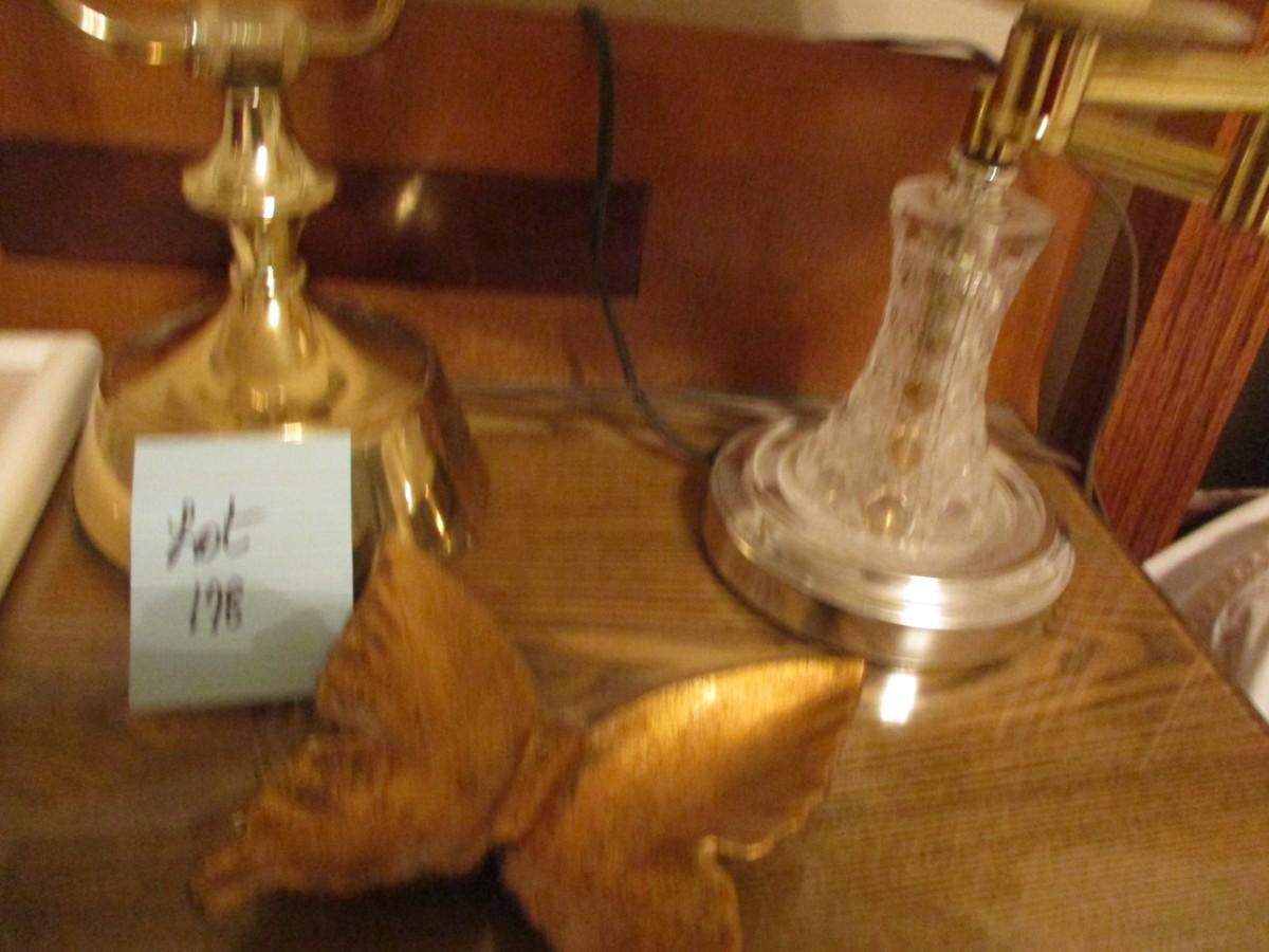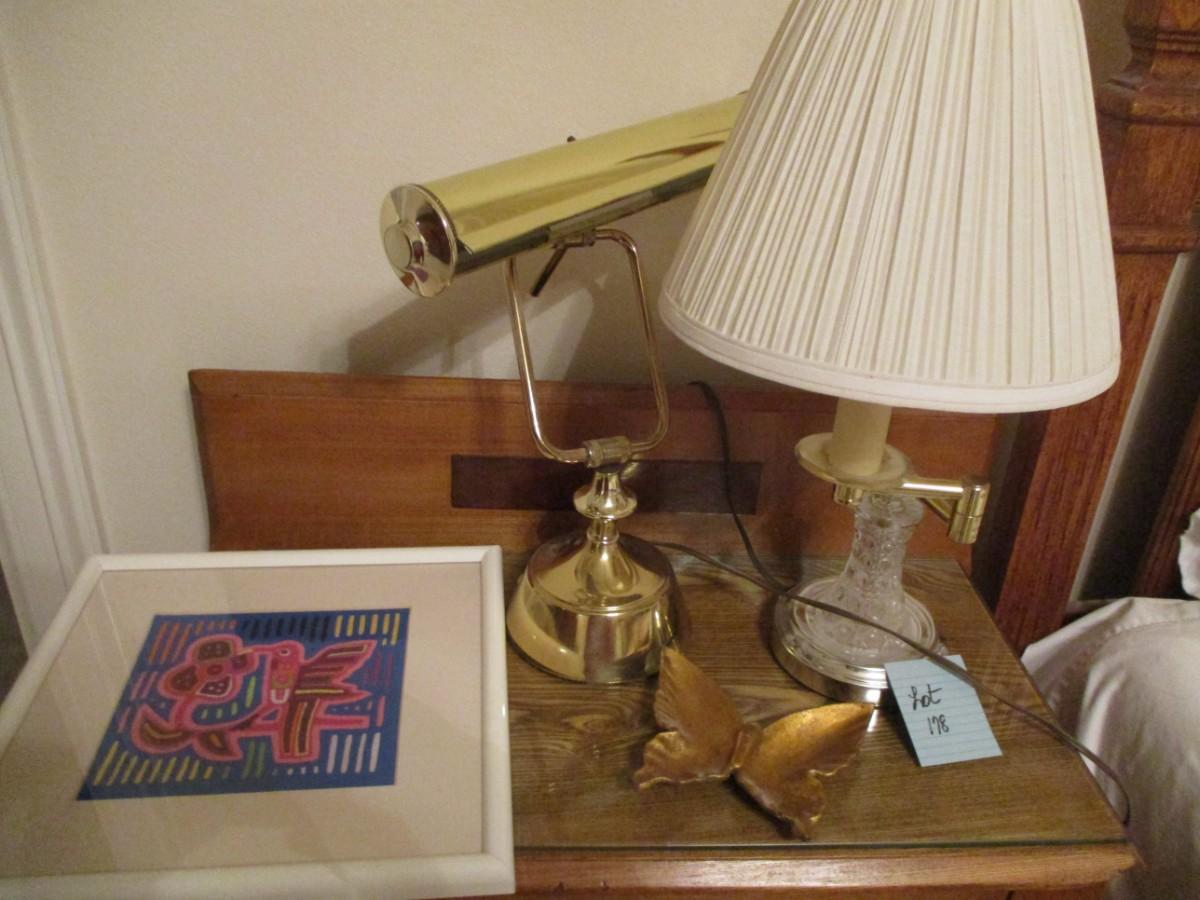 Framed Fabric art, Brass Desk Lamp, Butterfly Coin Tray Clear cut Glass lamp