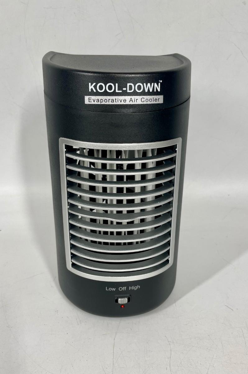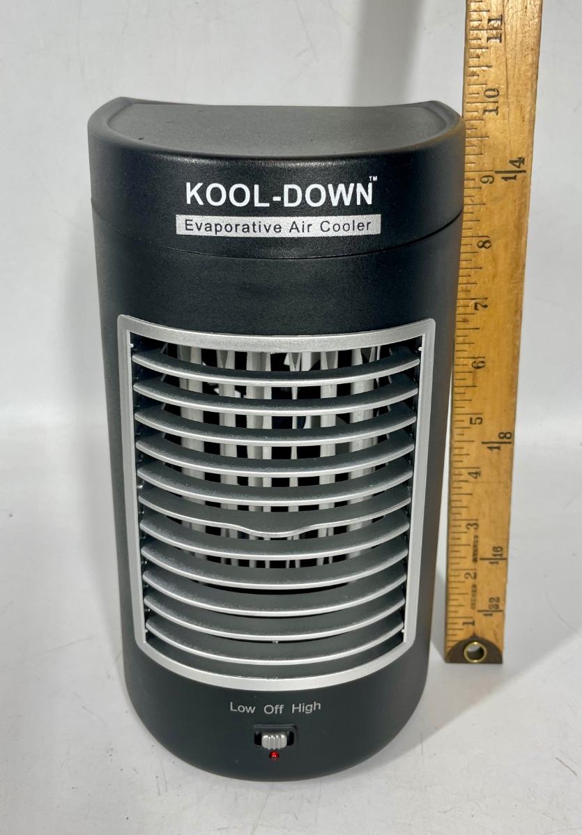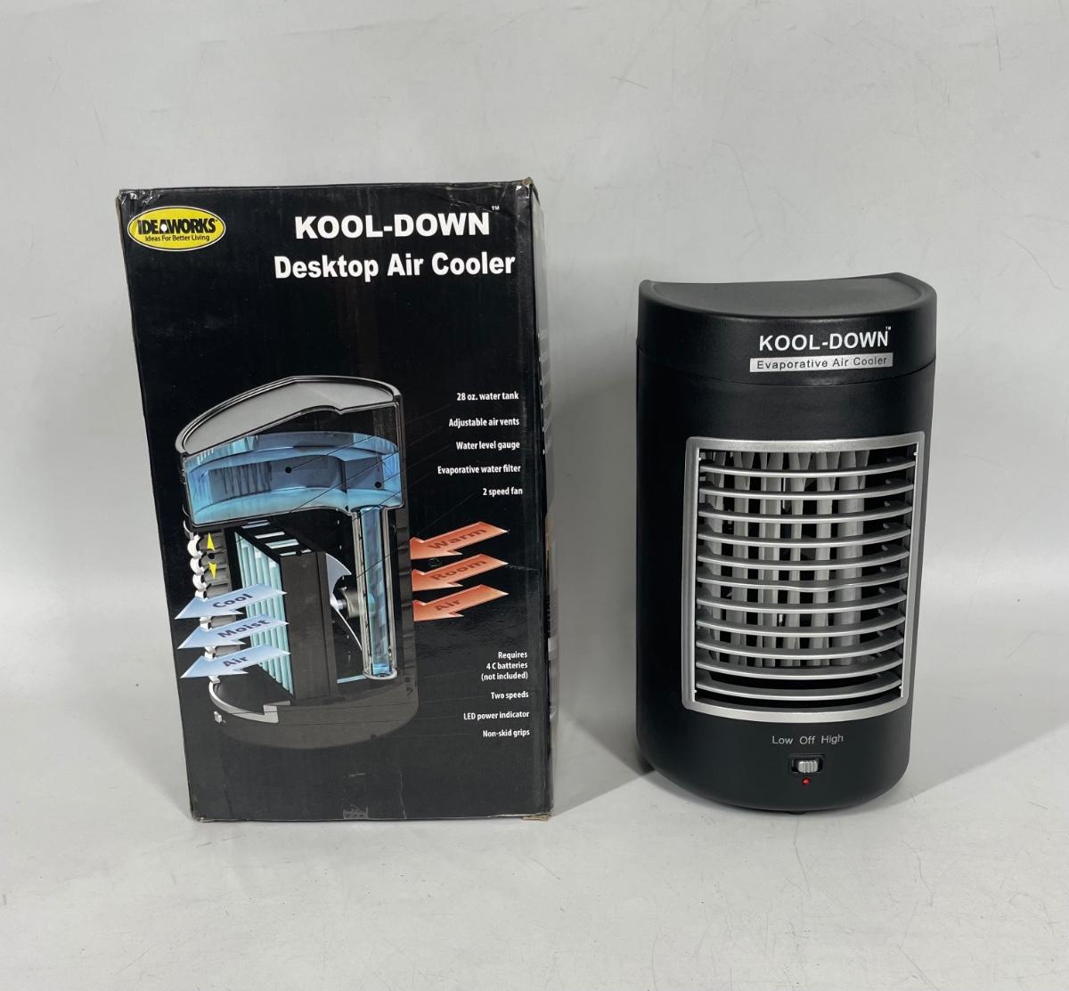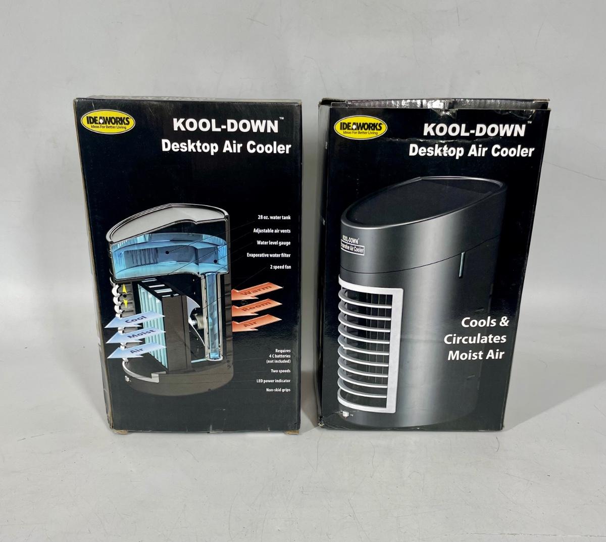 2 new Kool-Down desktop battery powered cooling fans. Works by circulating moist air. Has internal water tank that last for hours without refilling. Battery operation means they can be placed anywhere. One box has original unbroken tape seal, the other was opened but was unused. Open one was tested, works as expected.