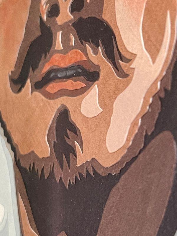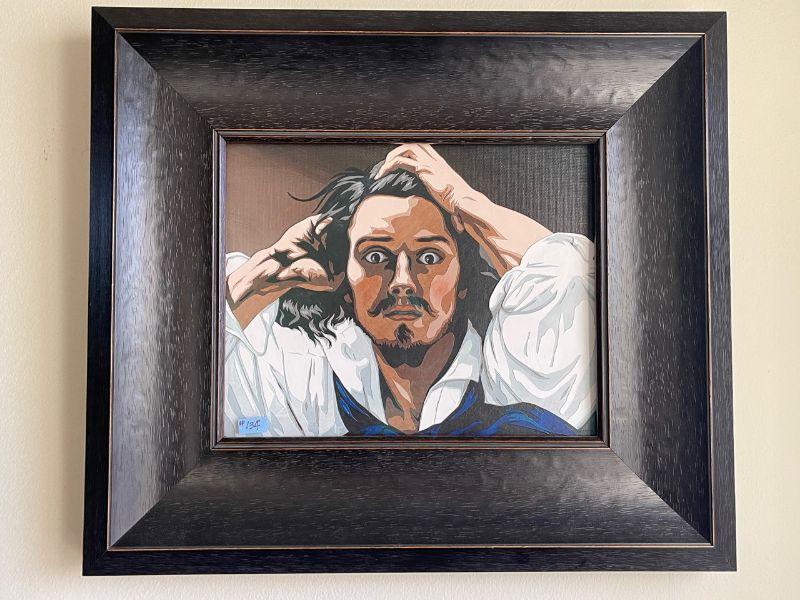 This is a hand-cut rendering of a famous self portrait by Gustav Courbet titled “The Desperate Man.” The French realist, who was 24 years old at the time, posed his famously overwrought face with wild eyes staring directly at the viewer, his hands tearing at his long, unkempt locks. The piece is framed in an appropriate dark wood frame.