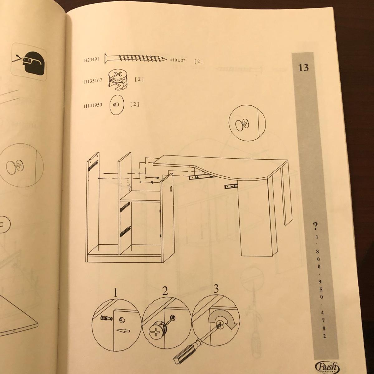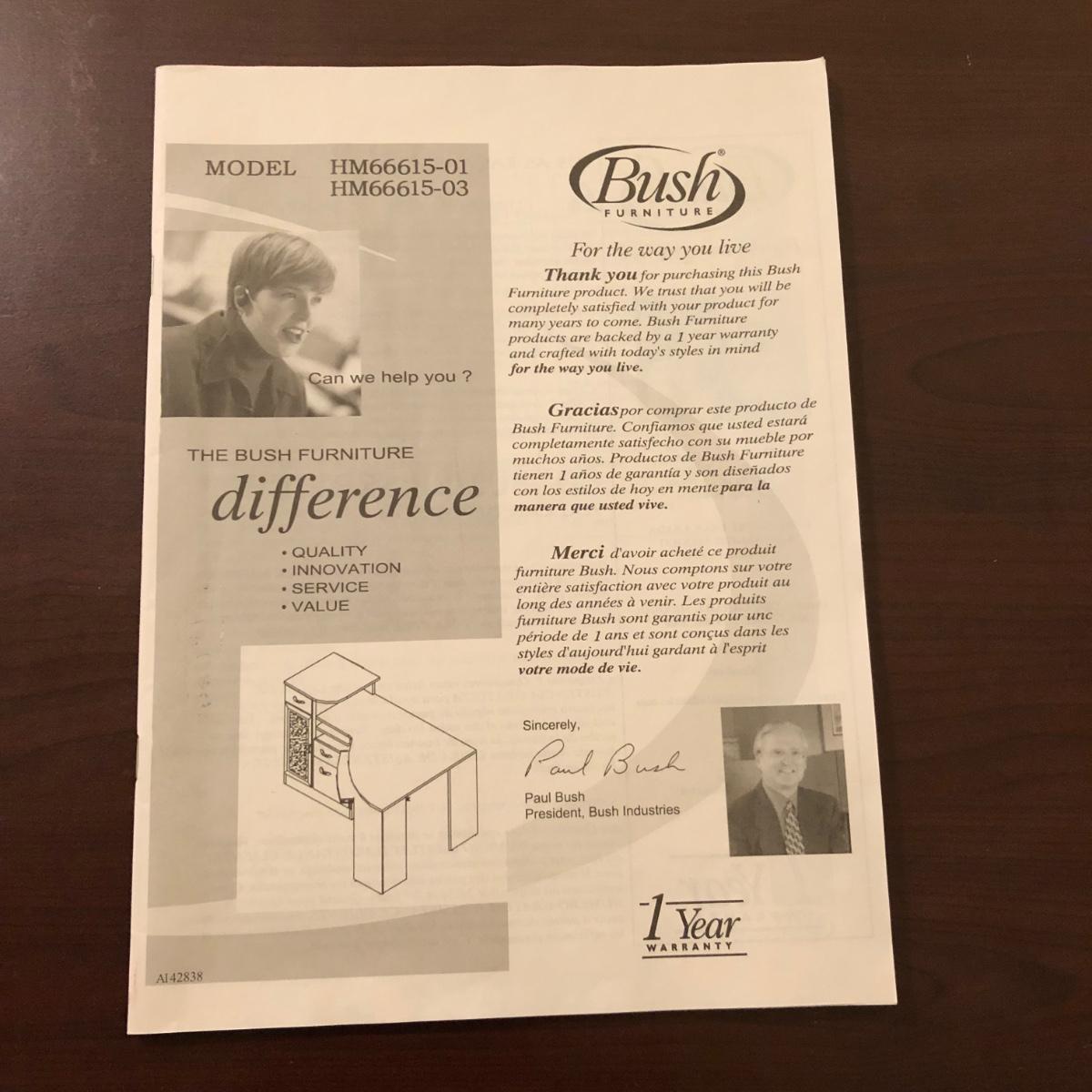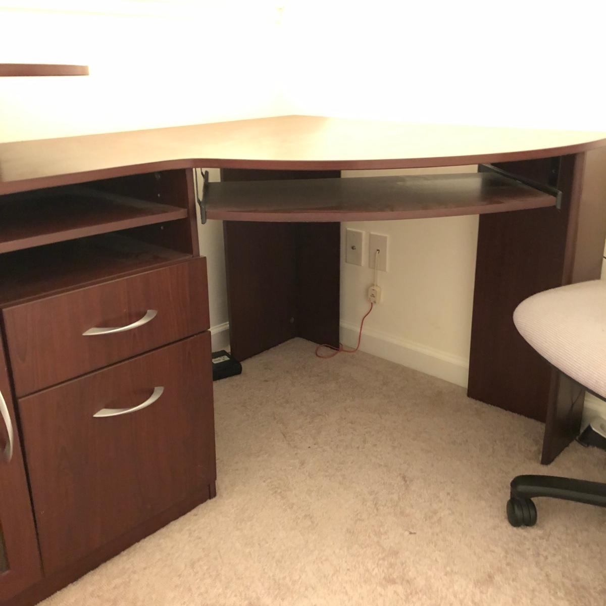 This brown corner desk by Bush Furniture comes with the assembly instructions and a grey office chair that rolled easily. The desk is made of brown particle board with veneer. The desk measures 60” x 35” x 38.5” and the chair measures 20.5 x 37.5 x 30” with a seat height of 18”. The middle drawer of the desk with the silver handle does not fully run on the tracks but can move easily in and out. Bring strong handy help to pickup. This desk will probably require disassembly to be brought down a flight of stairs. It's located on the second floor.