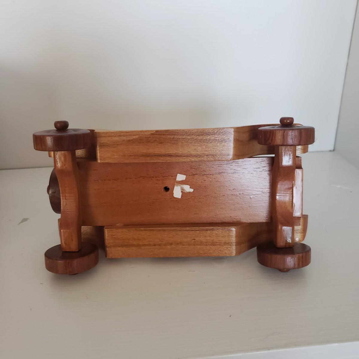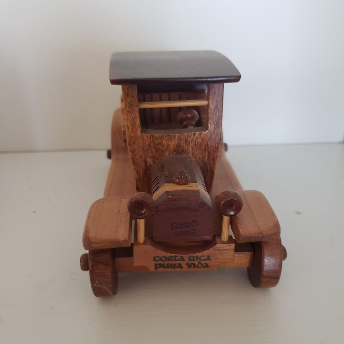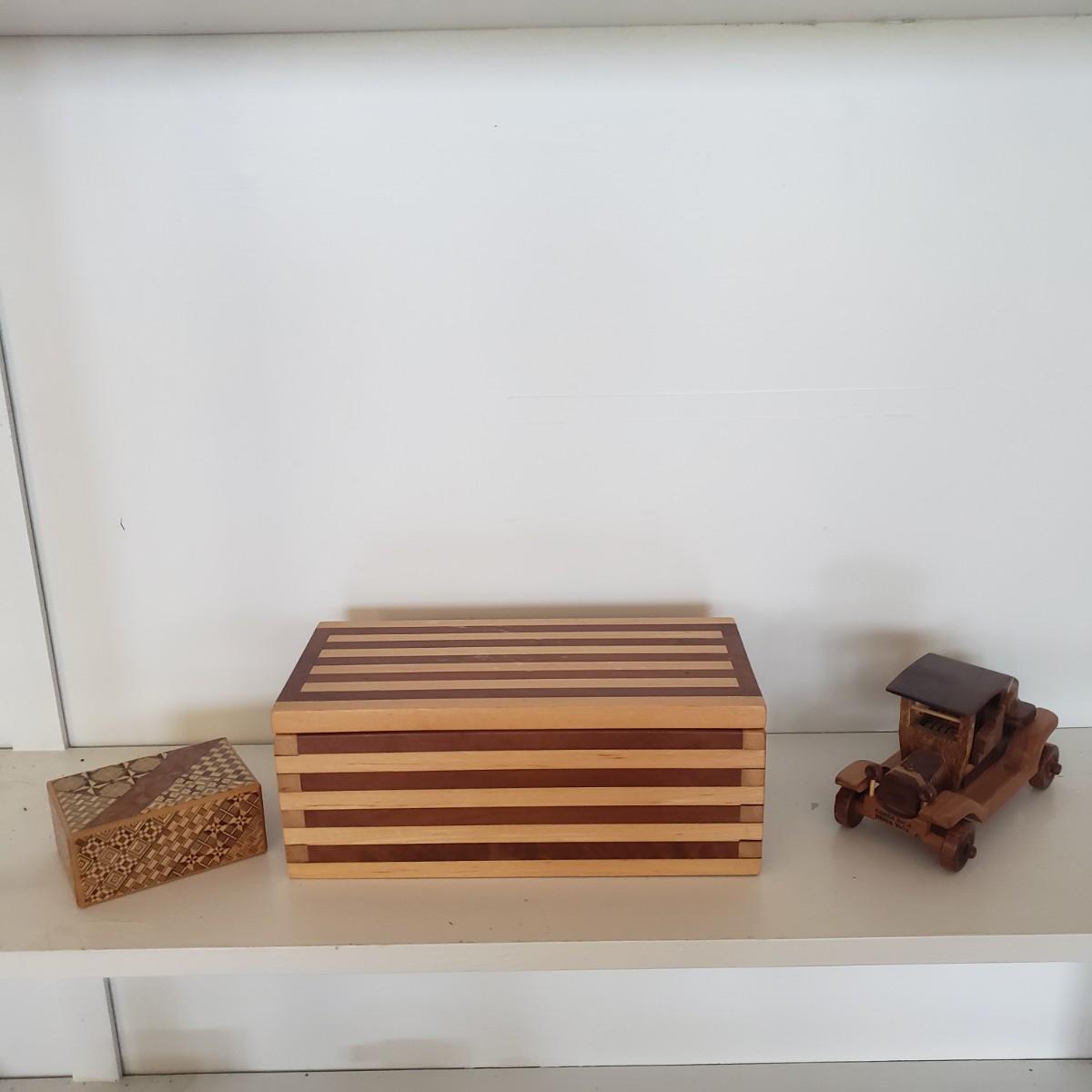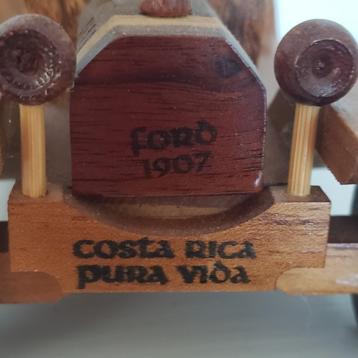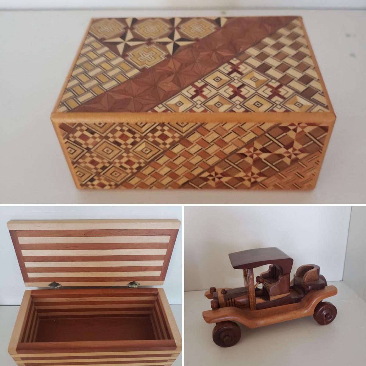 These three detailed, unique pieces are a treasure! The 1907 Ford marked Costa Rica Pura Vioa has such fine details, from the lights to seat. The truck measures 4" x 7" x 4"H. The two toned wood box is signed by the artist and has dovetailed sides. The box measures 12" x 6" x 5"H. There are some blemishes on the top, see picture. The small finely detailed, inlaid box has a secret door on the one side. It is hard to open, so we didn't want to risk pushing it open.