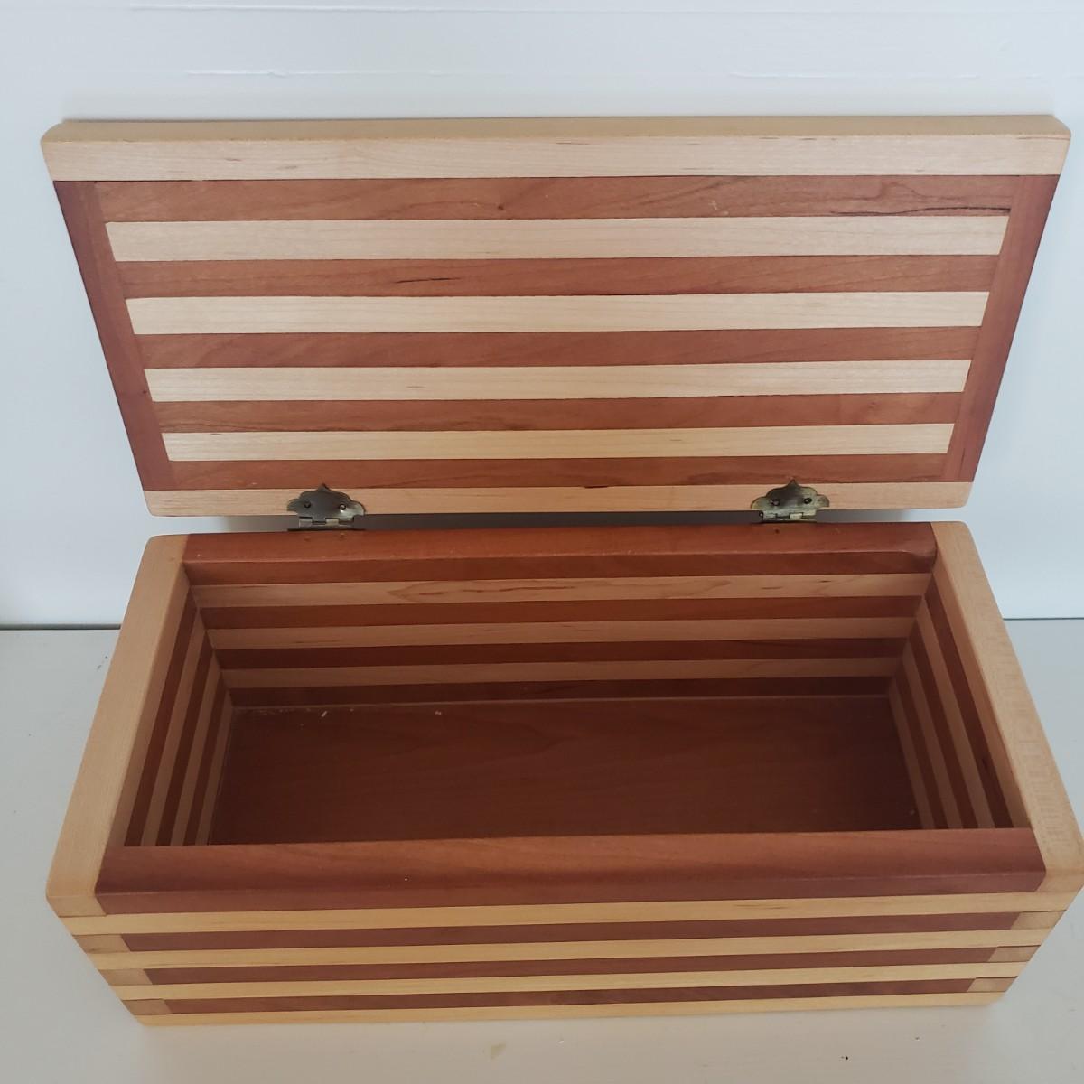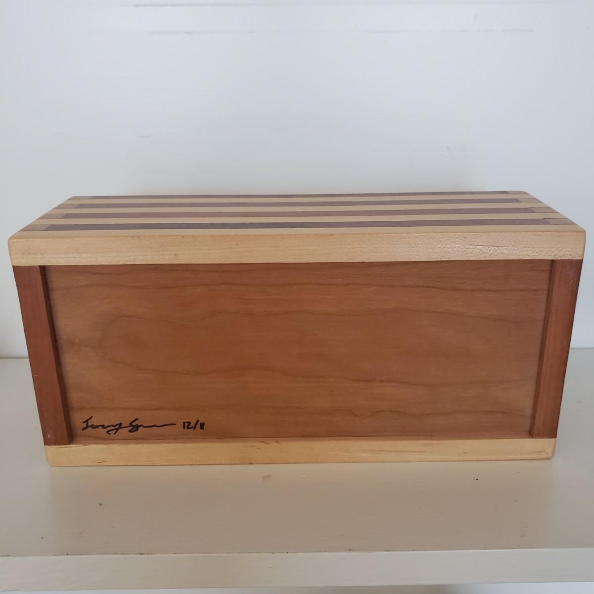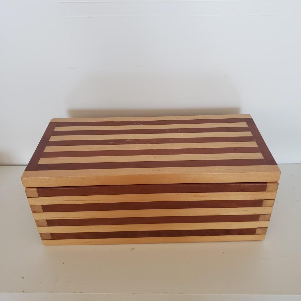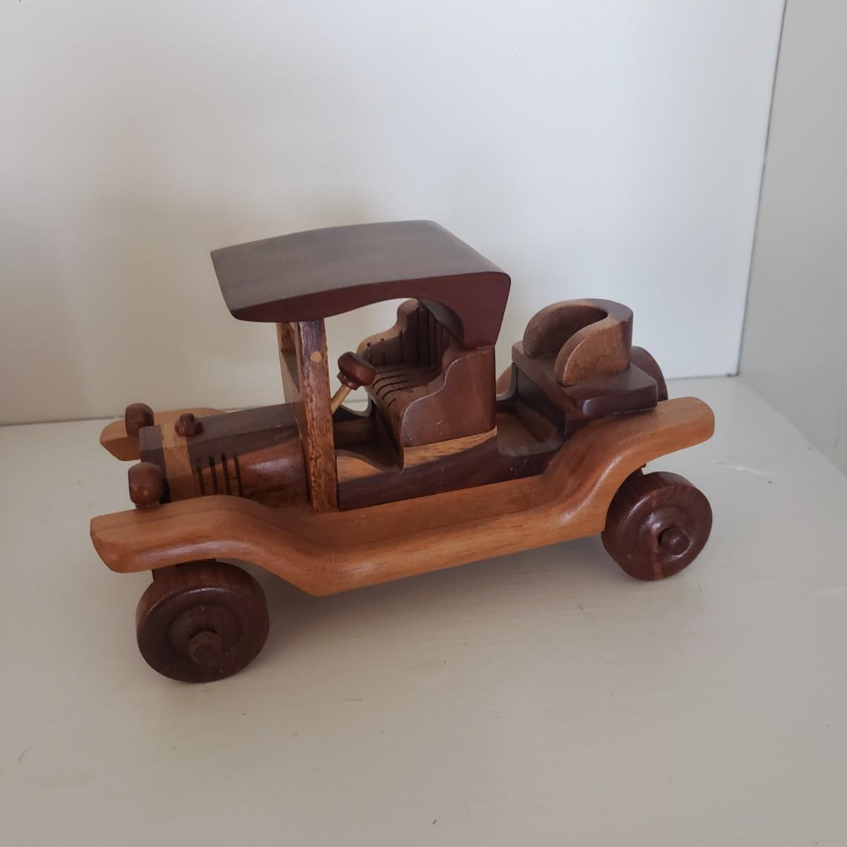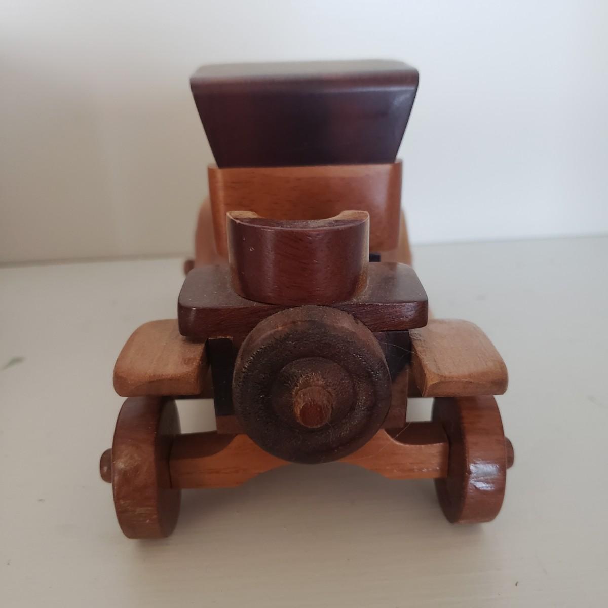 These three detailed, unique pieces are a treasure! The 1907 Ford marked Costa Rica Pura Vioa has such fine details, from the lights to seat. The truck measures 4" x 7" x 4"H. The two toned wood box is signed by the artist and has dovetailed sides. The box measures 12" x 6" x 5"H. There are some blemishes on the top, see picture. The small finely detailed, inlaid box has a secret door on the one side. It is hard to open, so we didn't want to risk pushing it open.