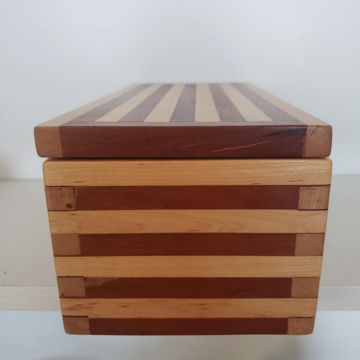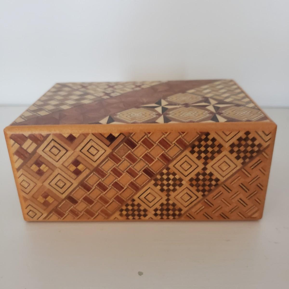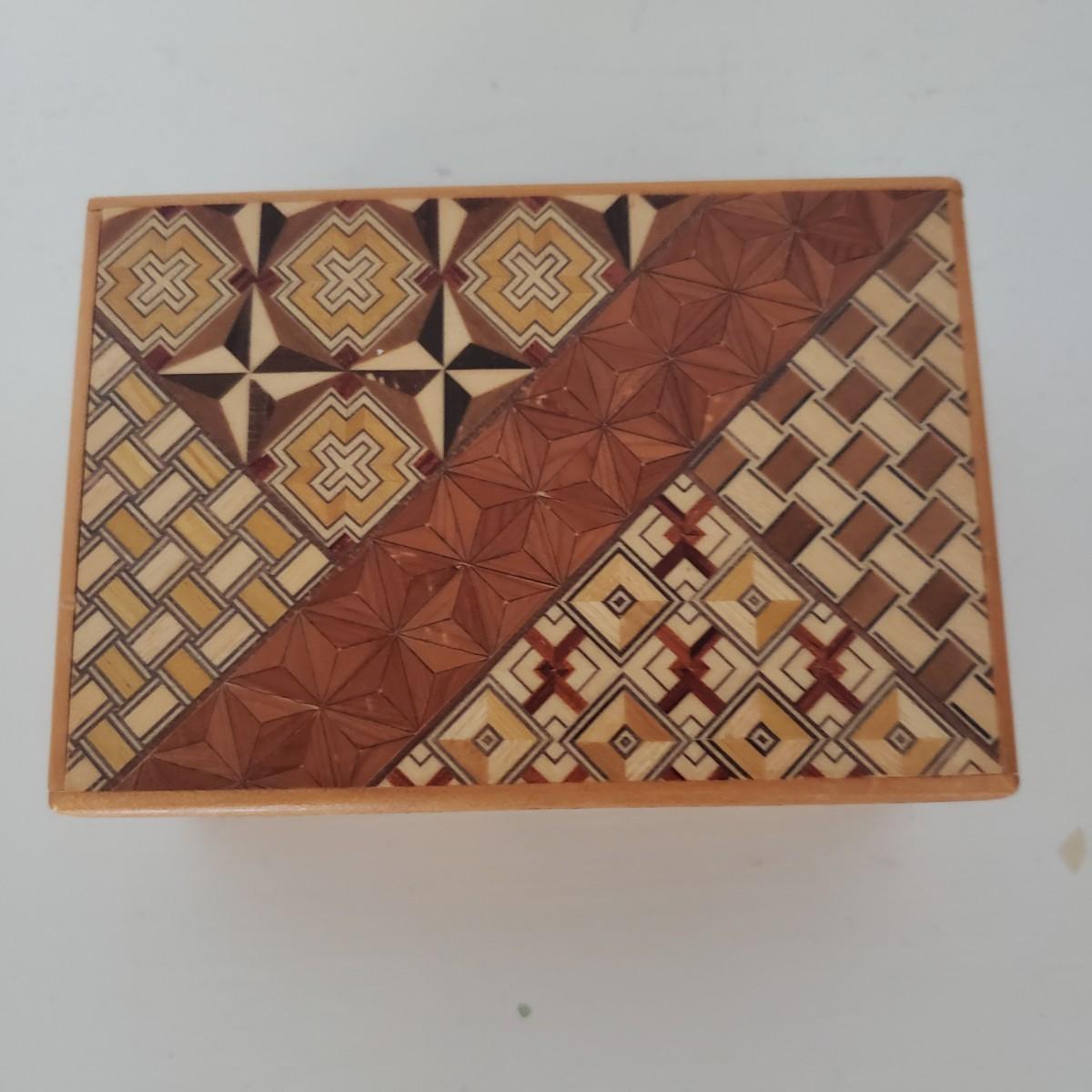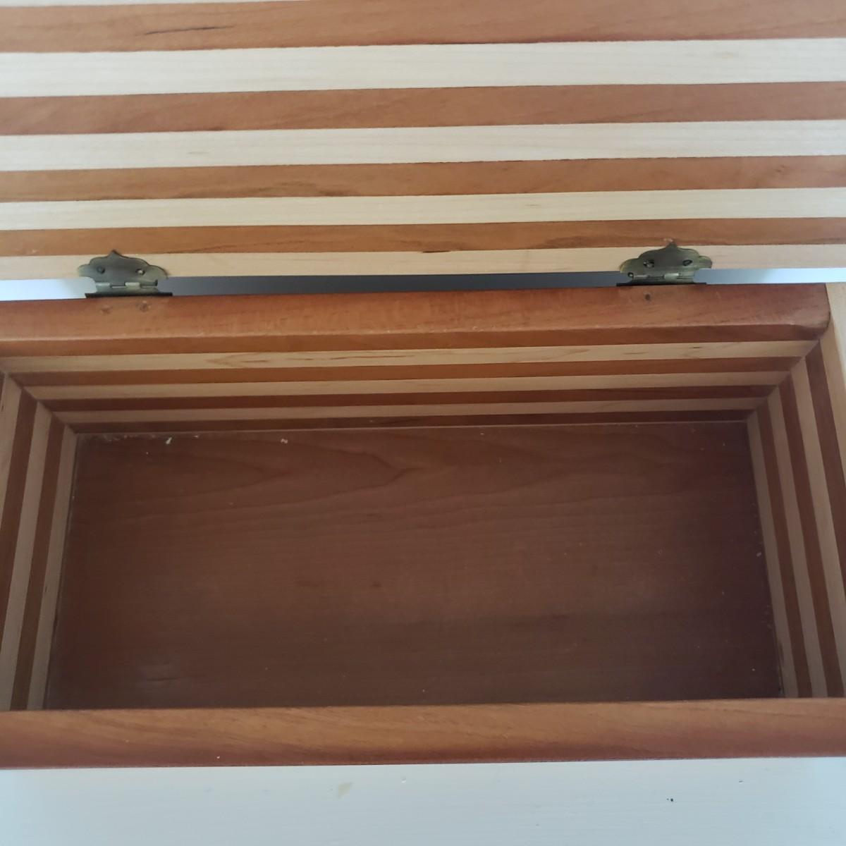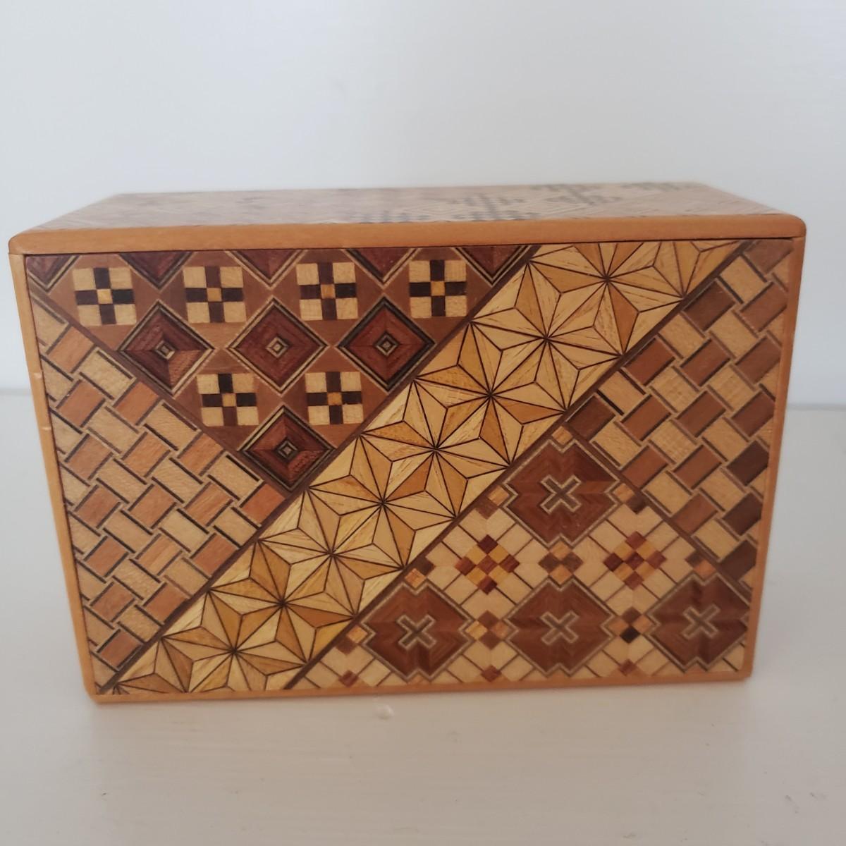 These three detailed, unique pieces are a treasure! The 1907 Ford marked Costa Rica Pura Vioa has such fine details, from the lights to seat. The truck measures 4" x 7" x 4"H. The two toned wood box is signed by the artist and has dovetailed sides. The box measures 12" x 6" x 5"H. There are some blemishes on the top, see picture. The small finely detailed, inlaid box has a secret door on the one side. It is hard to open, so we didn't want to risk pushing it open.