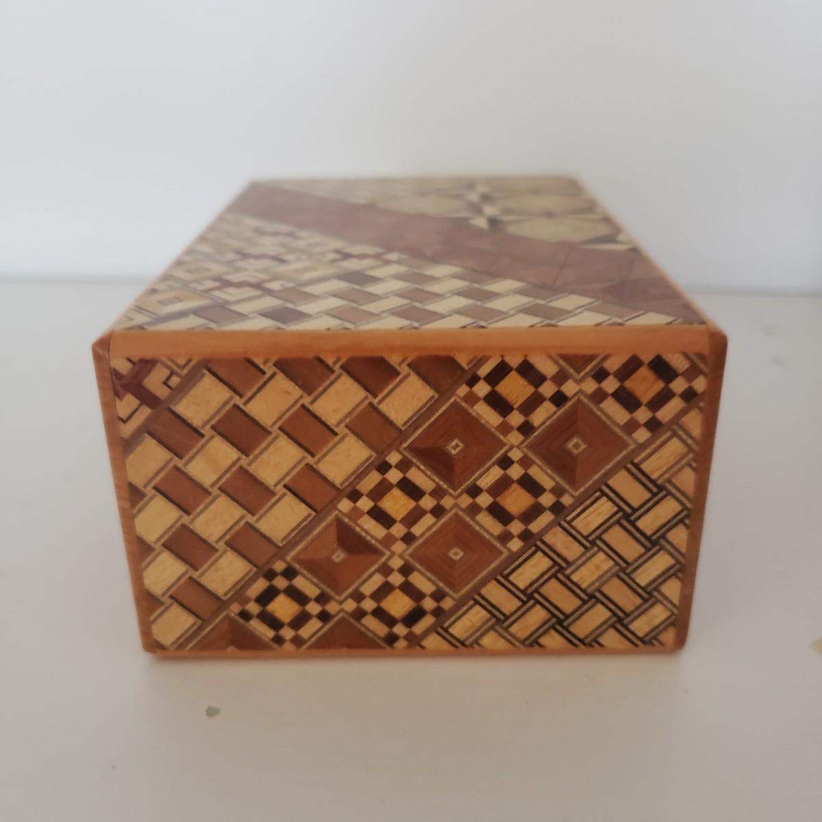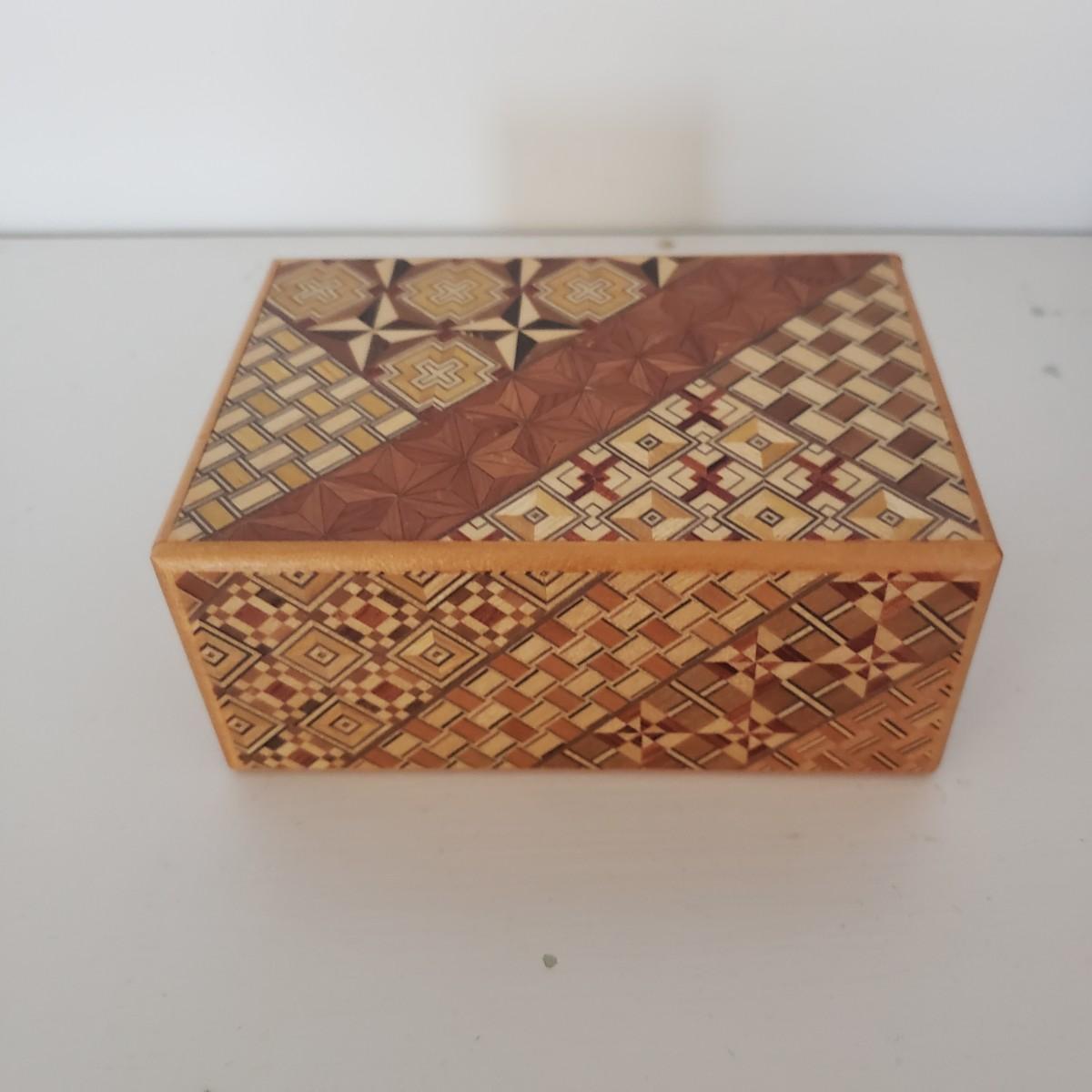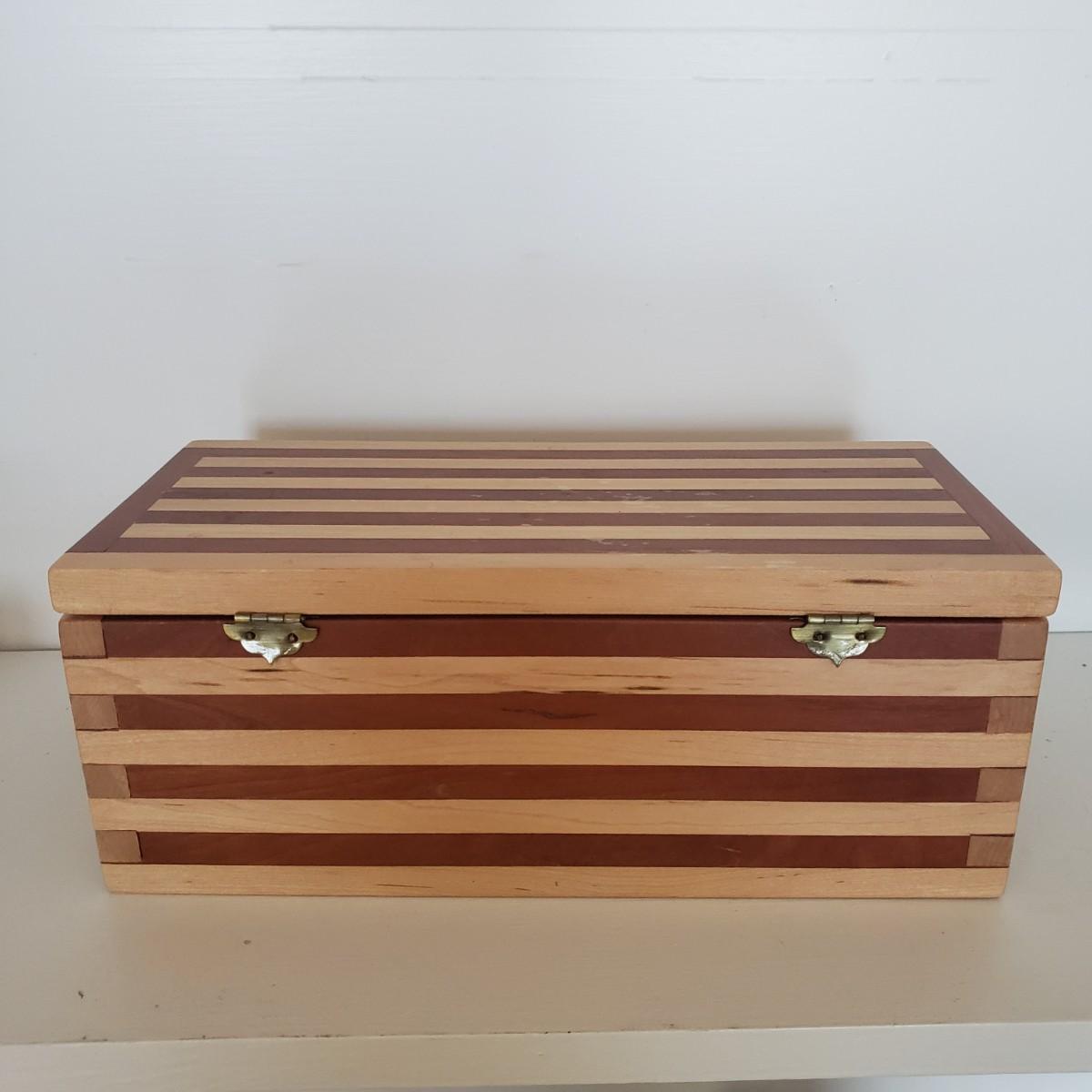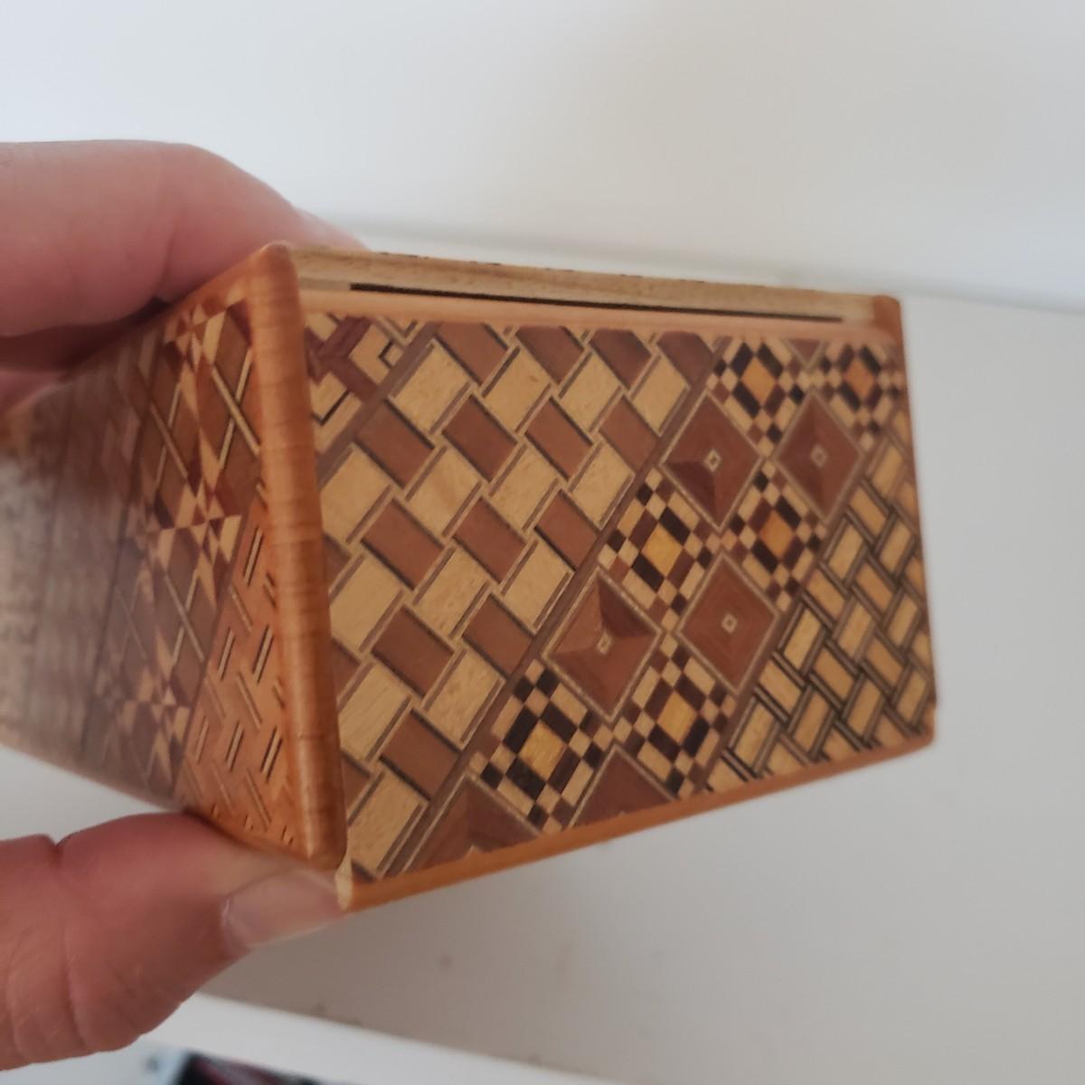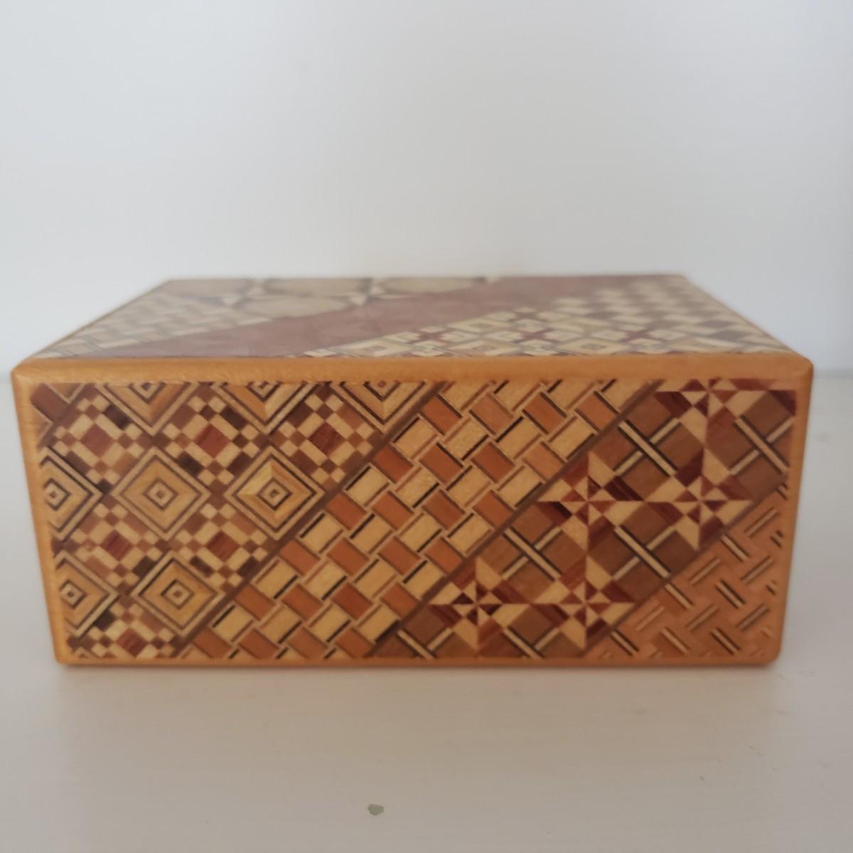 These three detailed, unique pieces are a treasure! The 1907 Ford marked Costa Rica Pura Vioa has such fine details, from the lights to seat. The truck measures 4" x 7" x 4"H. The two toned wood box is signed by the artist and has dovetailed sides. The box measures 12" x 6" x 5"H. There are some blemishes on the top, see picture. The small finely detailed, inlaid box has a secret door on the one side. It is hard to open, so we didn't want to risk pushing it open.