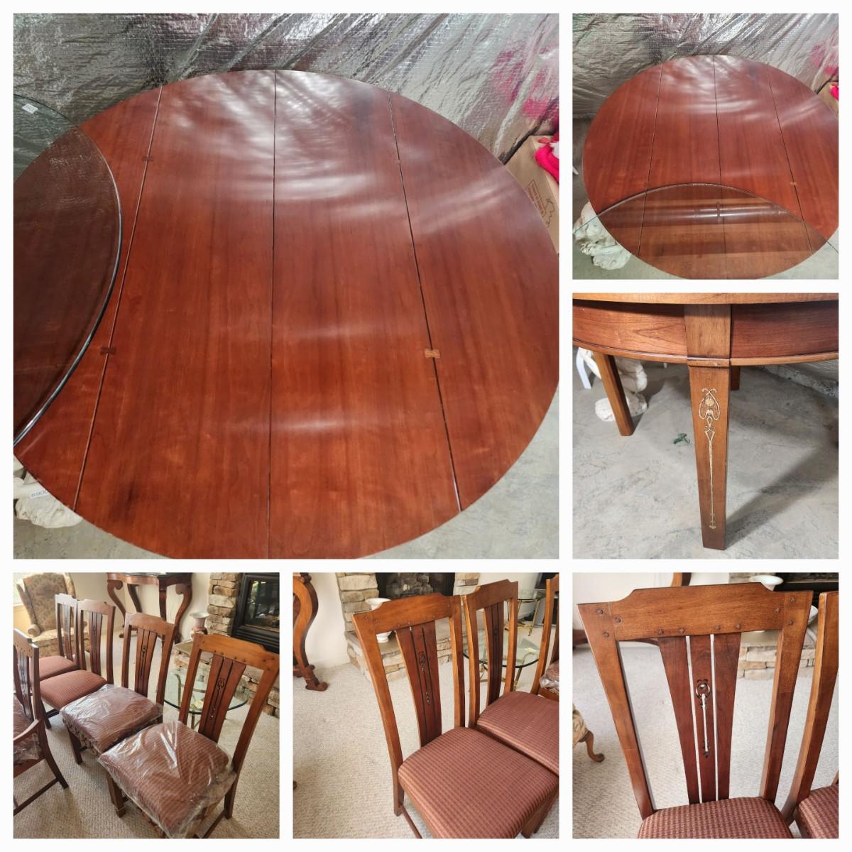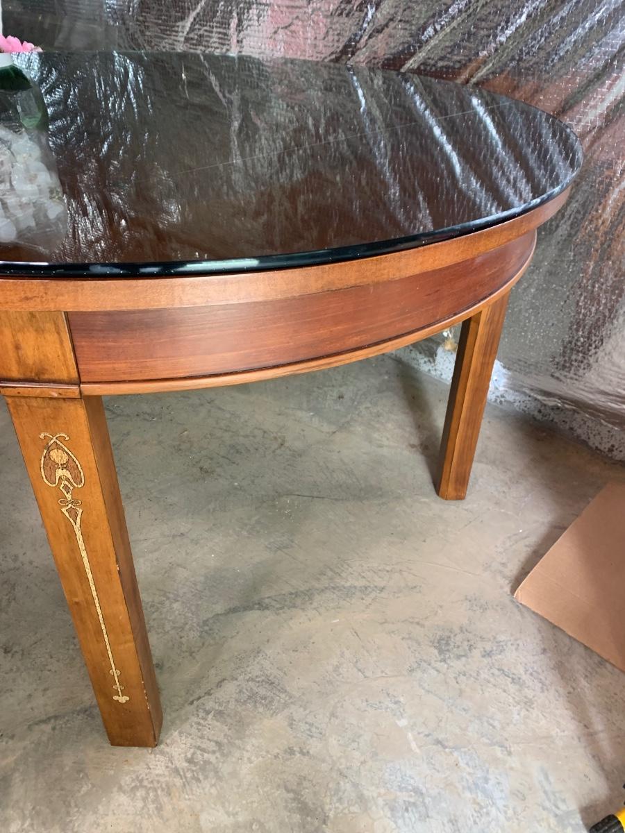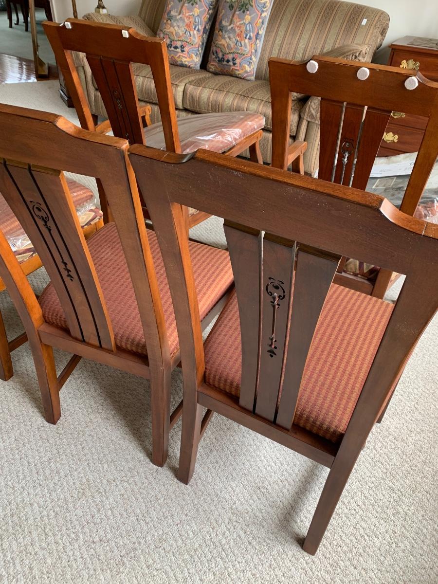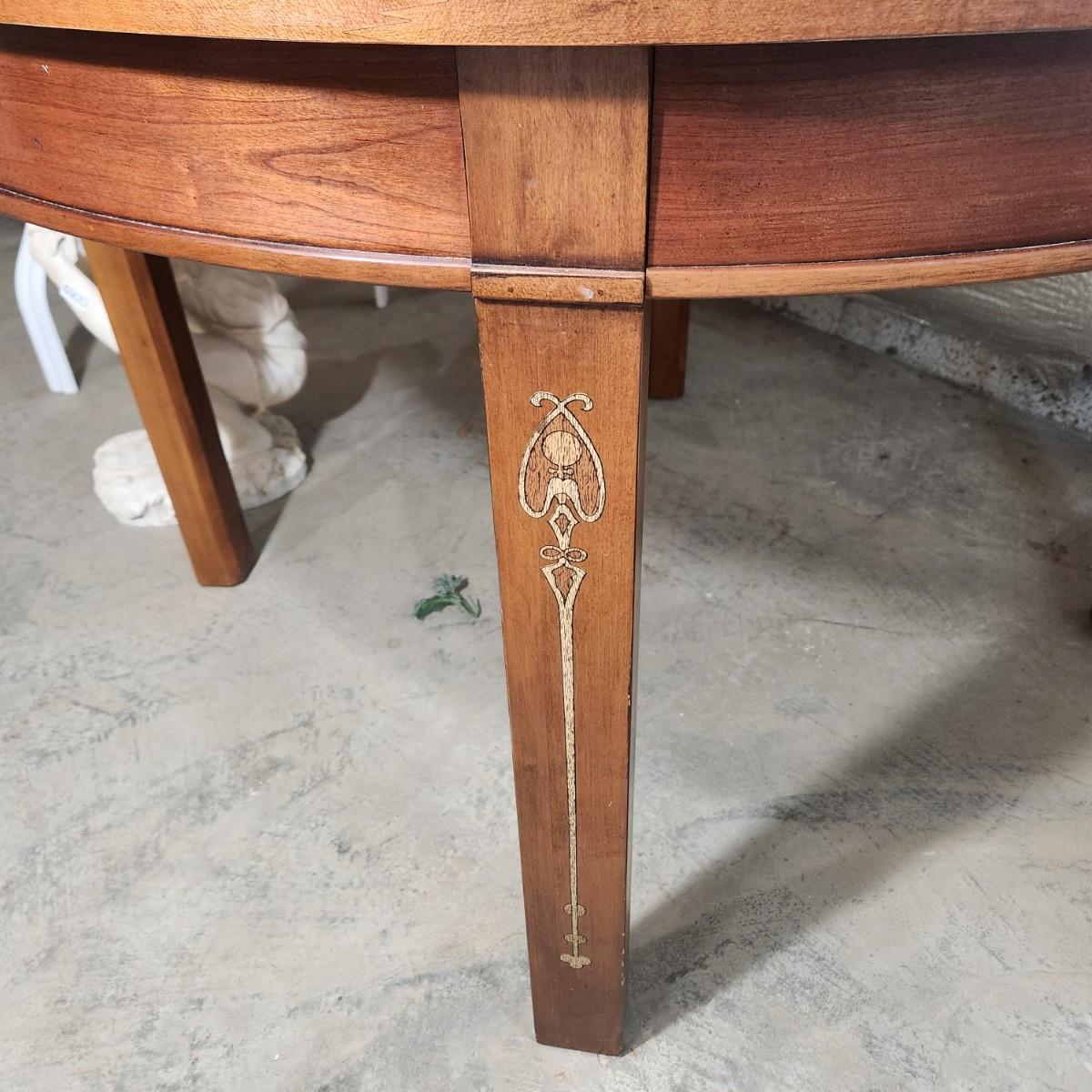 Detailed Inlaid Clean Drexel Dining Table, Leaf, Chairs, NEW Seats/Fabric
