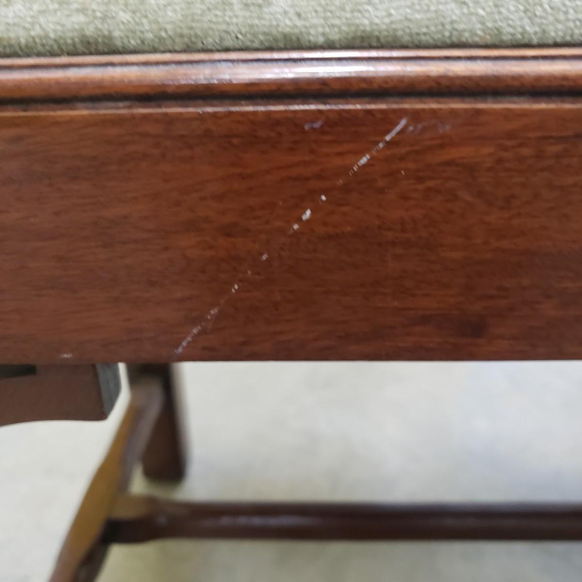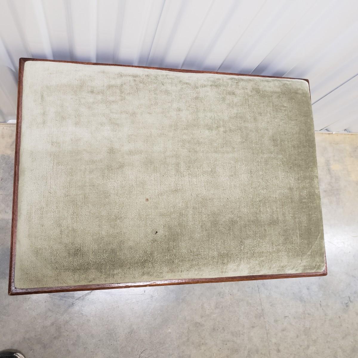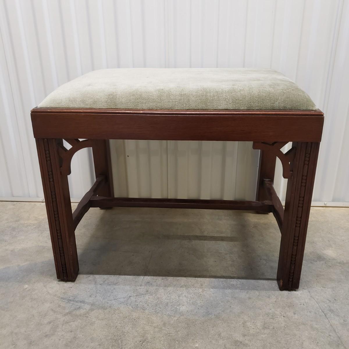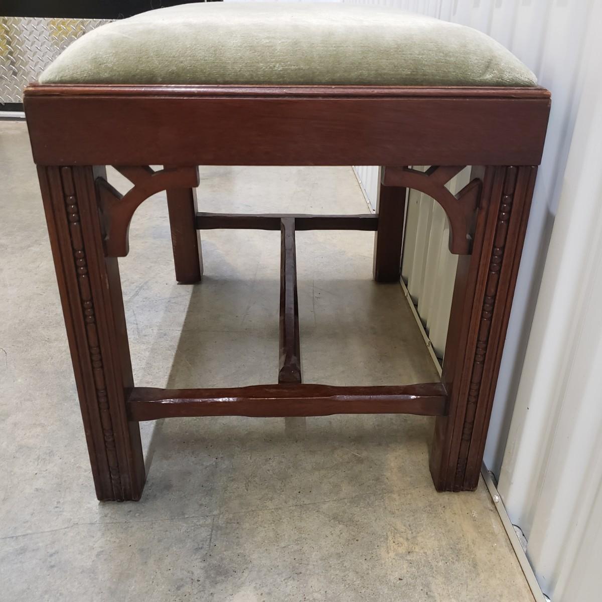 This solid wood framed stool measures 24"x17"x18" and has a light sage green cushion on the top. There is a couple of spots on the fabric as seen in the pictures and a few marks on the legs, but overall it appears solid.