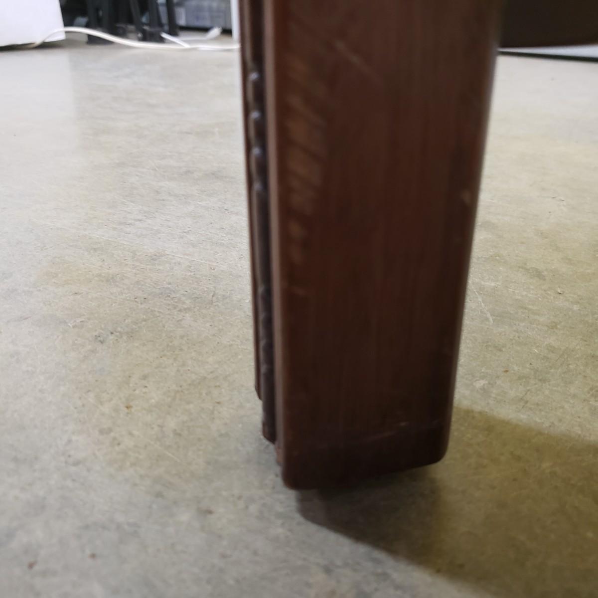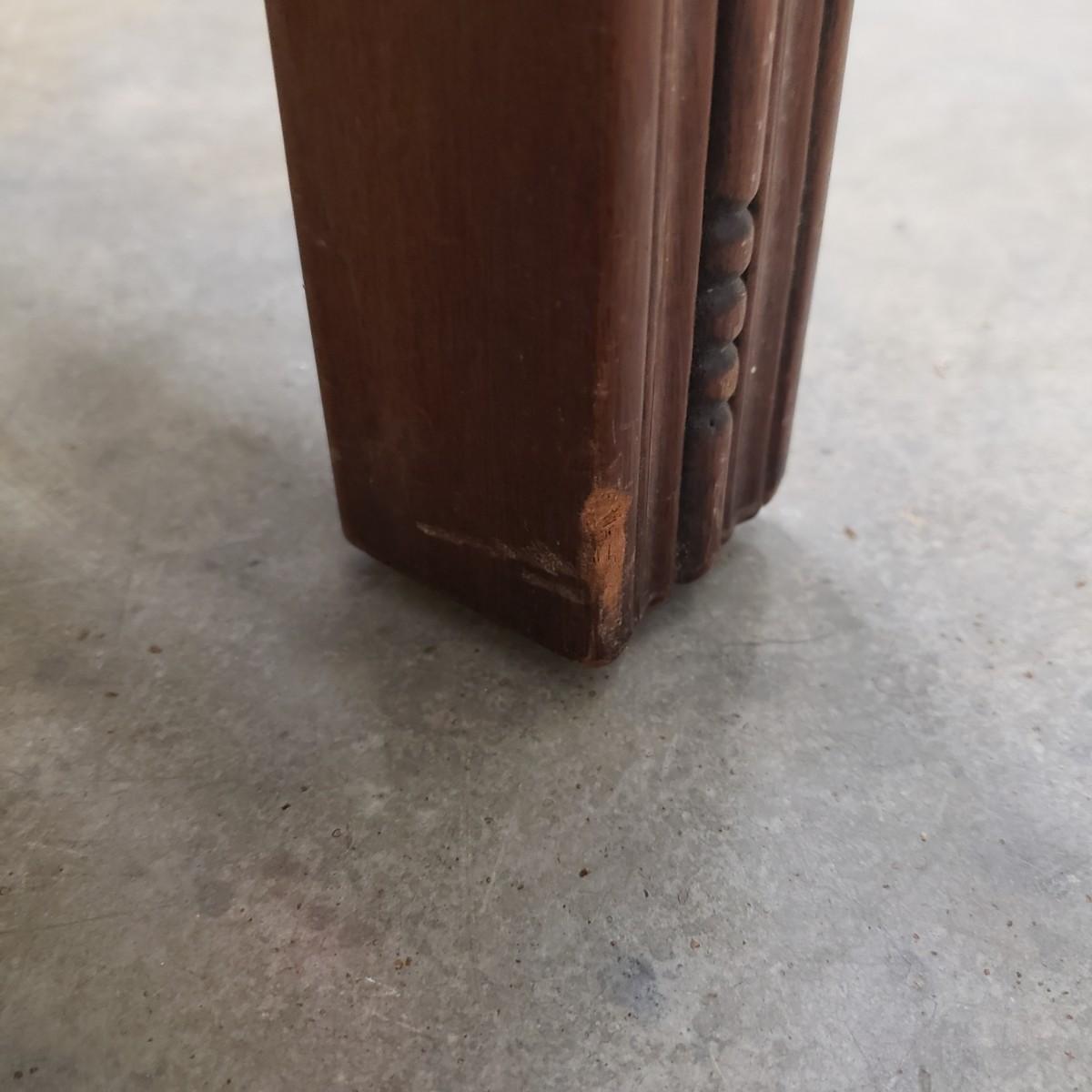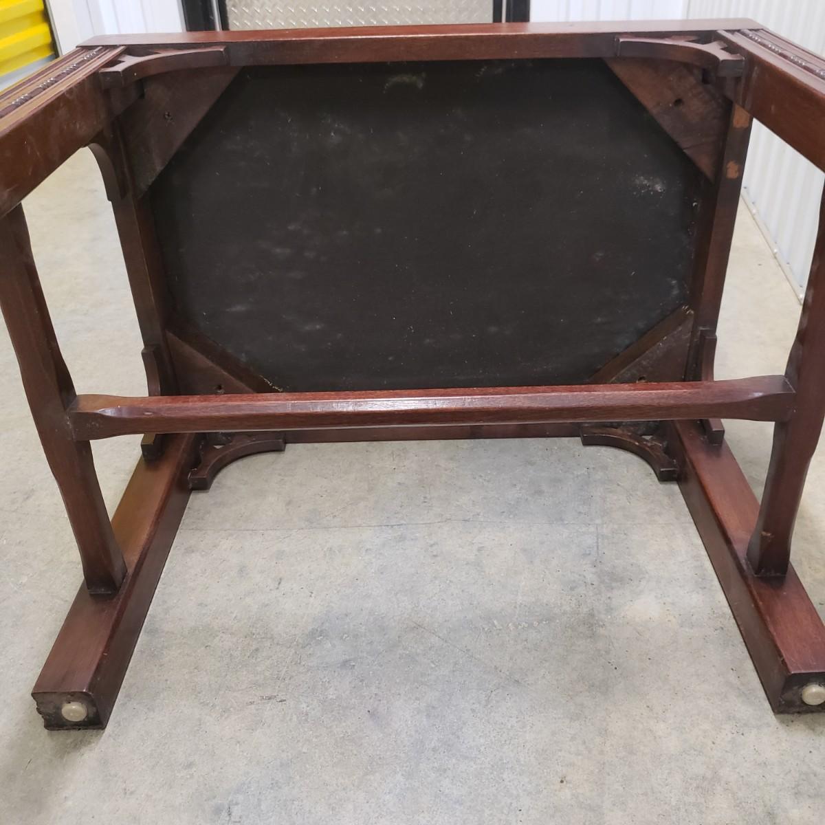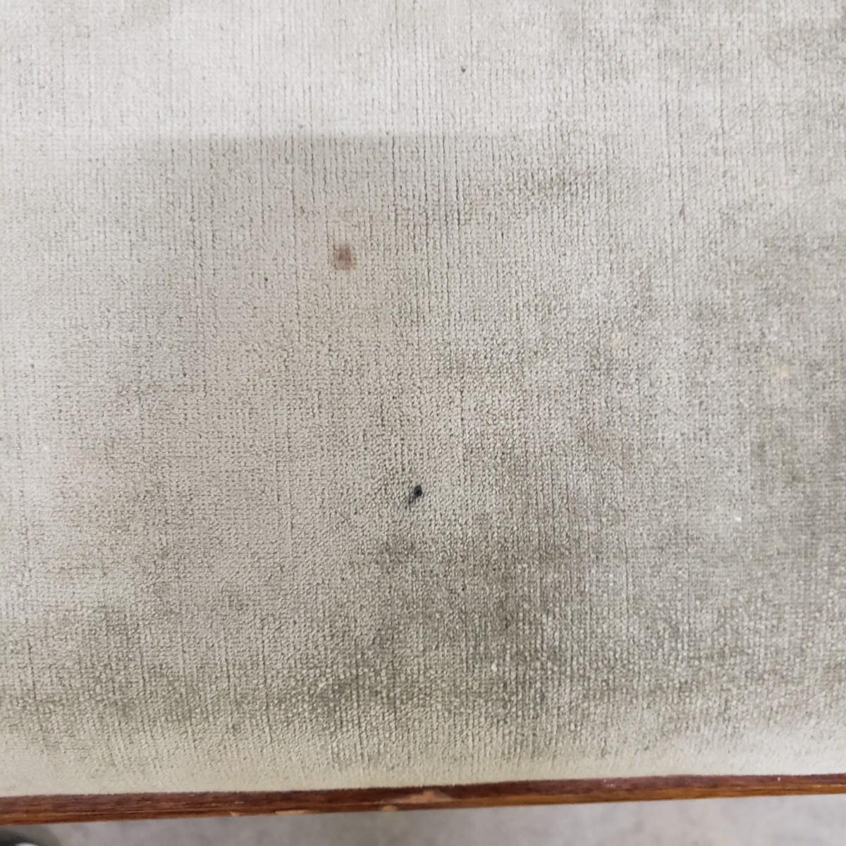 This solid wood framed stool measures 24"x17"x18" and has a light sage green cushion on the top. There is a couple of spots on the fabric as seen in the pictures and a few marks on the legs, but overall it appears solid.
