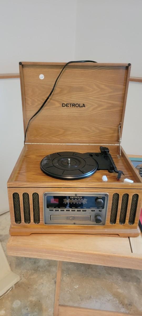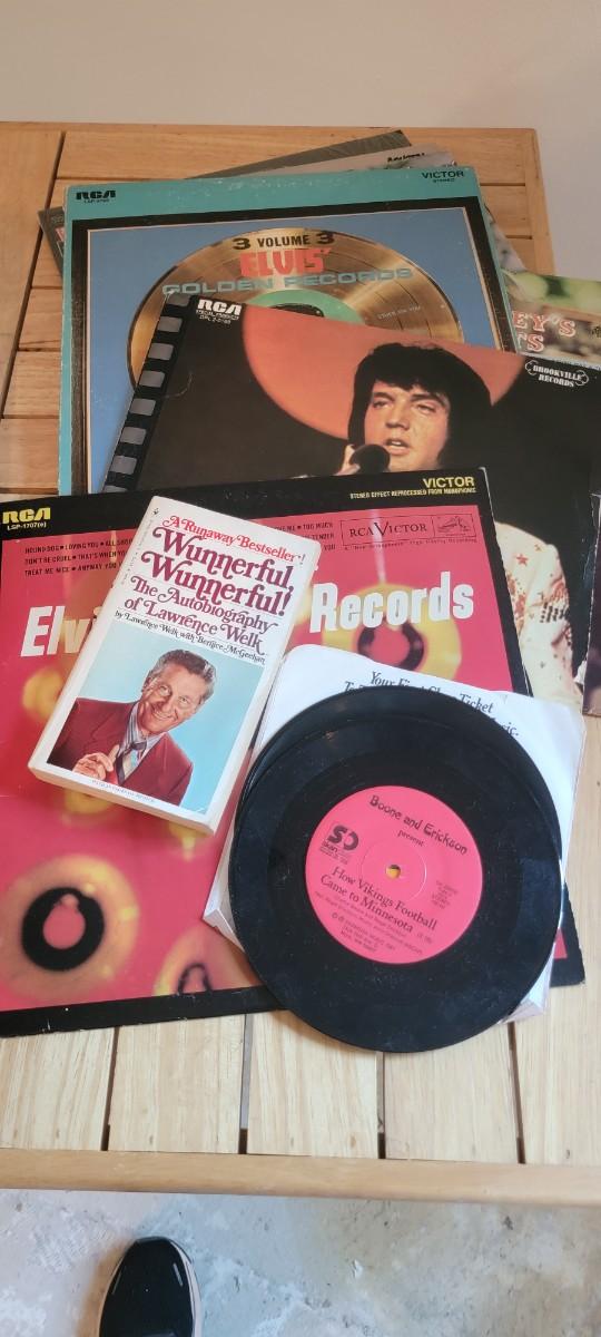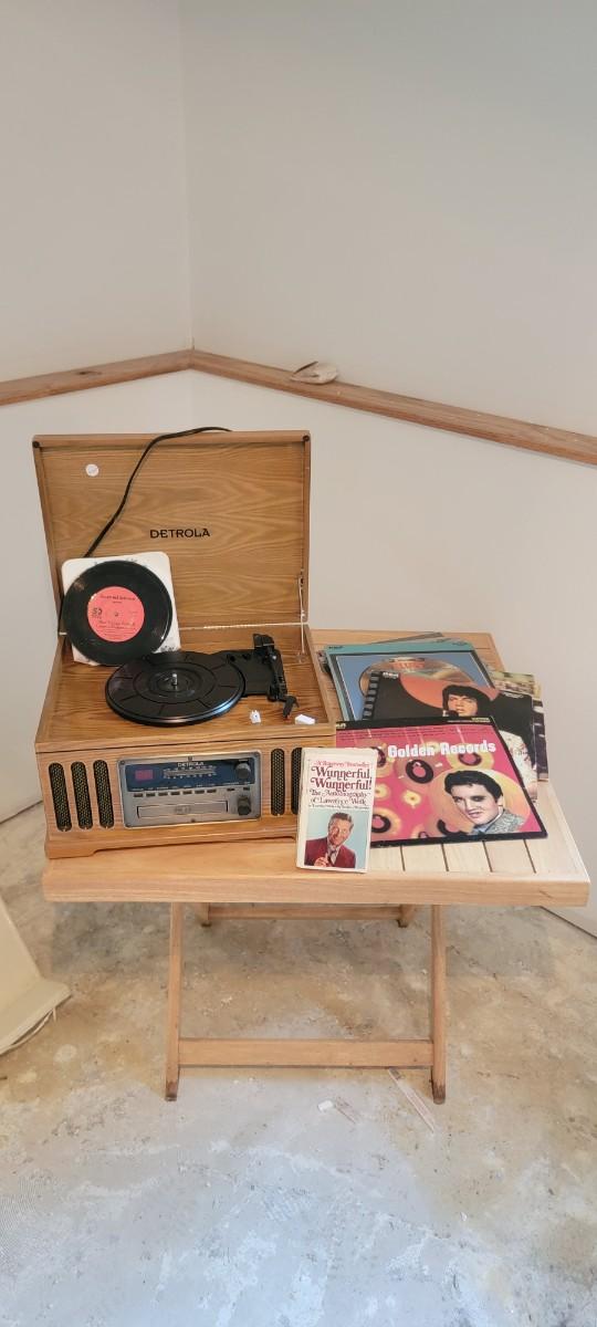 Detrola turntable/radio/disc, vinyl includes 3 Elvis; Wunnerful. Wonderful Lawrence Welk book