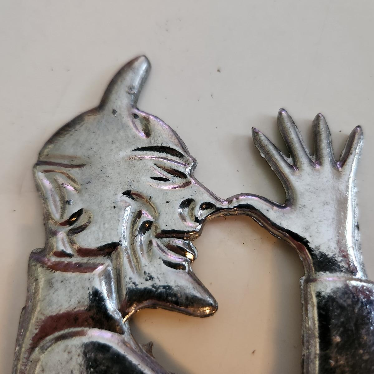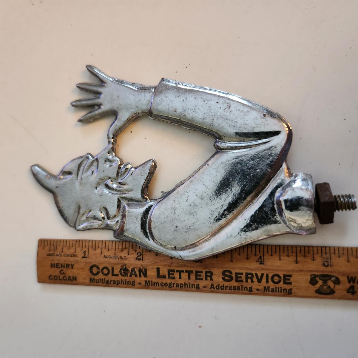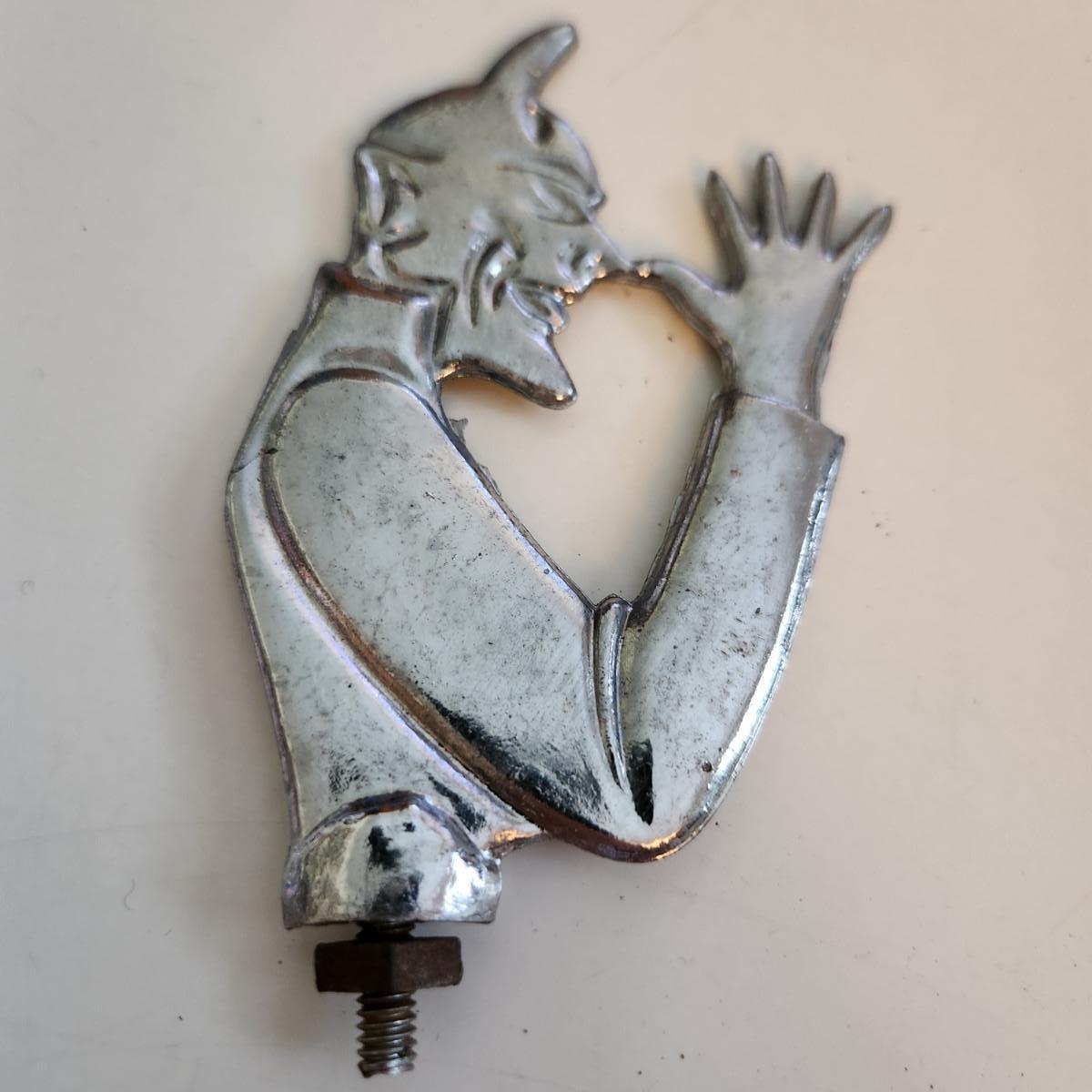 This auction lot is for a Devil Hood Ornament. The devil you say - as he razzes you back. This nifty find would look perfect mounted on so many things - from your car or bike to who knows what. Chrome plated metal with screw base. See photo for size. Where you gonna find it.
