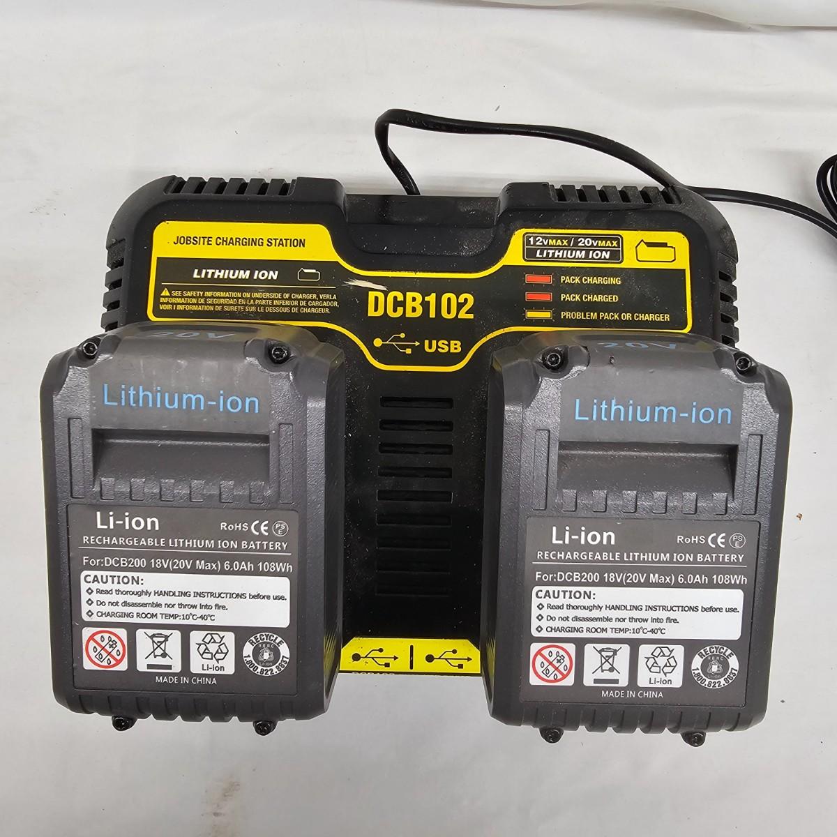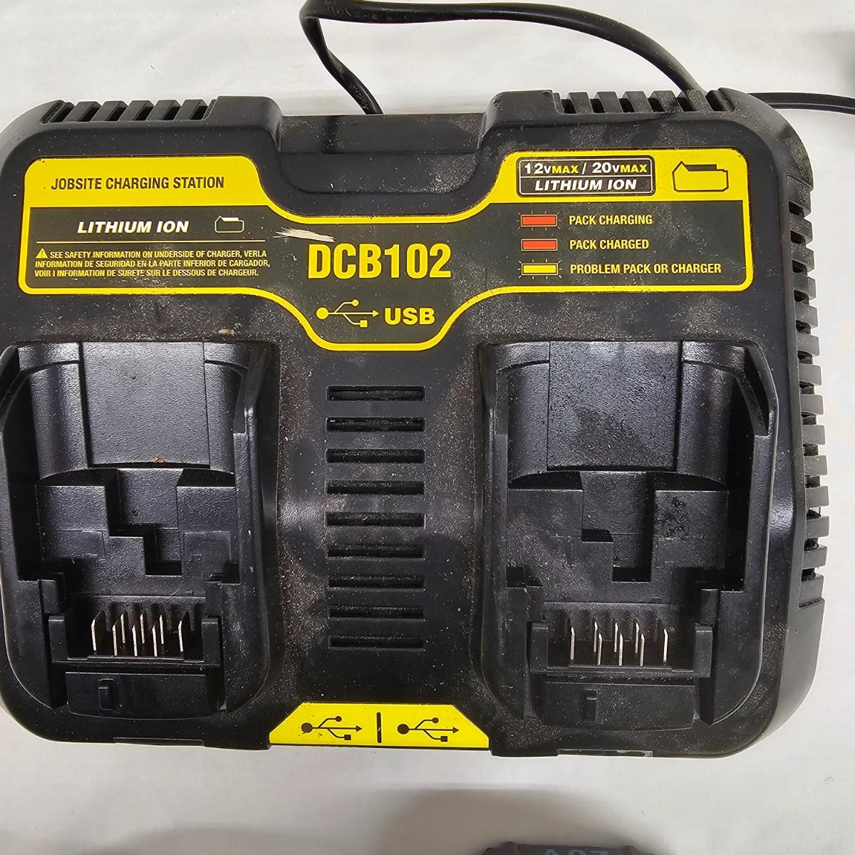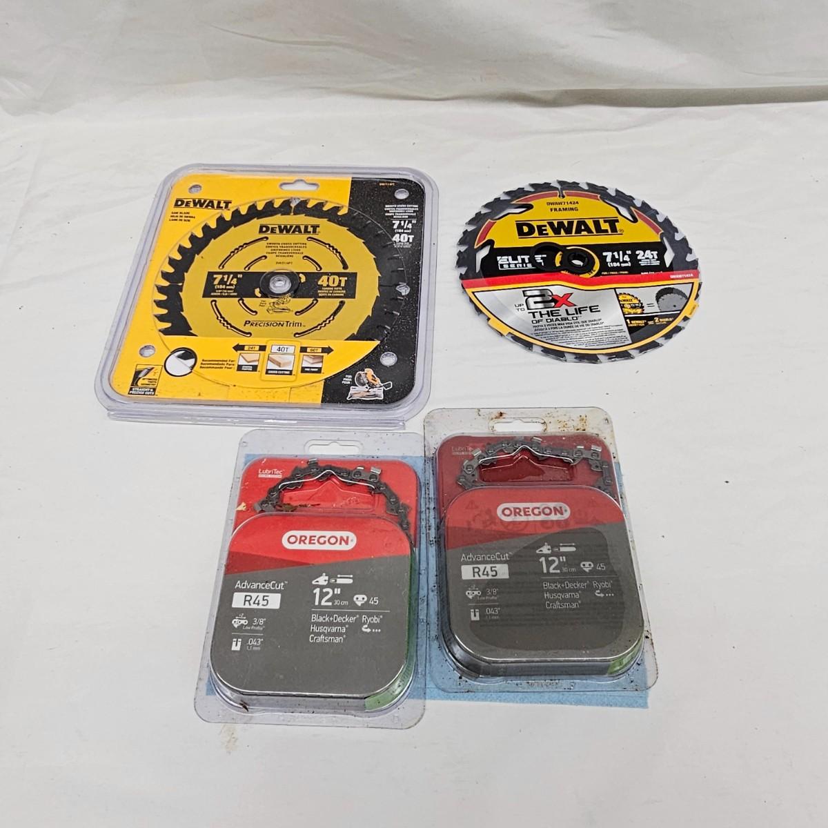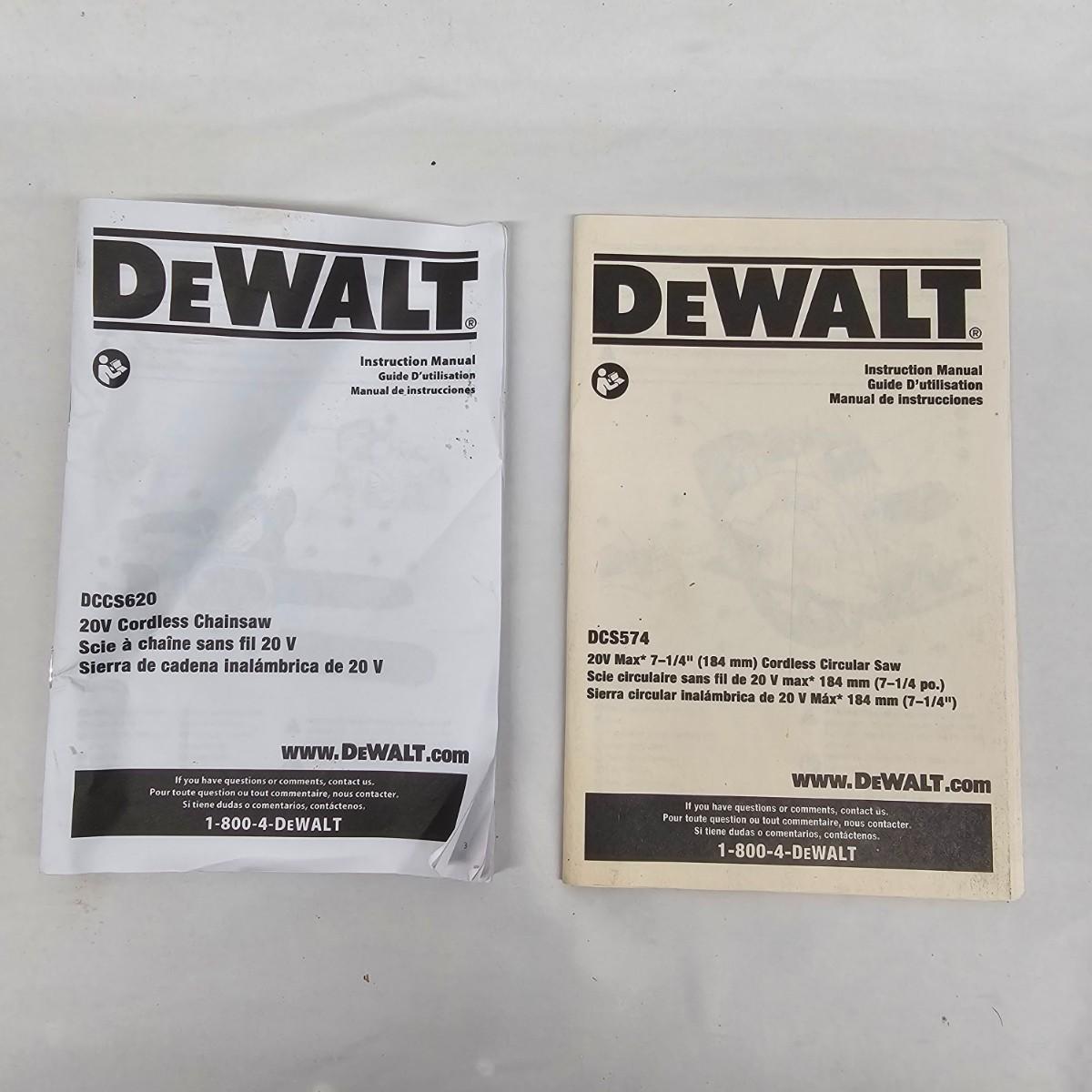 DeWalt cordless cutting duo, a 12" chainsaw and a 7 1/4" circular saw. Both use 20V batteries, included. Two extra Oregon chains and manual. Circular saw comes with two new blades in cases and manual. Also included is a DCB102 double charger with USB ports as well. Both units powered on when tested. See photos for details. Local pickup only.