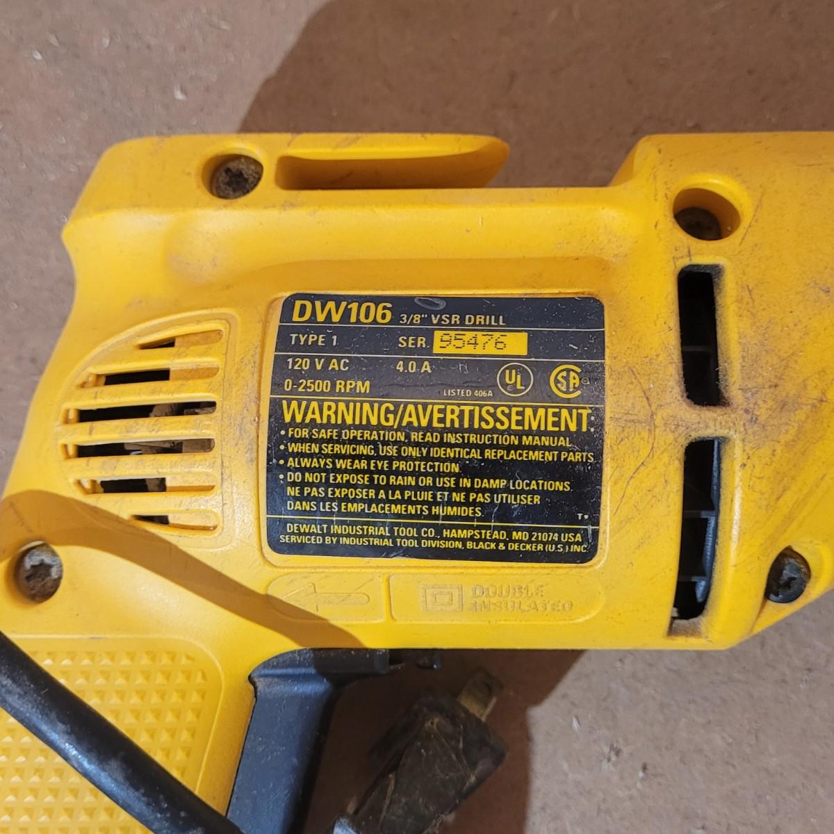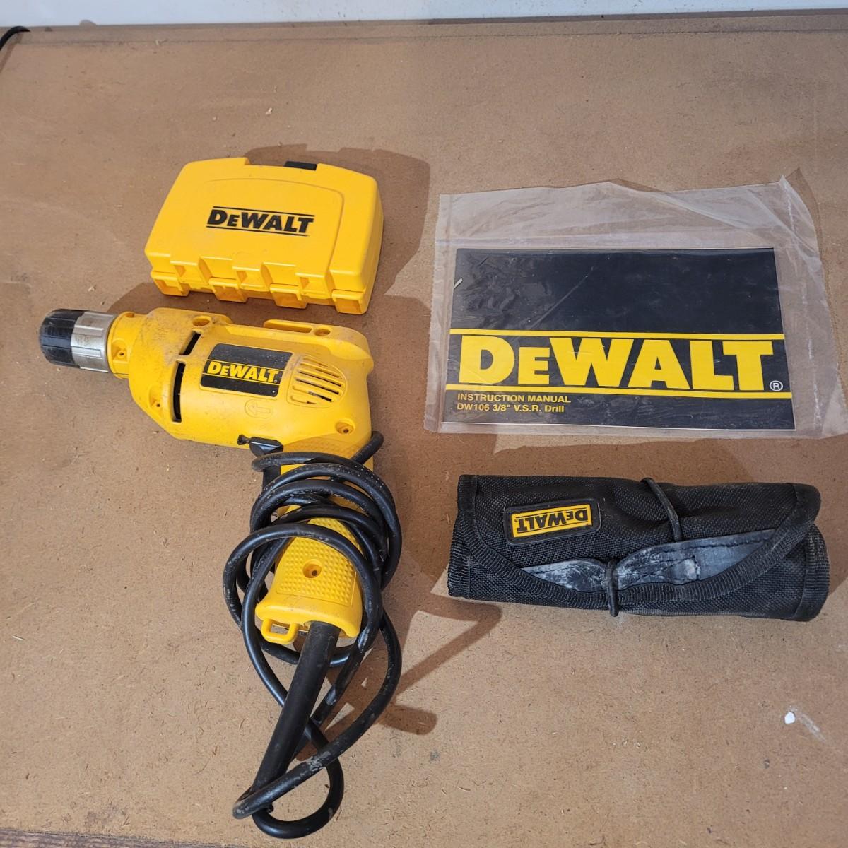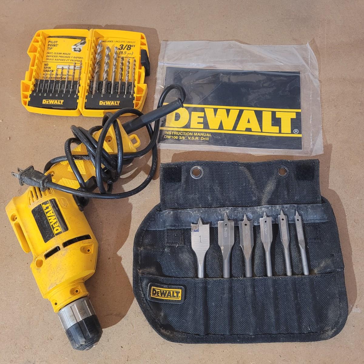Corded DeWalt brand power drill. Includes bore set with soft rollable carrying case. Also includes drill bit set with hard plastic case. Instruction manual included.