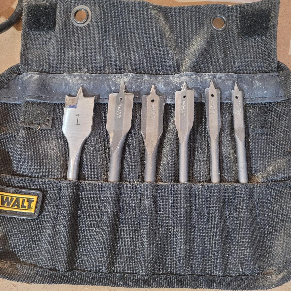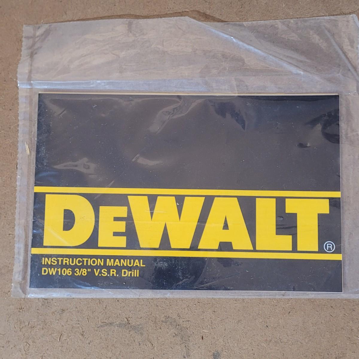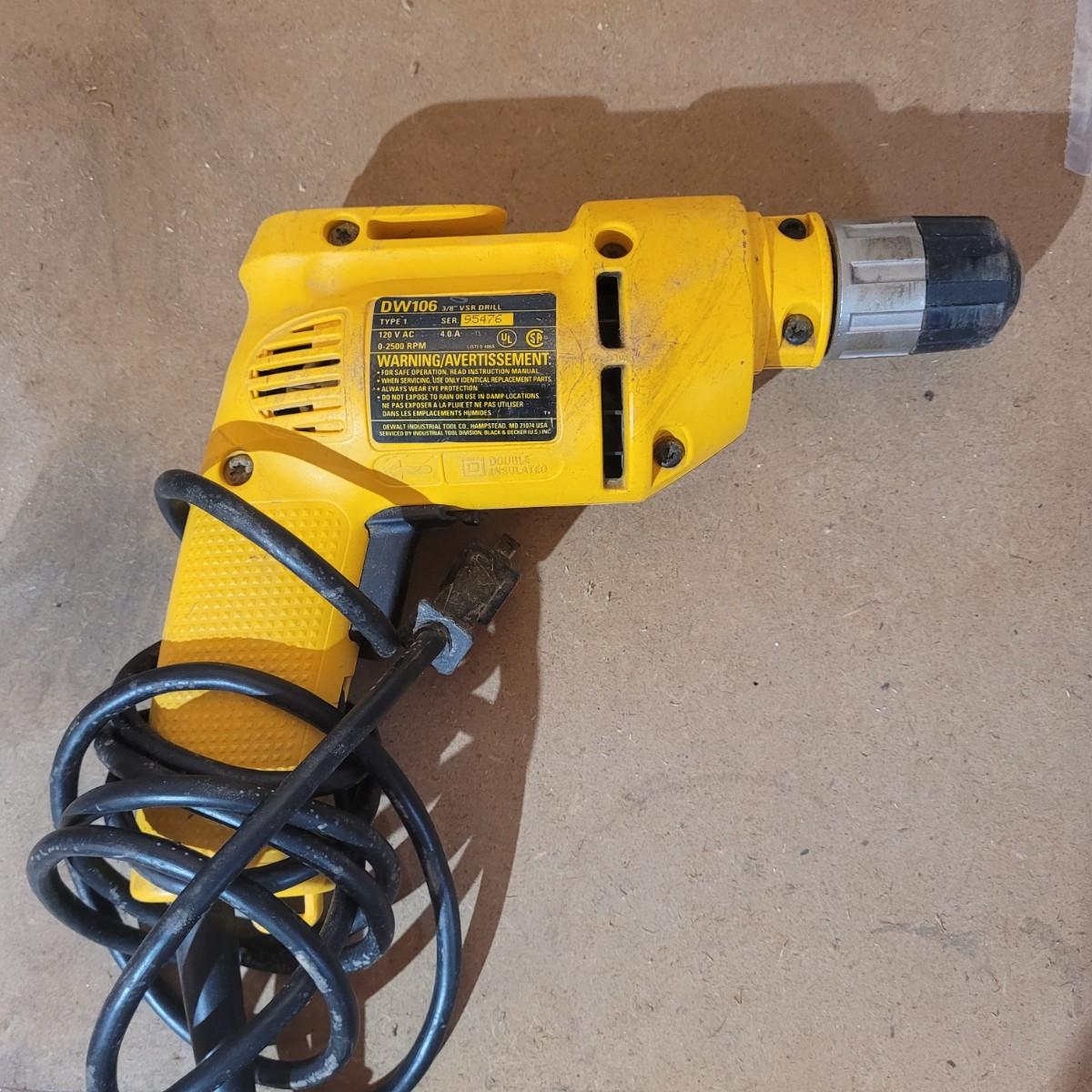 Corded DeWalt brand power drill. Includes bore set with soft rollable carrying case. Also includes drill bit set with hard plastic case. Instruction manual included.