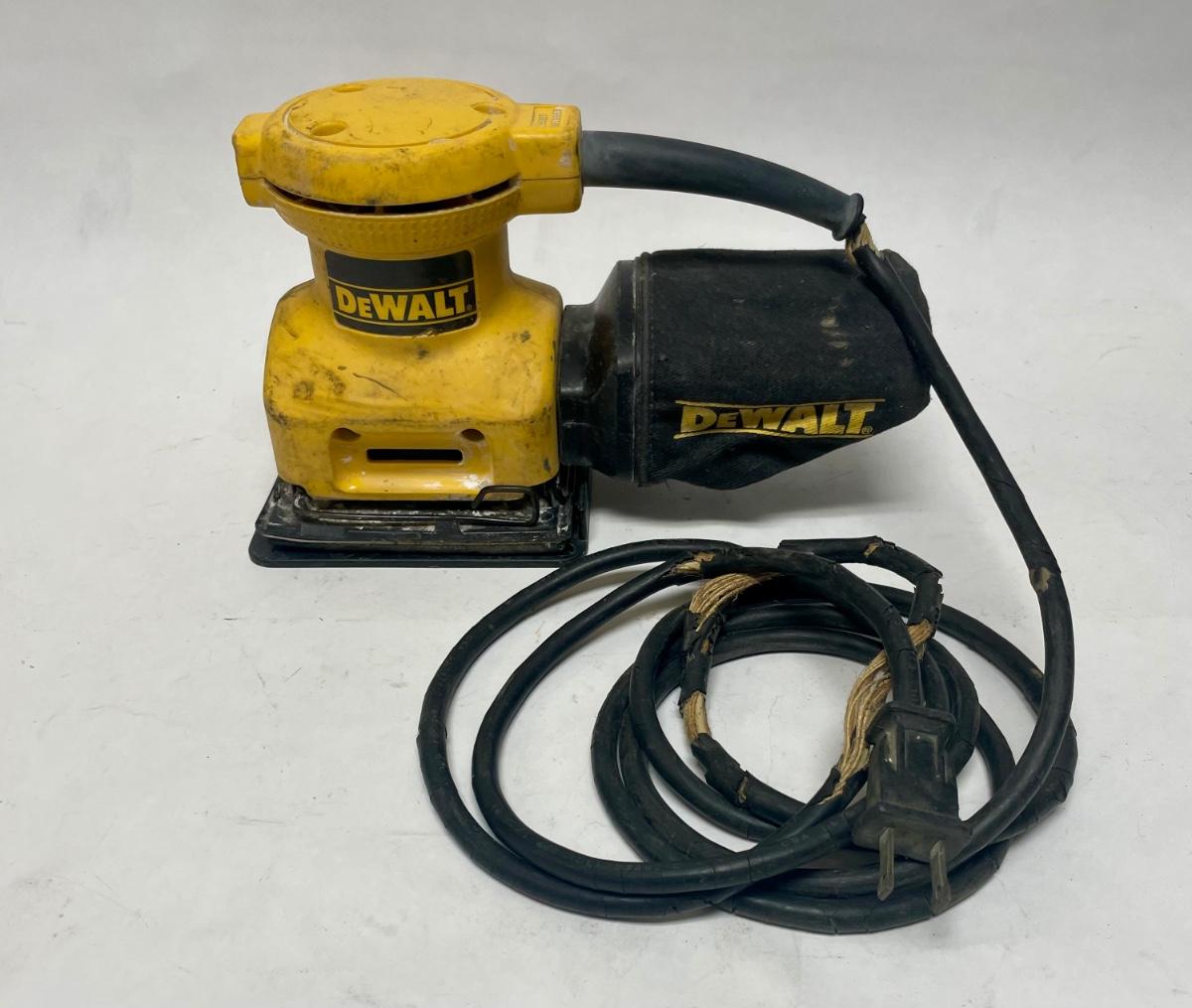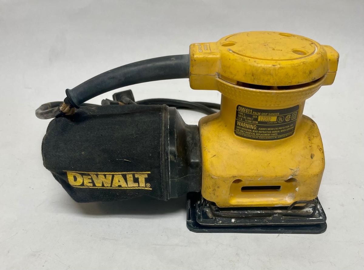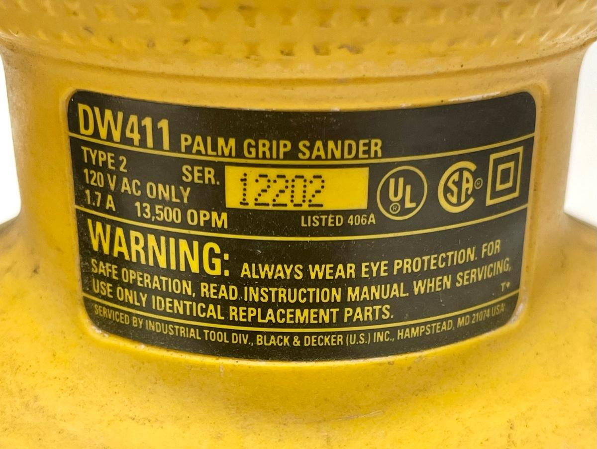 Model DW411. Tested, runs strong and quiet. Includes snap-on dust bag. Note that the cord has several frayed spots and needs repair/taping. With sandpaper hole puncher to enable the dust suction feature.