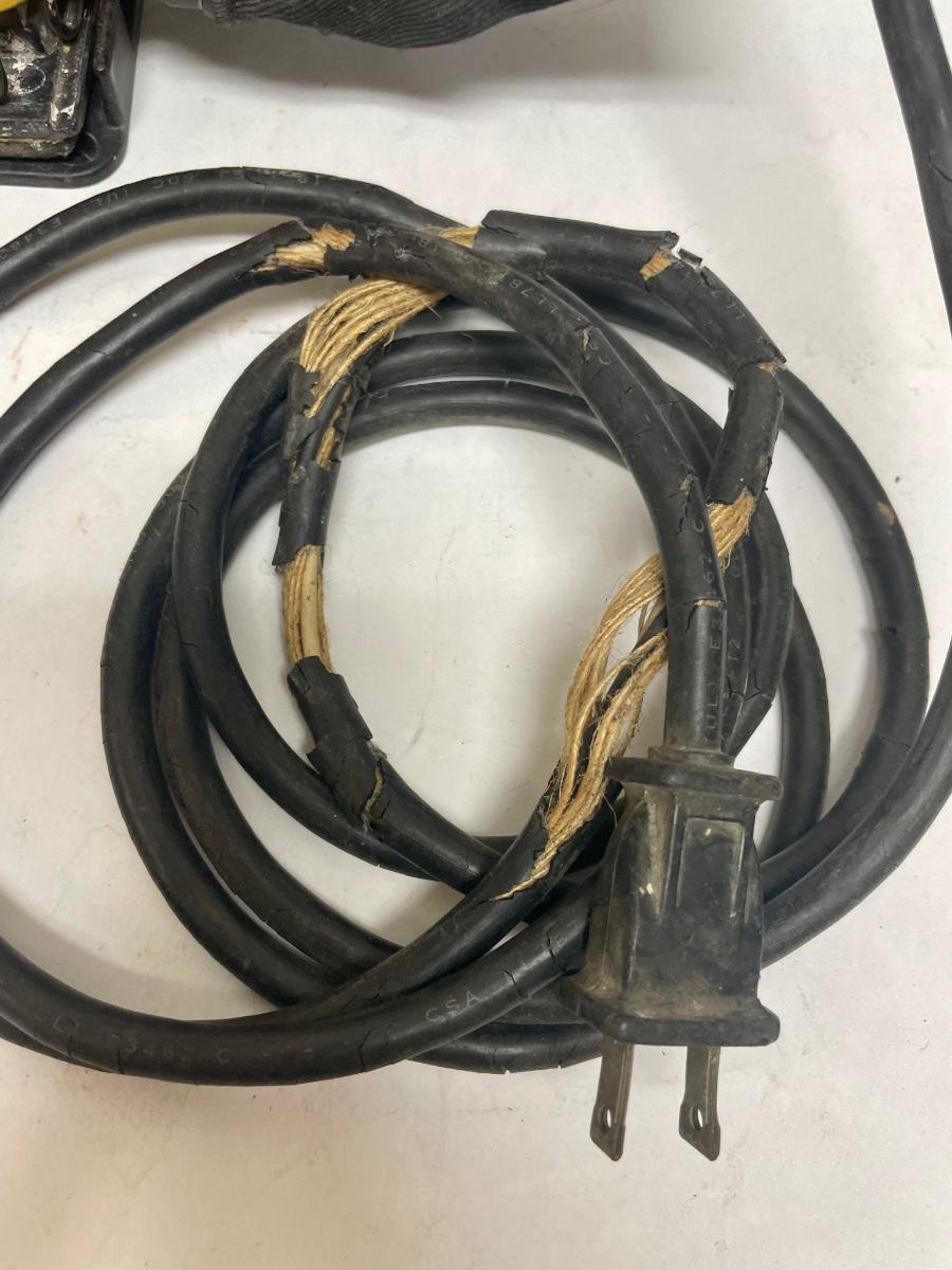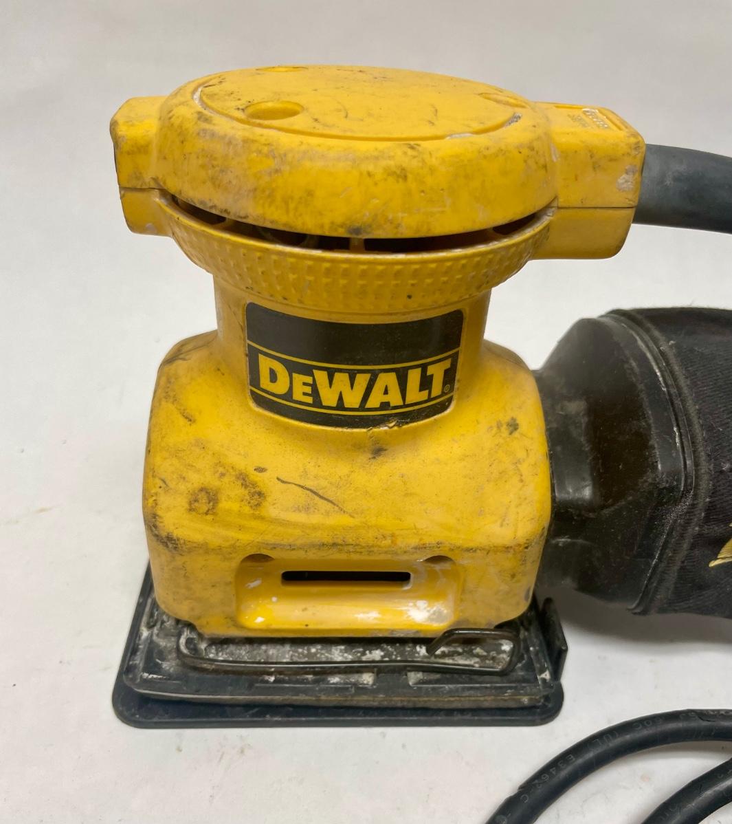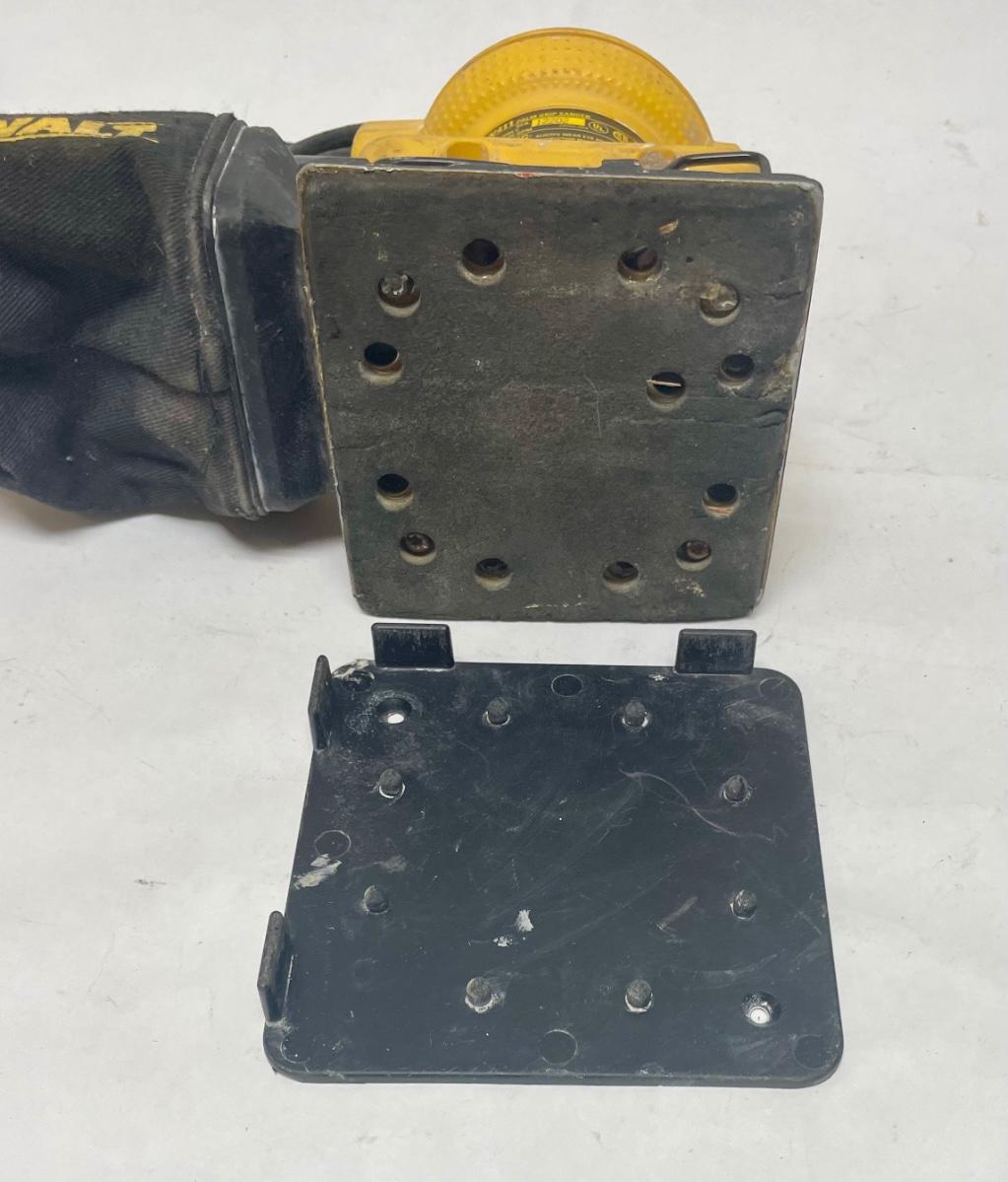 Model DW411. Tested, runs strong and quiet. Includes snap-on dust bag. Note that the cord has several frayed spots and needs repair/taping. With sandpaper hole puncher to enable the dust suction feature.
