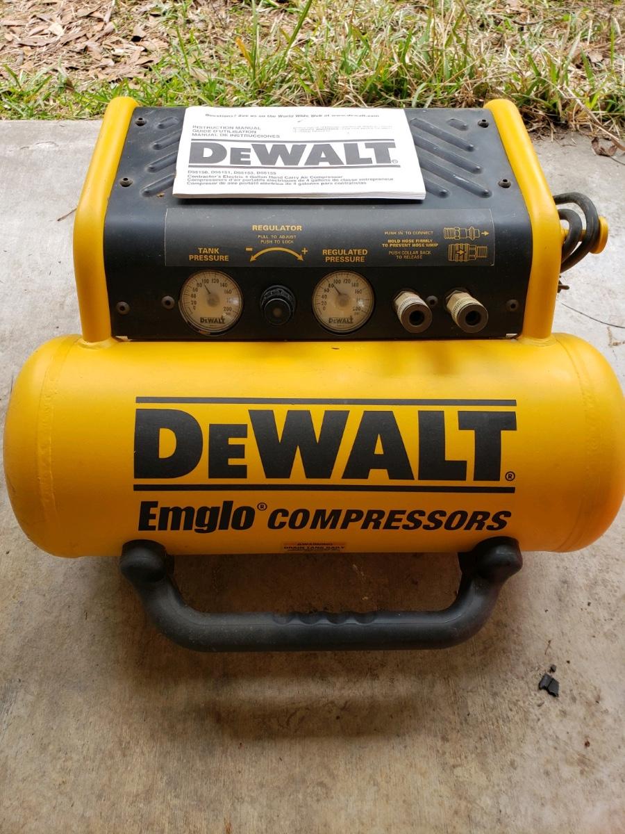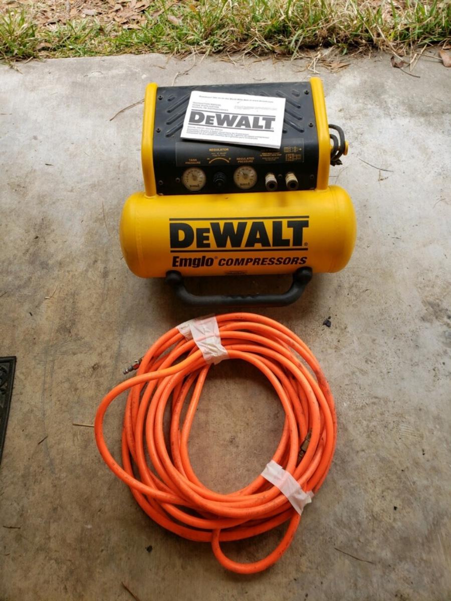 Dewalt Emglo compressor, like new! These retail close to $250.00. This one appears to have been used very little! Also includes compressor hose which is purchased separately at the store.